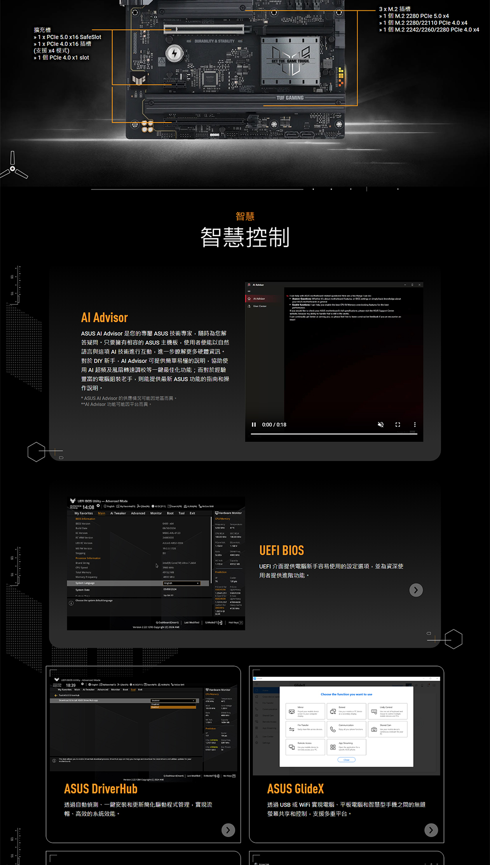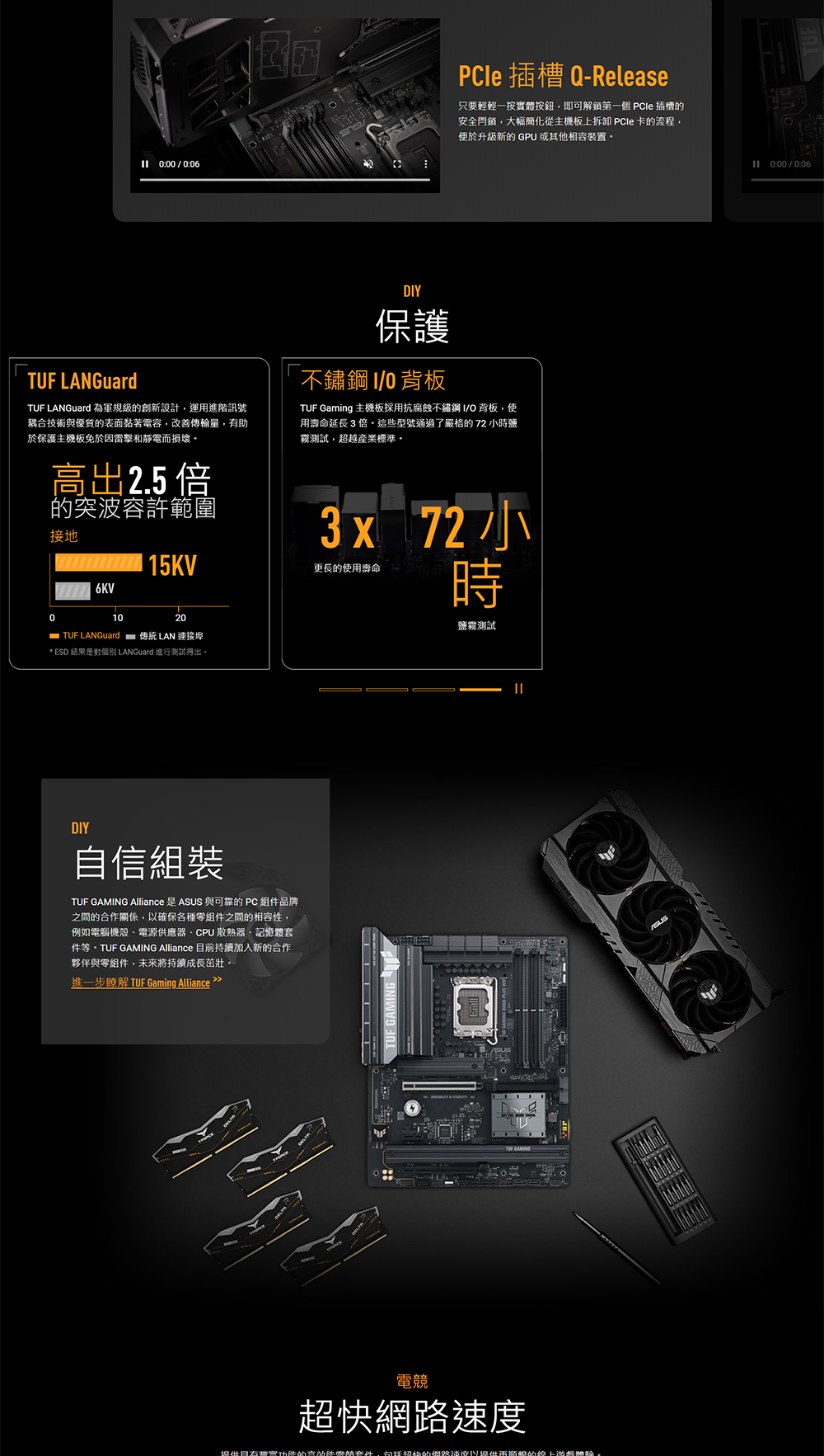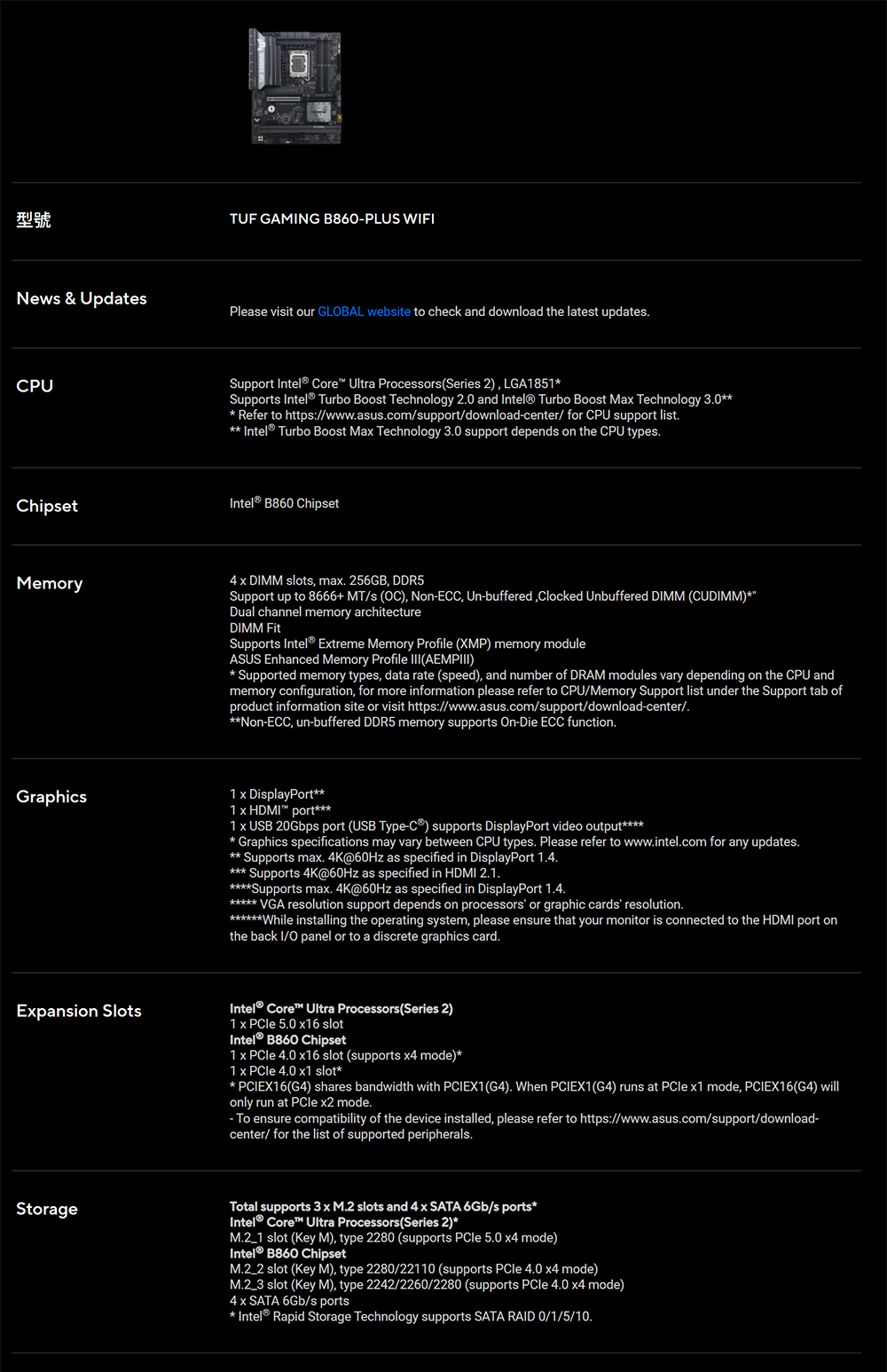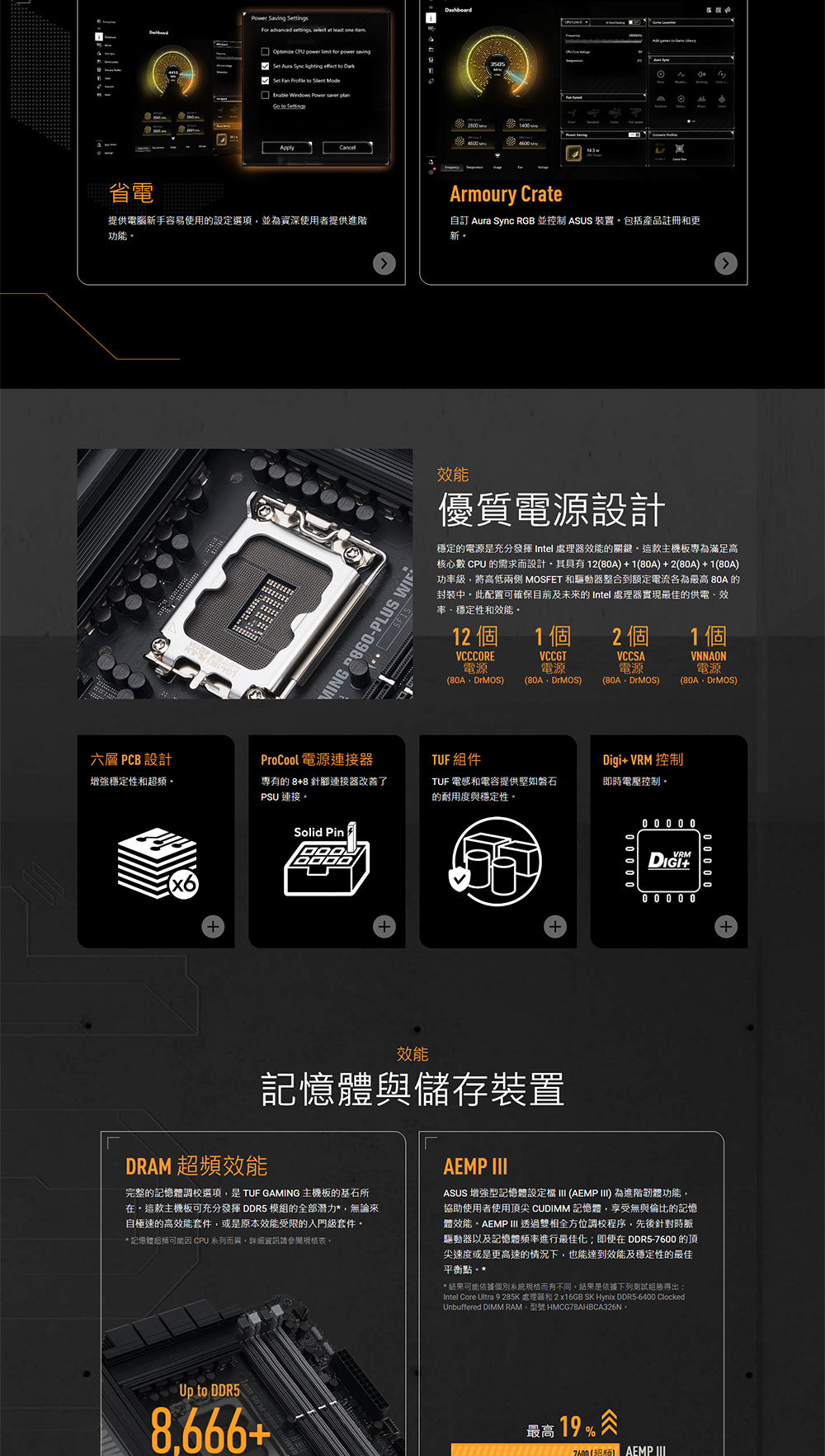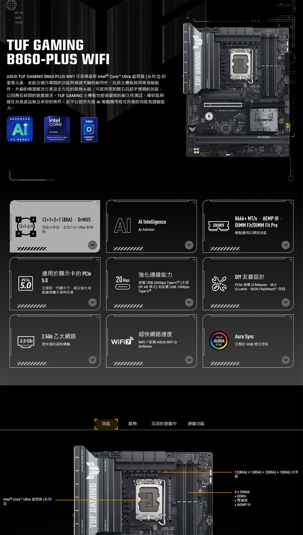 ASUS TUF GAMING B860-PLUS WIFI 可發揮最新 Intel® Core™ Ultra 處理器 (系列 2) 的重要元素,並結合適合電競的功能與通過考驗的耐用性。此款主機板採用軍規級組件、升級的電源解決方案及全方位的散熱系統,可提供堅如磐石且超乎預期的效能,以因應長時間的遊戲需求。TUF GAMING 主機板也經過嚴格的耐久性測試,確保能夠勝任其他產品無法承受的條件。此平台提供先進 AI 電腦應用程式所需的功能和連線能力。
