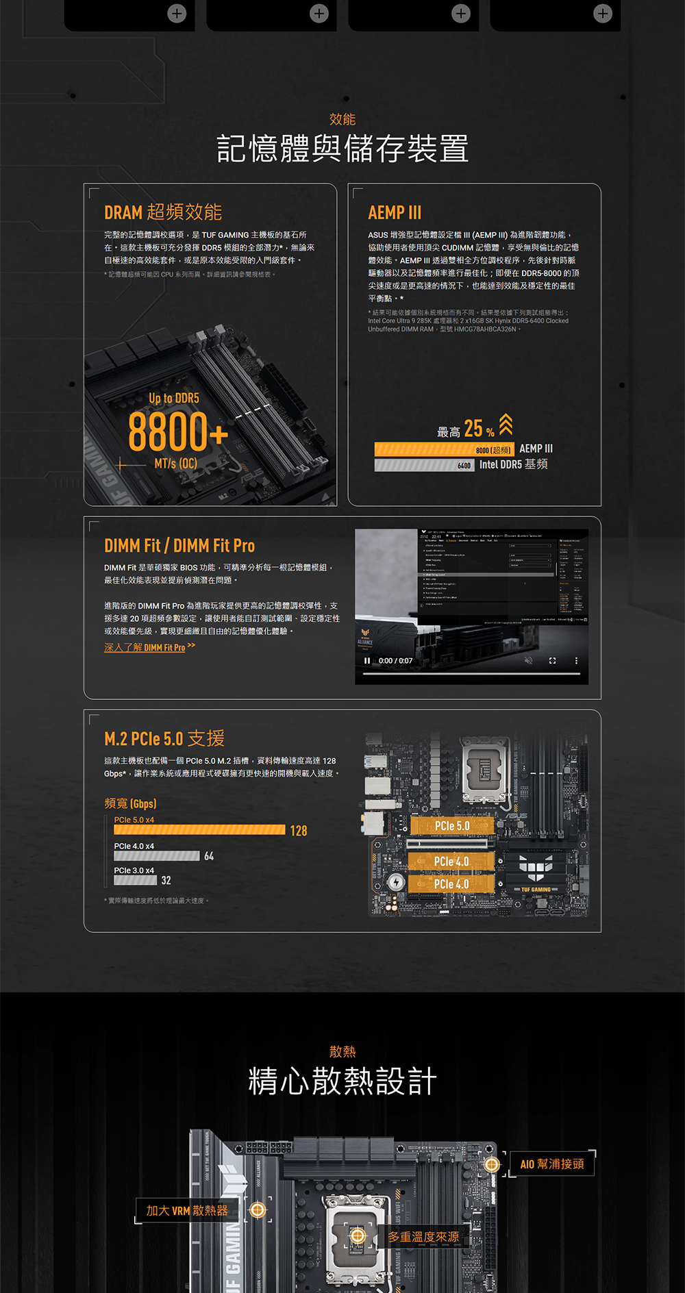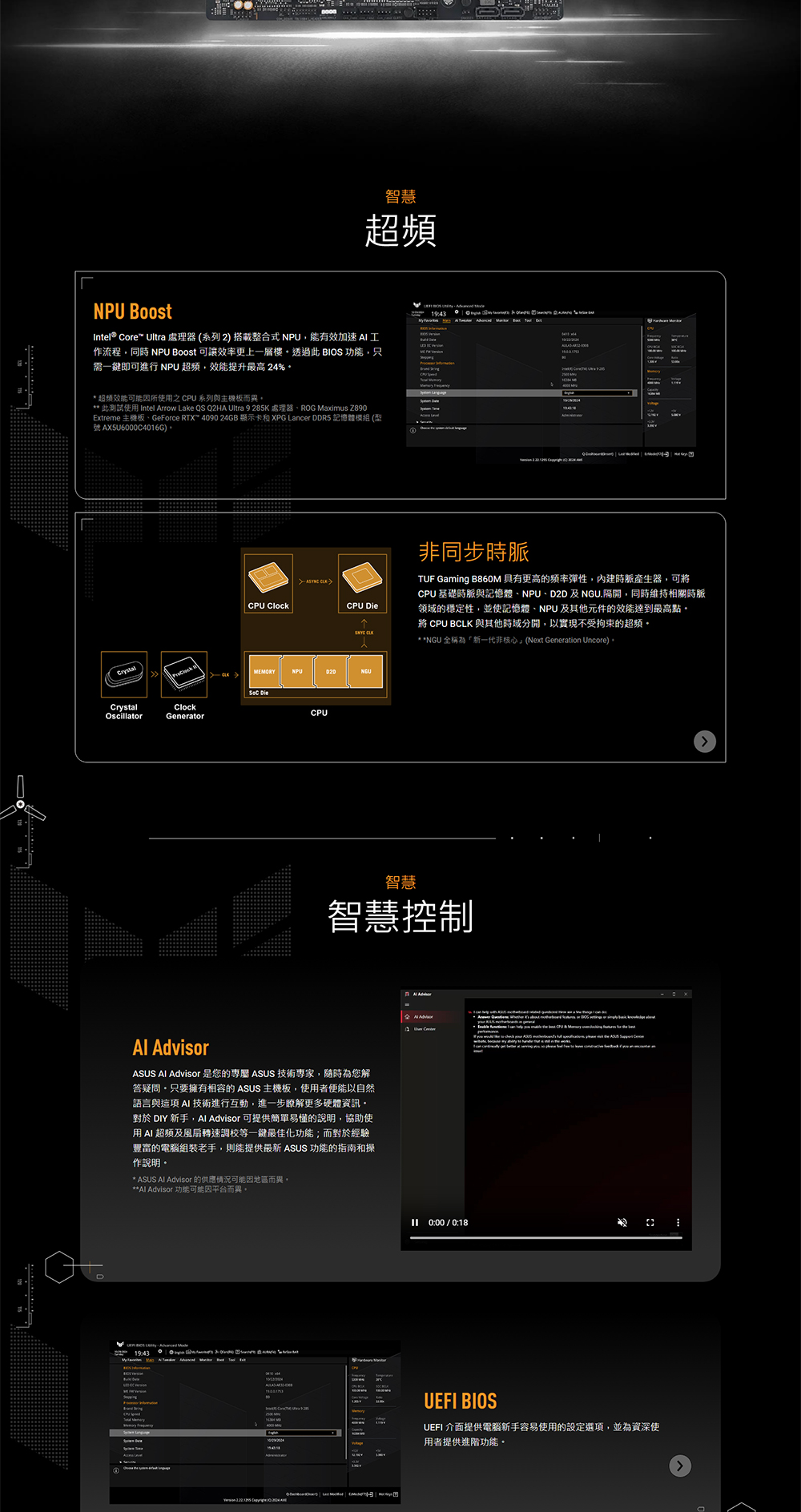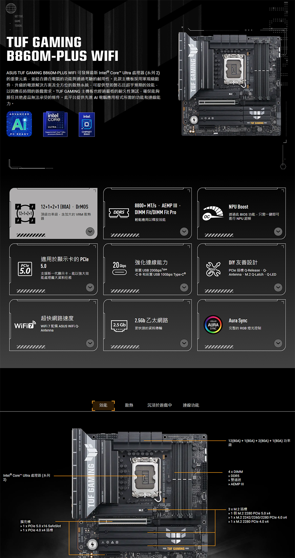 ASUS TUF GAMING B860M-PLUS WIFI 可發揮最新 Intel® Core™ Ultra 處理器 (系列 2) 的重要元素,並結合適合電競的功能與通過考驗的耐用性。此款主機板採用軍規級組件、升級的電源解決方案及全方位的散熱系統,可提供堅如磐石且超乎預期的效能,以因應長時間的遊戲需求。TUF GAMING 主機板也經過嚴格的耐久性測試,確保能夠勝任其他產品無法承受的條件。此平台提供先進 AI 電腦應用程式所需的功能和連線能力。