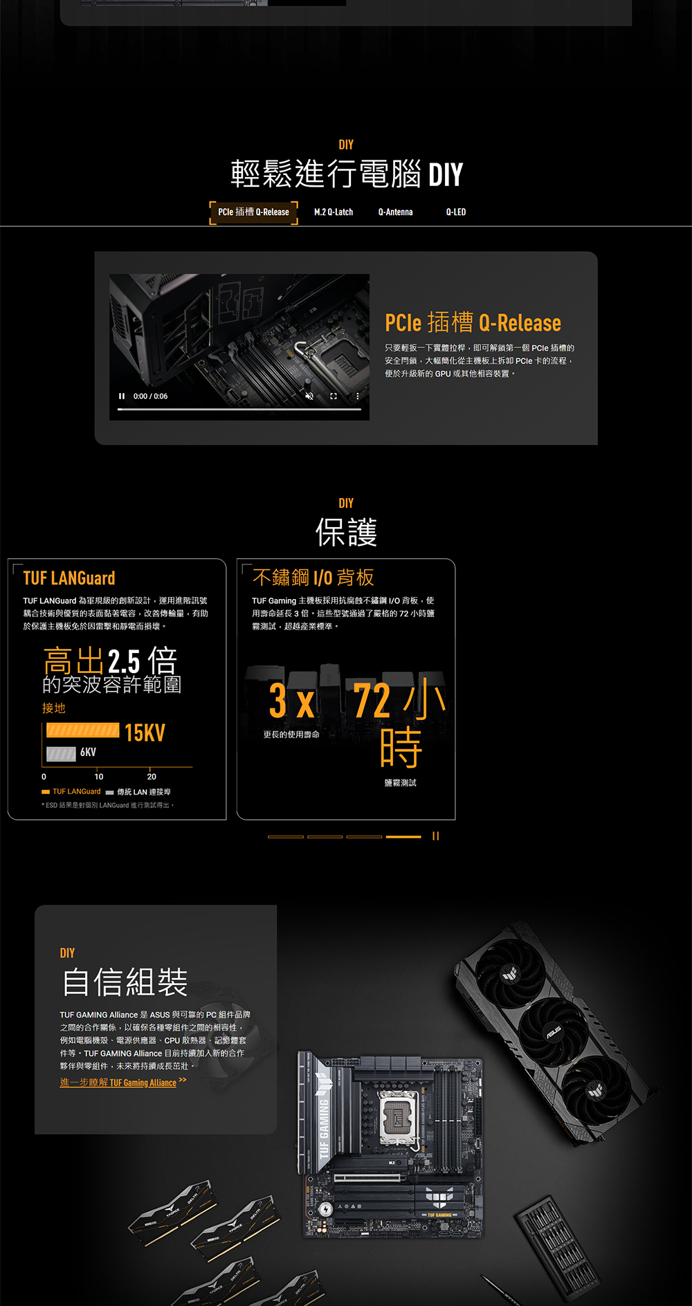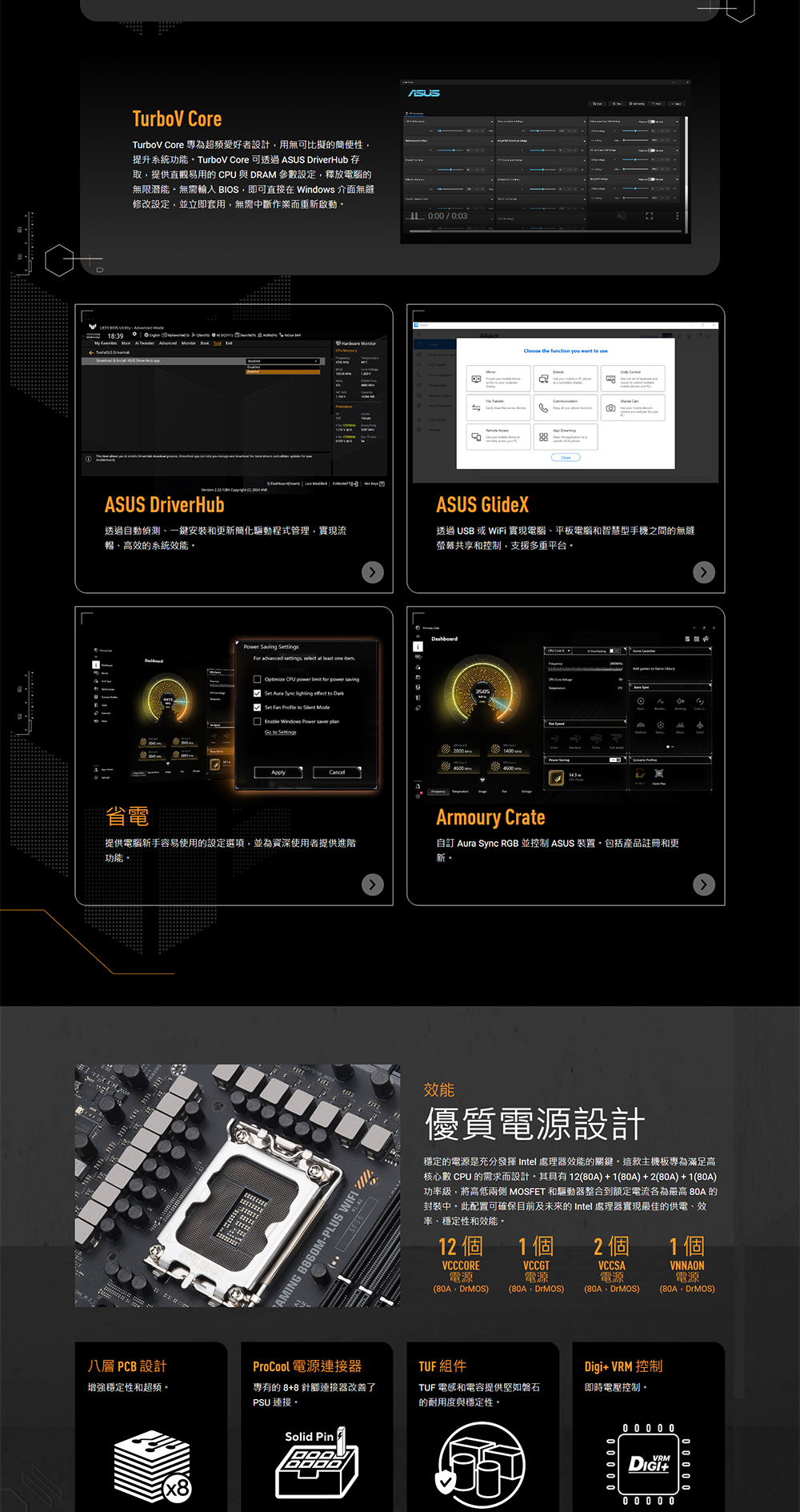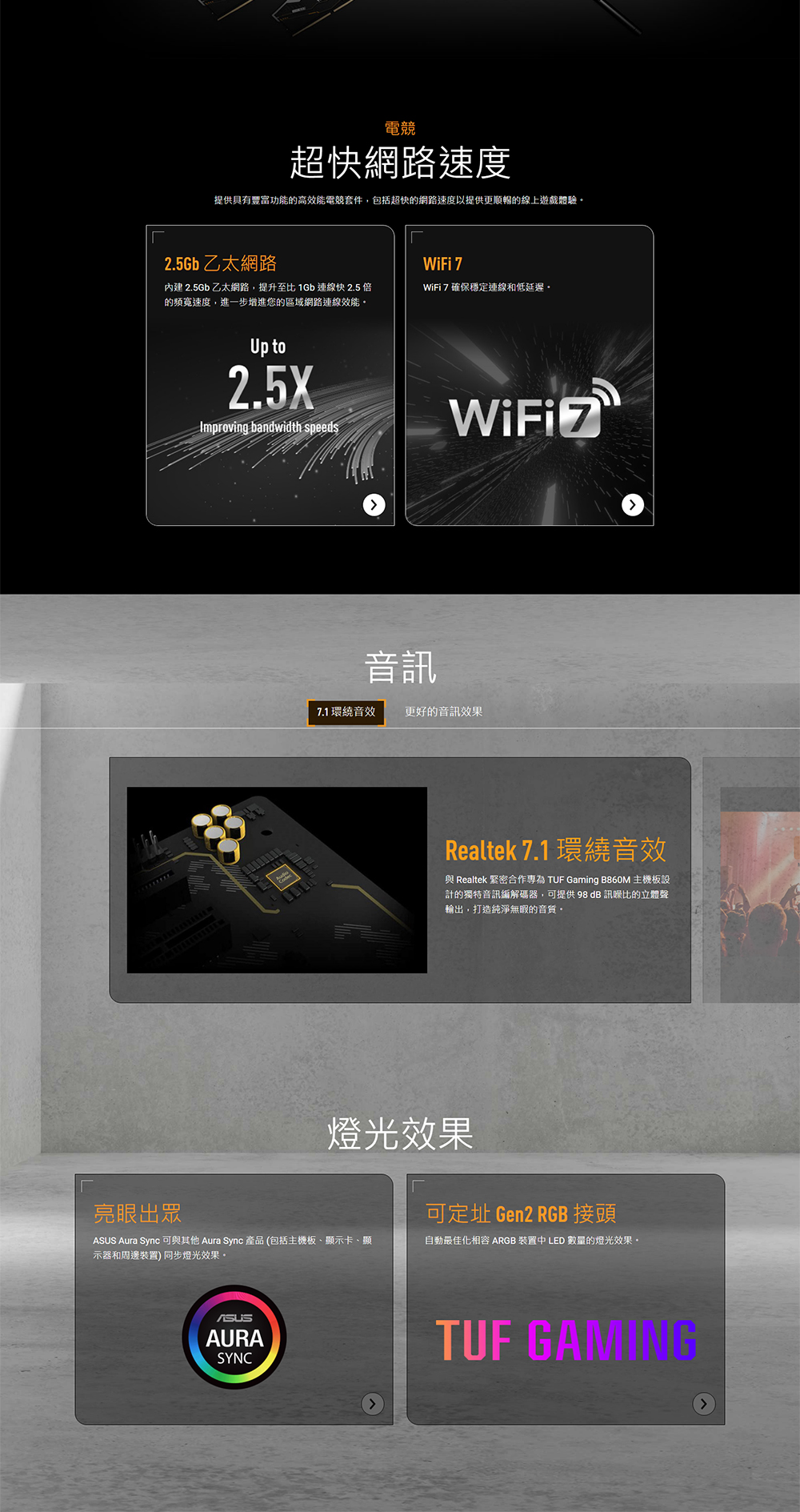 ASUS TUF GAMING B860M-PLUS WIFI 可發揮最新 Intel® Core™ Ultra 處理器 (系列 2) 的重要元素,並結合適合電競的功能與通過考驗的耐用性。此款主機板採用軍規級組件、升級的電源解決方案及全方位的散熱系統,可提供堅如磐石且超乎預期的效能,以因應長時間的遊戲需求。TUF GAMING 主機板也經過嚴格的耐久性測試,確保能夠勝任其他產品無法承受的條件。此平台提供先進 AI 電腦應用程式所需的功能和連線能力。