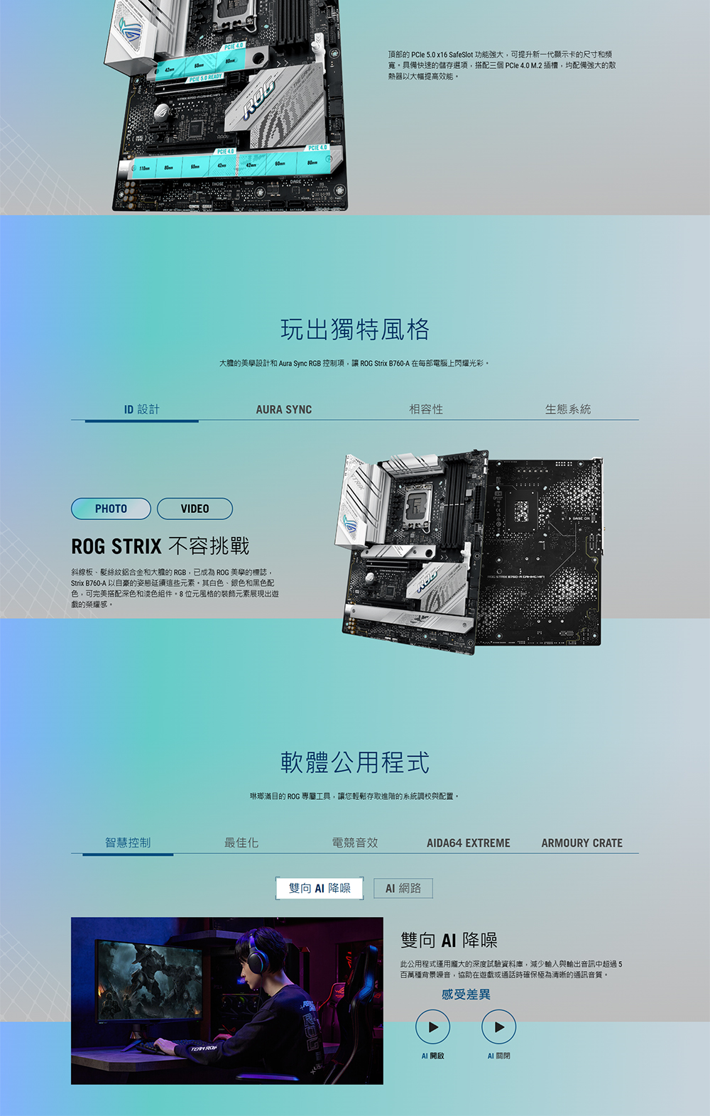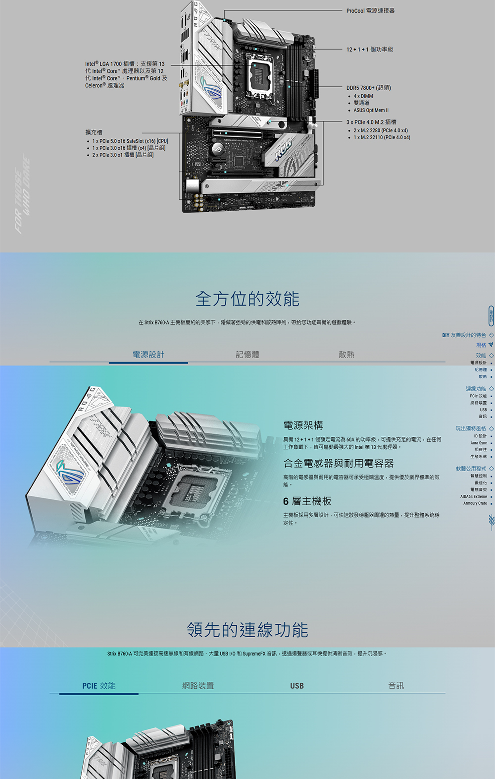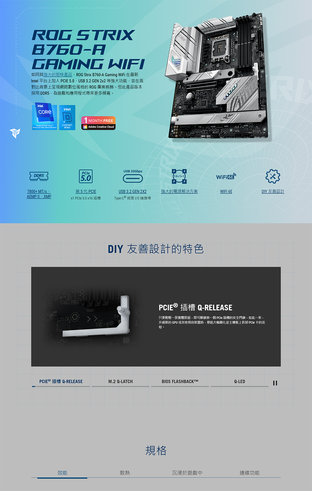 如同其強大的姐妹產品,ROG Strix B760-A Gaming WiFi 在最新 Intel 平台上加入 PCIE 5.0、USB 3.2 GEN 2x2 等強大功能,並在高對比背景上呈現網路數位風格的 ROG 圖案裝飾。但此產品版本採用 DDR5,為遊戲和應用程式帶來更多頻寬。