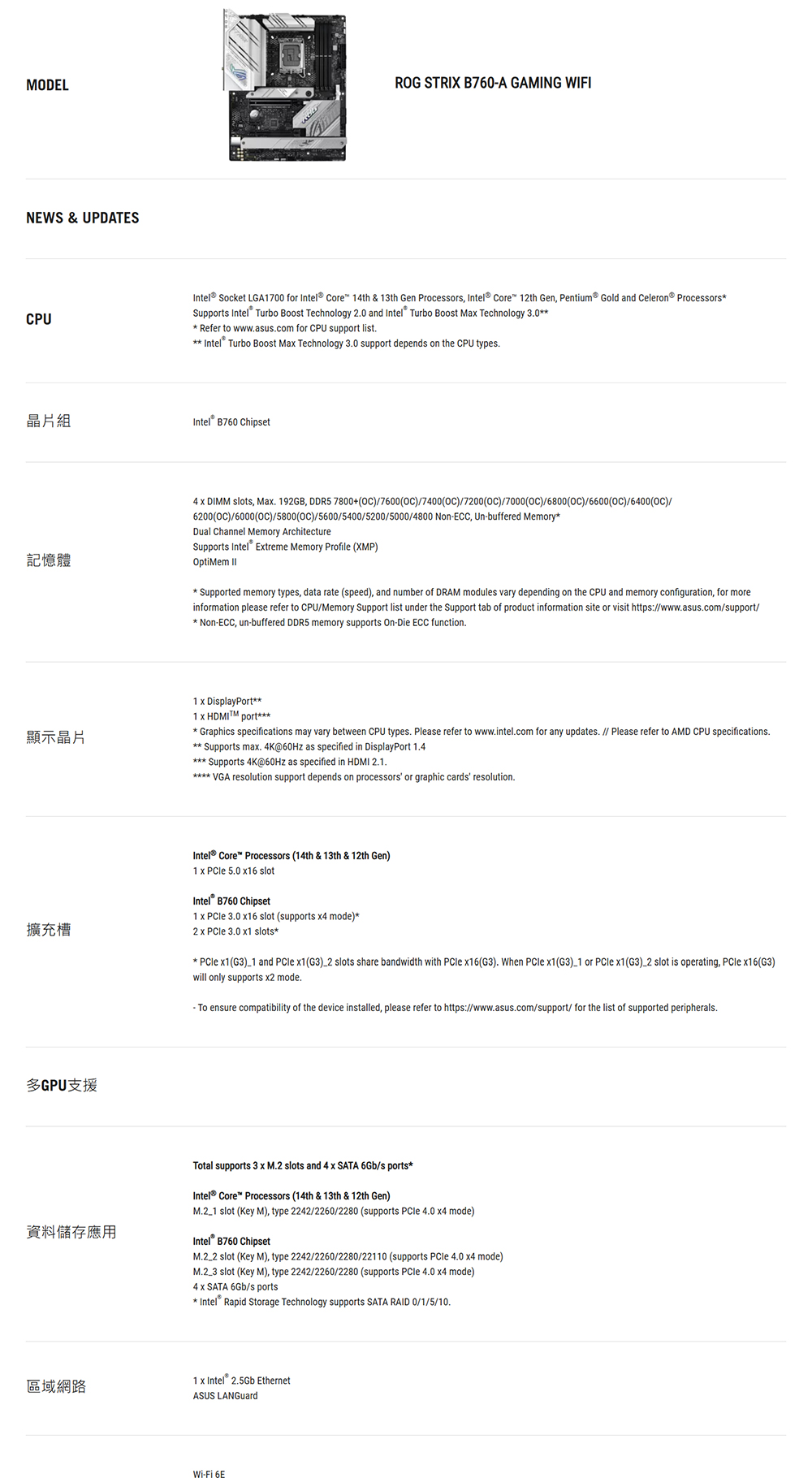 [ASUS華碩]《ROG STRIX B760-A GAMING WIFI》ATX/Intel 2.5Gb+無線/註五年