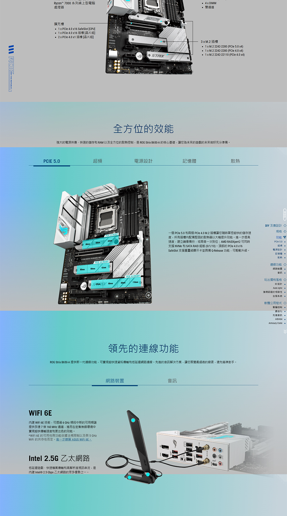 ROG Strix B650-A Gaming WiFi 在外觀新穎的包裝中配備強大的效能和散熱能力。專為處理最新 AMD Ryzen™ 7000 系列處理器而設計的強大電源供應,採用厚實的金屬散熱器進行散熱,與黑色 PCB 形成鮮明對比。PCIe 5.0 M.2 插槽、快速的 DDR5 記憶體支援以及最新的 WiFi 6E 網路能力,提供可滿足未來需求的豐富功能。