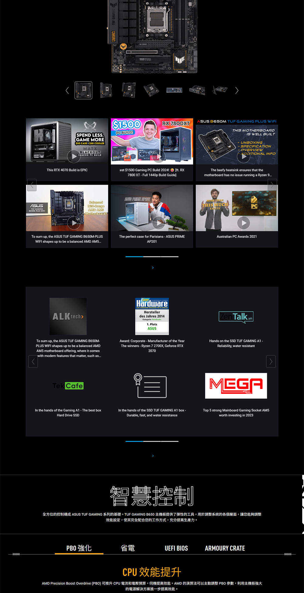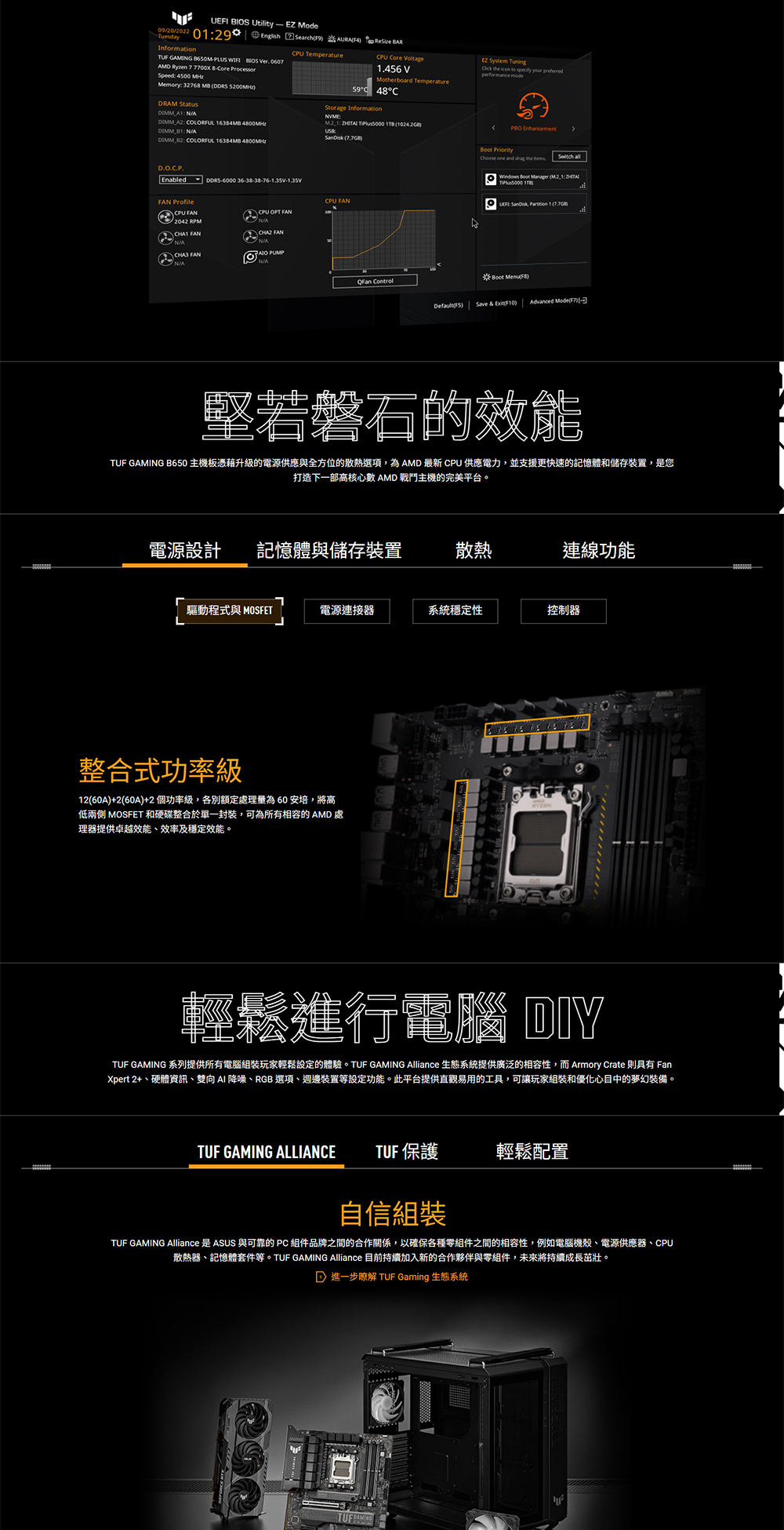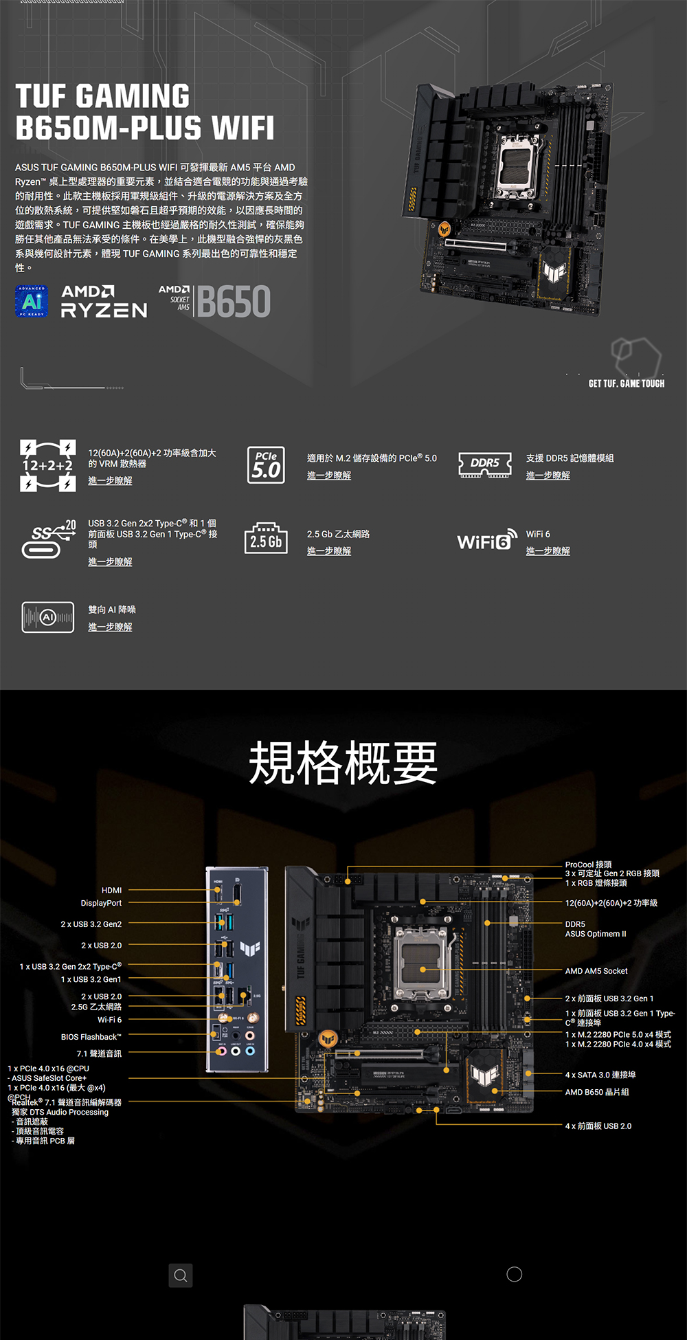 ASUS TUF GAMING B650M-PLUS WIFI 可發揮最新 AM5 平台 AMD Ryzen™ 桌上型處理器的重要元素,並結合適合電競的功能與通過考驗的耐用性。此款主機板採用軍規級組件、升級的電源解決方案及全方位的散熱系統,可提供堅如磐石且超乎預期的效能,以因應長時間的遊戲需求。TUF GAMING 主機板也經過嚴格的耐久性測試,確保能夠勝任其他產品無法承受的條件。在美學上,此機型融合強悍的灰黑色系與幾何設計元素,體現 TUF GAMING 系列最出色的可靠性和穩定性。