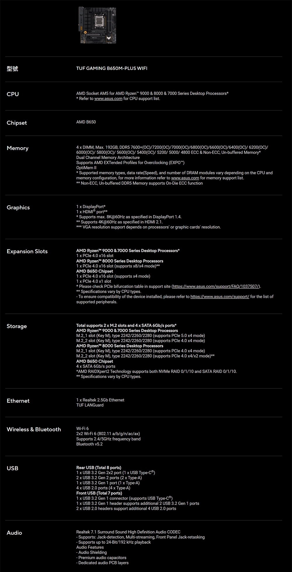 [ASUS華碩]《TUF-GAMING-B650M-PLUS-WIFI》M-ATX/Realtek 2.5G+無線/註五年