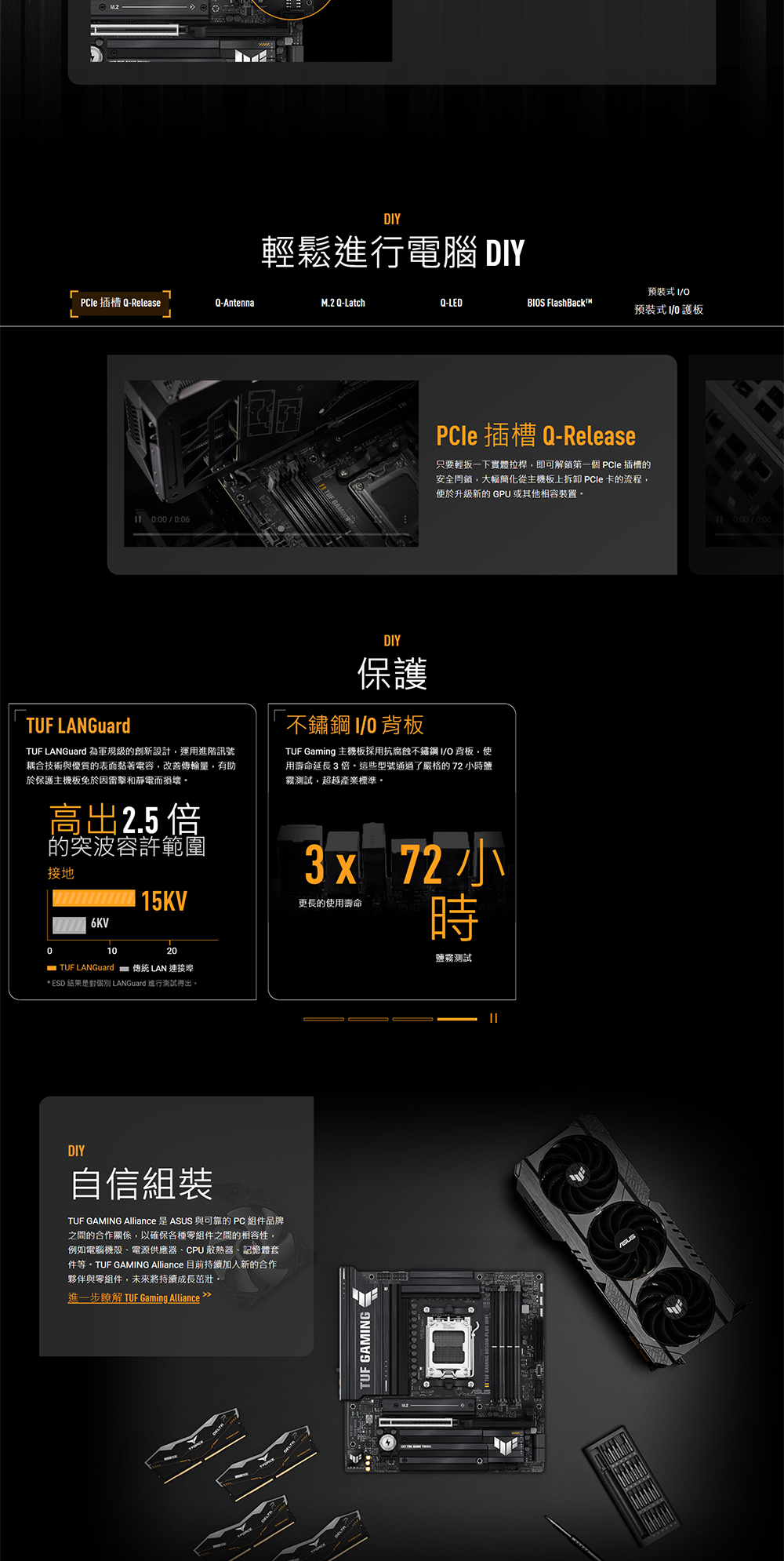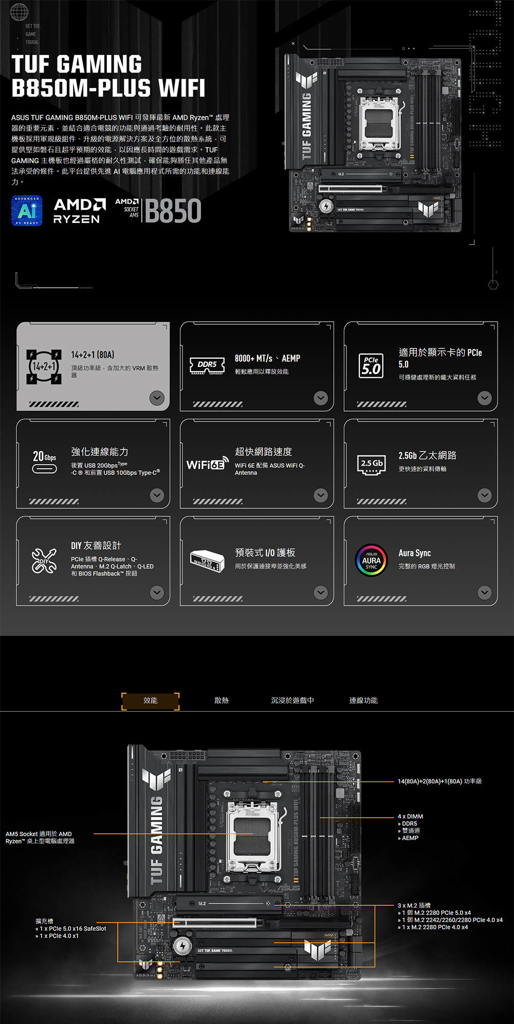 ASUS TUF GAMING B850M-PLUS WIFI 可發揮最新 AMD Ryzen™ 處理器的重要元素,並結合適合電競的功能與通過考驗的耐用性。此款主機板採用軍規級組件、升級的電源解決方案及全方位的散熱系統,可提供堅如磐石且超乎預期的效能,以因應長時間的遊戲需求。TUF GAMING 主機板也經過嚴格的耐久性測試,確保能夠勝任其他產品無法承受的條件。此平台提供先進 AI 電腦應用程式所需的功能和連線能力。