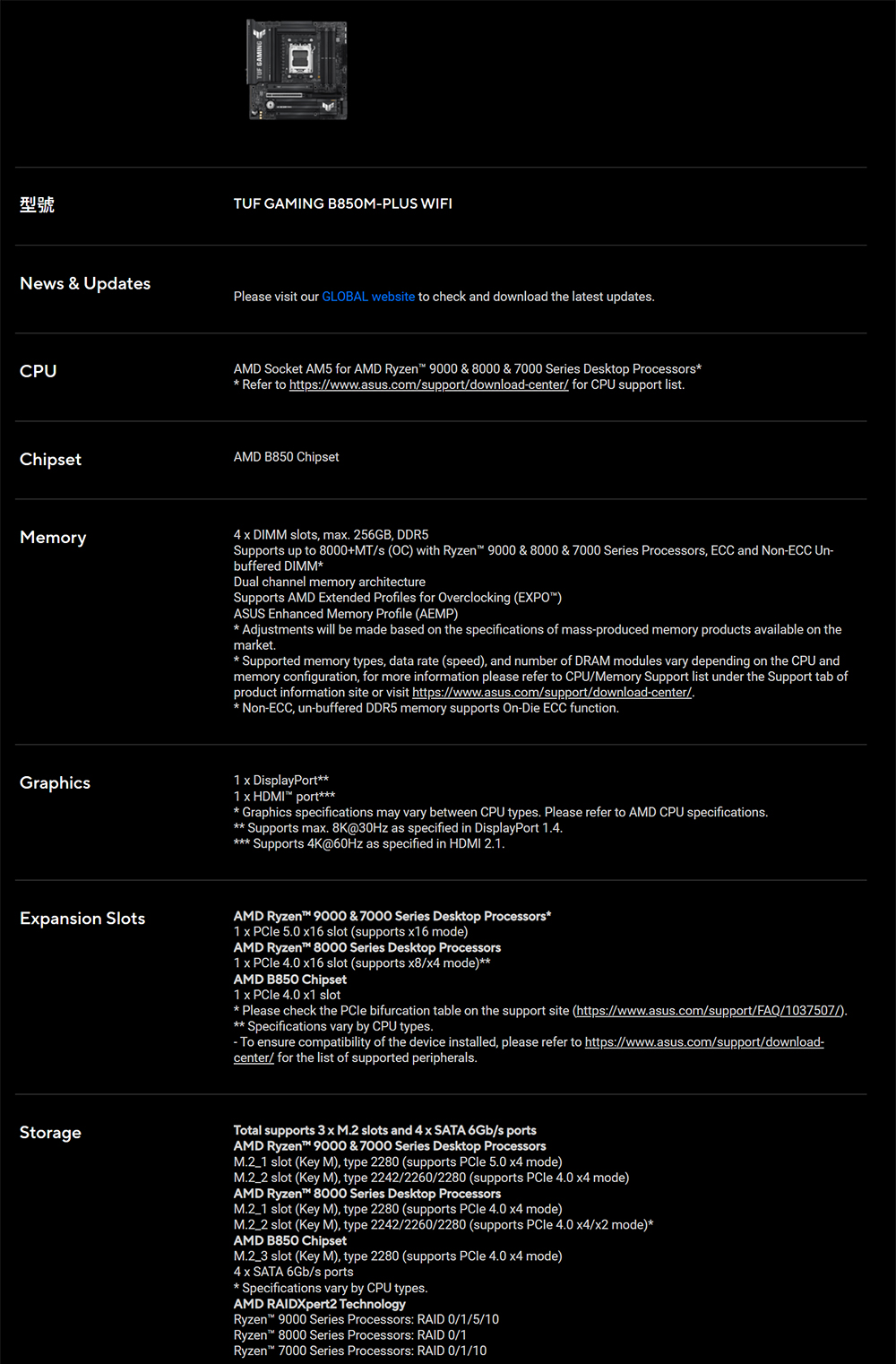 [ASUS華碩]《TUF-GAMING-B850M-PLUS WIFI》M-ATX/Realtek2.5G+無線/註五年
