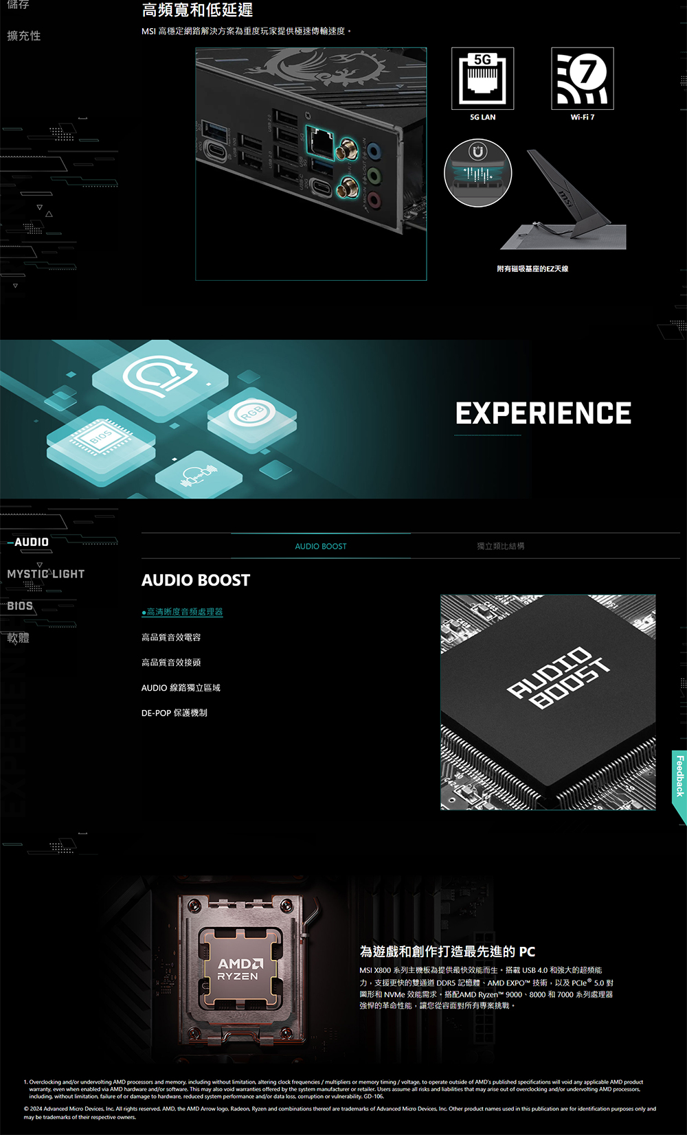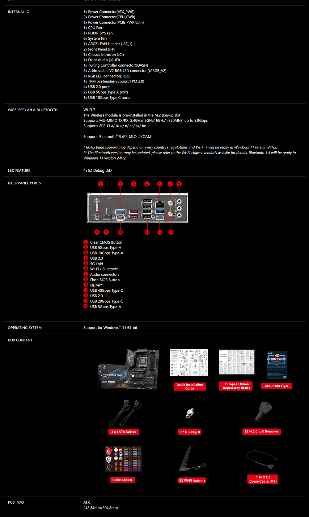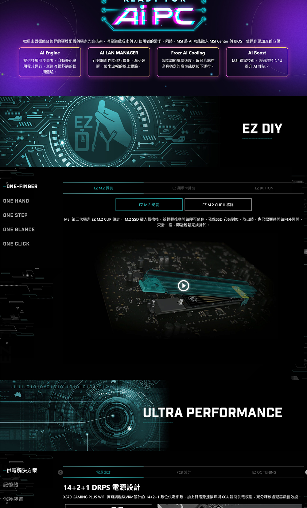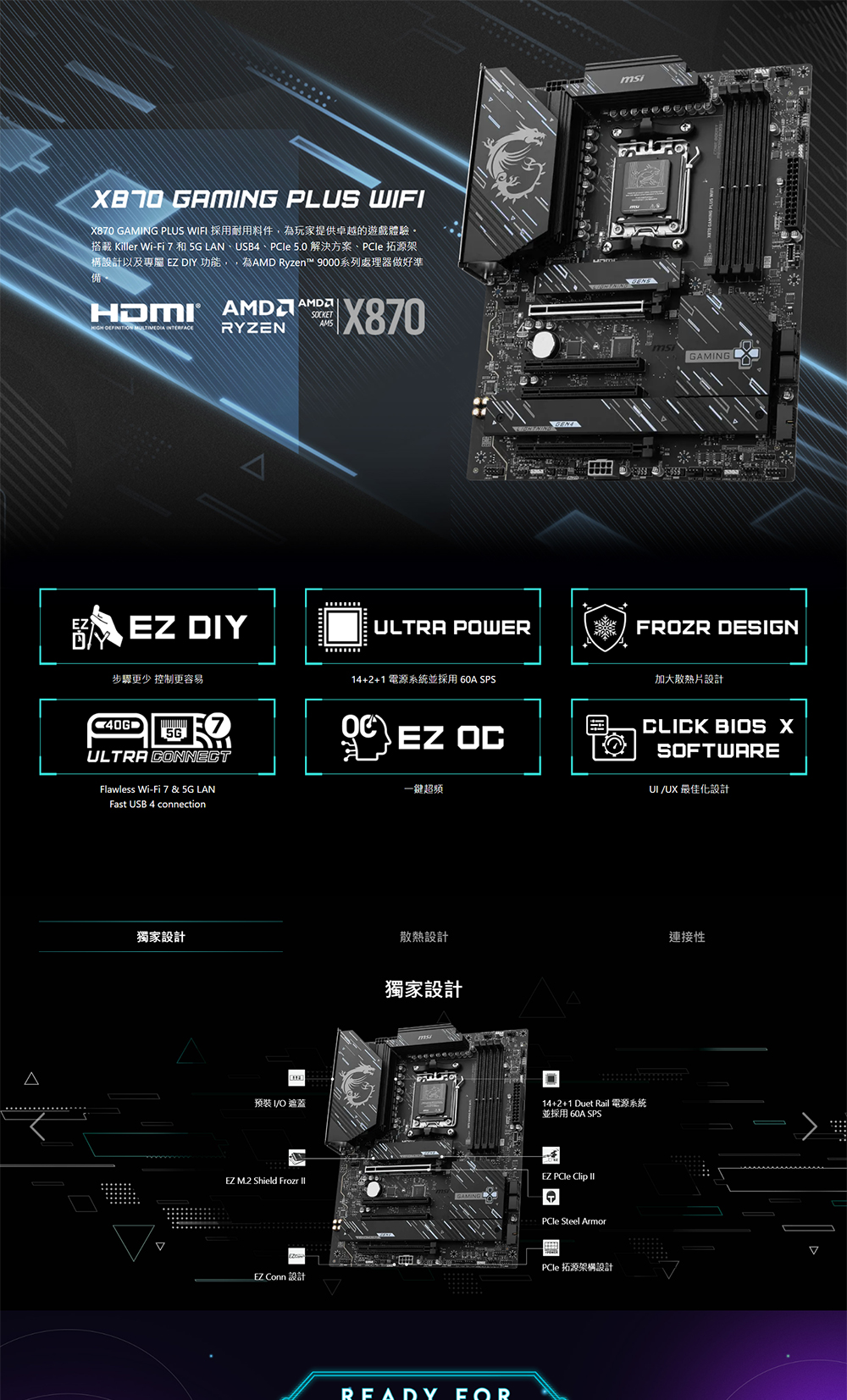 X870 GAMING PLUS WIFI 採用耐用料件,為玩家提供卓越的遊戲體驗。搭載 Killer Wi-Fi 7 和 5G LAN、USB4、PCIe 5.0 解決方案、PCIe 拓源架構設計以及專屬 EZ DIY 功能,,為AMD Ryzen™ 9000系列處理器做好準備。