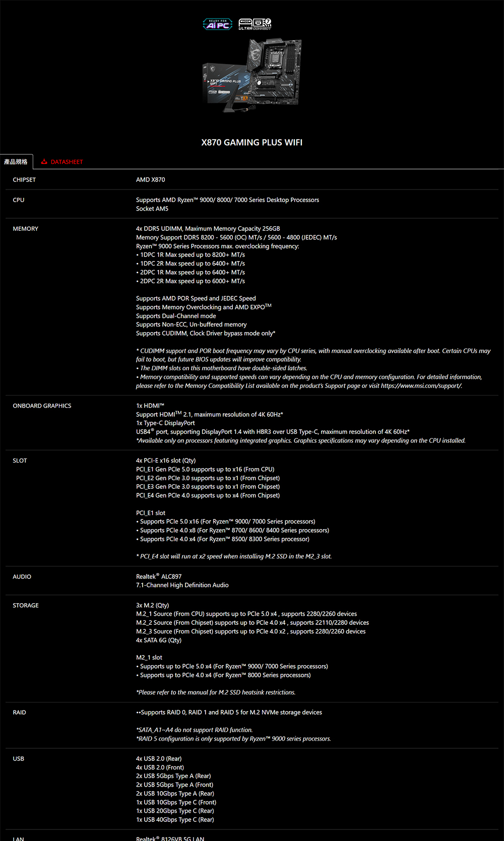[MSI 微星]《X870-GAMING-PLUS-WIFI》ATX/Realtek 5G+Wi-Fi 7/註五年