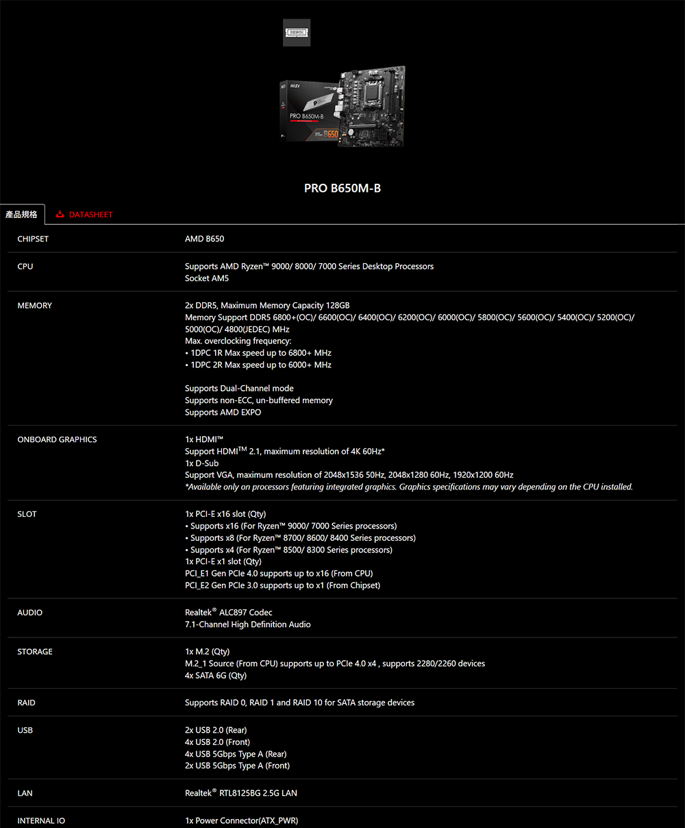 [MSI 微星]《PRO-B650M-B》M-ATX/Realtek 2.5G/註四年