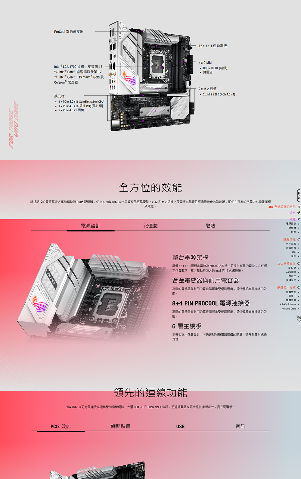 表現出色的中尺寸產品:ROG Strix B760-G Gaming 是單色的強大主機板,隨時準備驅動您的下一台 mATX 電腦。它具備與其可信任同類產品相同的高頻寬連線功能,但閃電般快速的 DDR5 記憶體和強大的功率級使其與眾不同,以搭配高速的 Intel 第 13 代處理器。白色和銀色元素與 ASUS AP201 完美搭配,而復古風圖案則賦予其經典 Strix 風格。