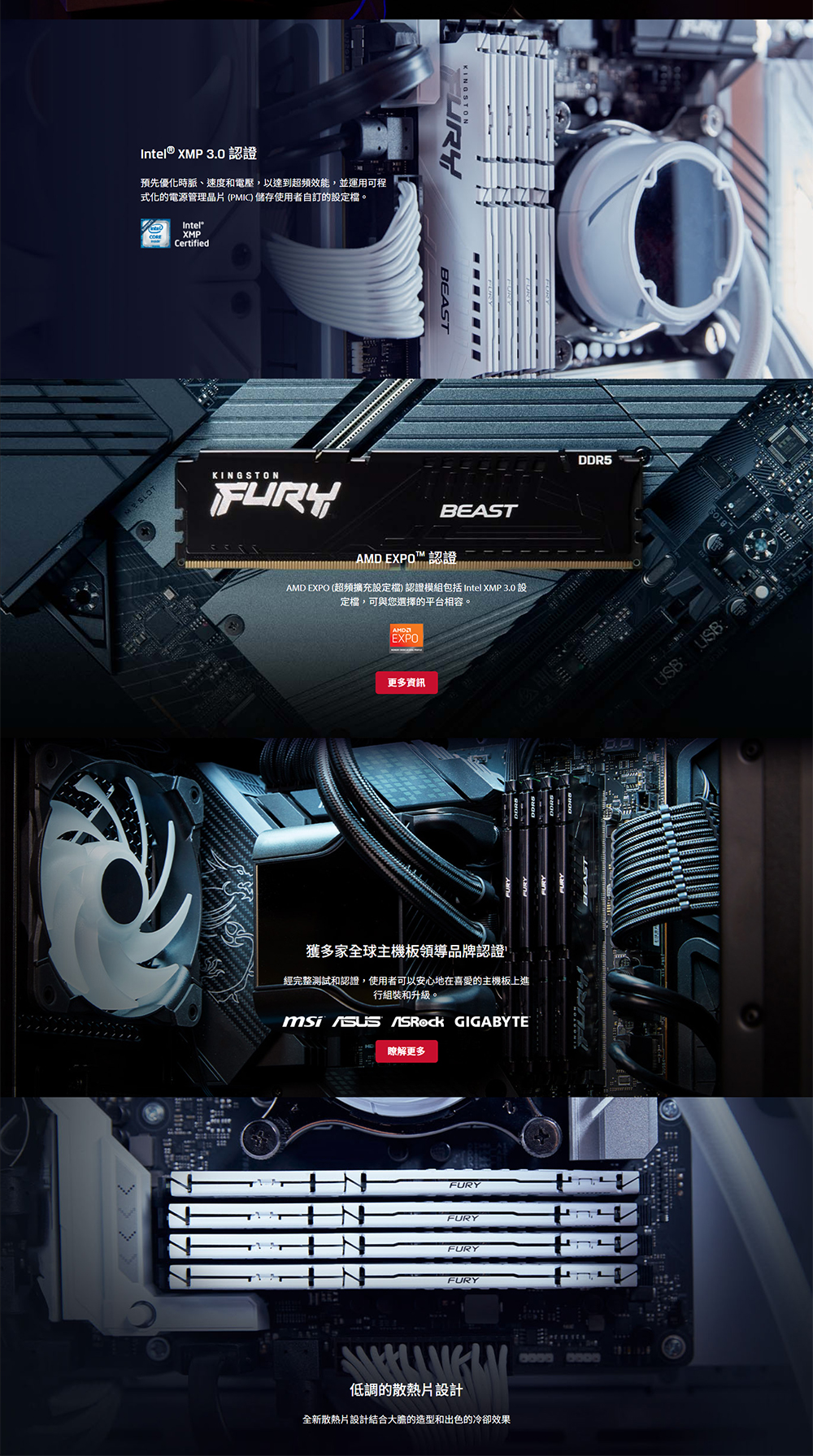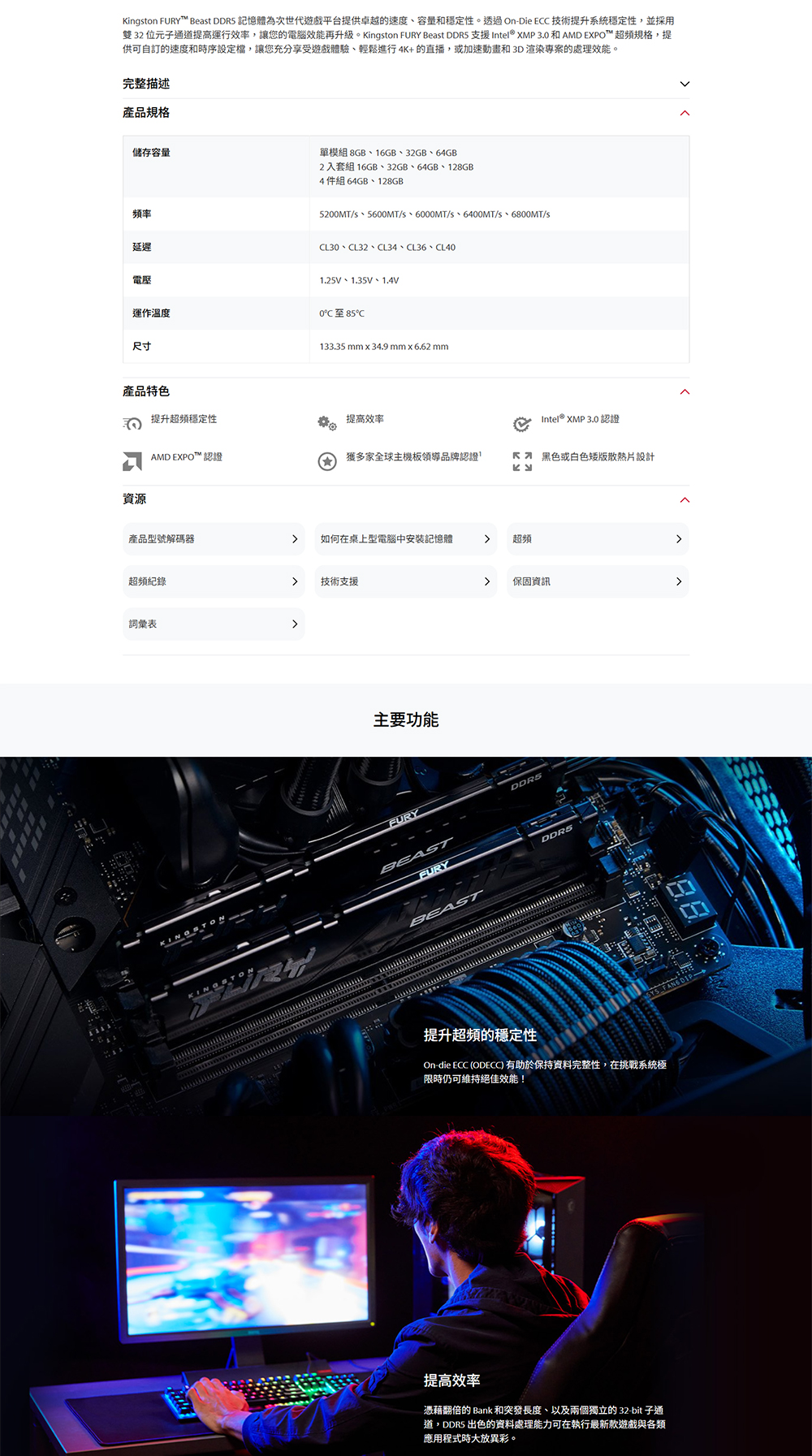 Kingston FURY™ Beast DDR5 記憶體為次世代遊戲平台提供卓越的速度、容量和穩定性。透過 On-Die ECC 技術提升系統穩定性,並採用雙 32 位元子通道提高運行效率,讓您的電腦效能再升級。Kingston FURY Beast DDR5 支援 Intel® XMP 3.0 和 AMD EXPO™ 超頻規格,提供可自訂的速度和時序設定檔,讓您充分享受遊戲體驗、輕鬆進行 4K+ 的直播,或加速動畫和 3D 渲染專案的處理效能。