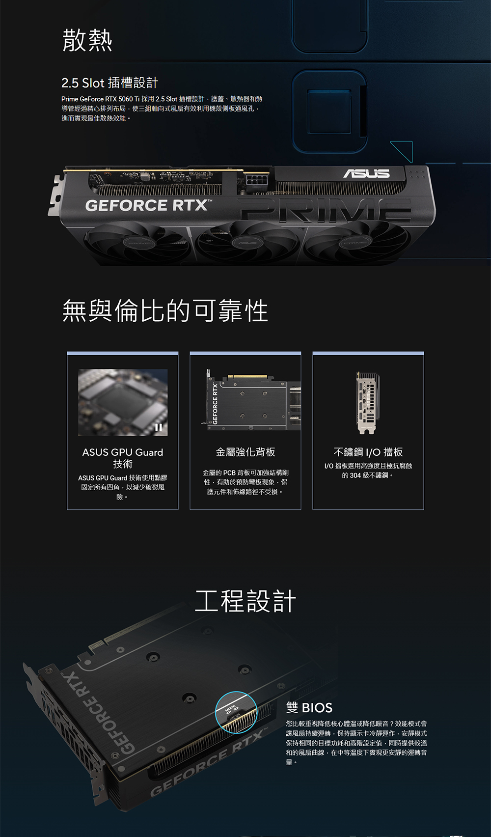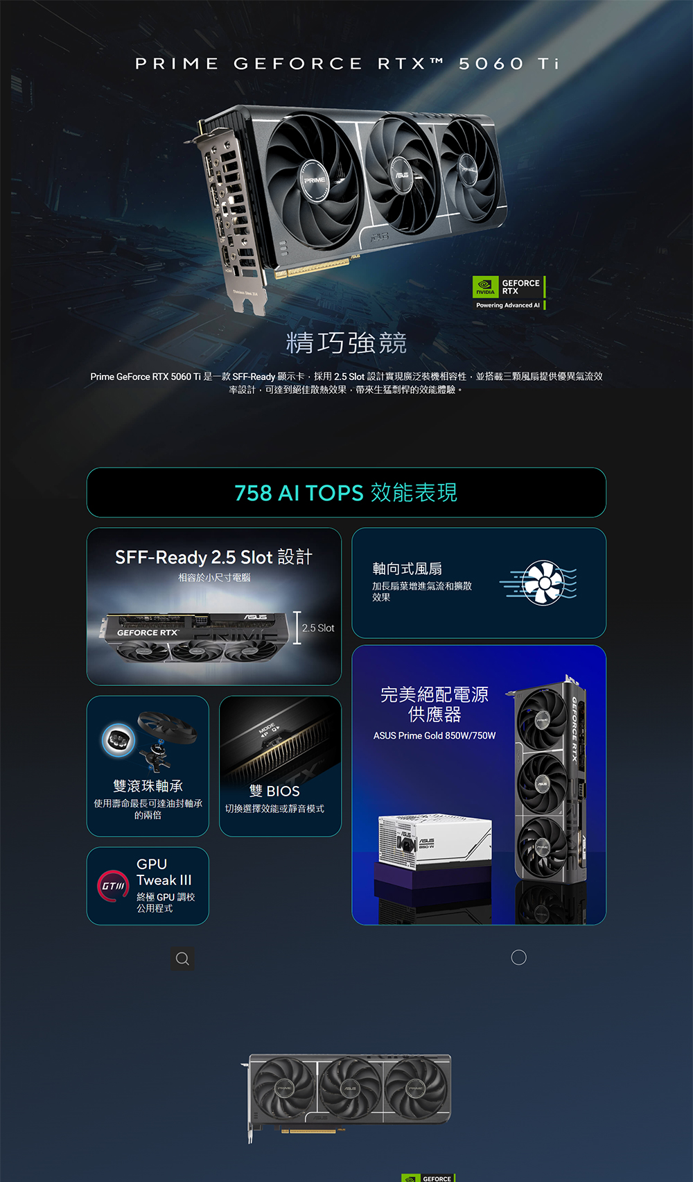 Prime GeForce RTX 5060 Ti 是一款 SFF-Ready 顯示卡,採用 2.5 Slot 設計實現廣泛裝機相容性,並搭載三顆風扇提供優異氣流效率設計,可達到絕佳散熱效果,帶來生猛剽悍的效能體驗。