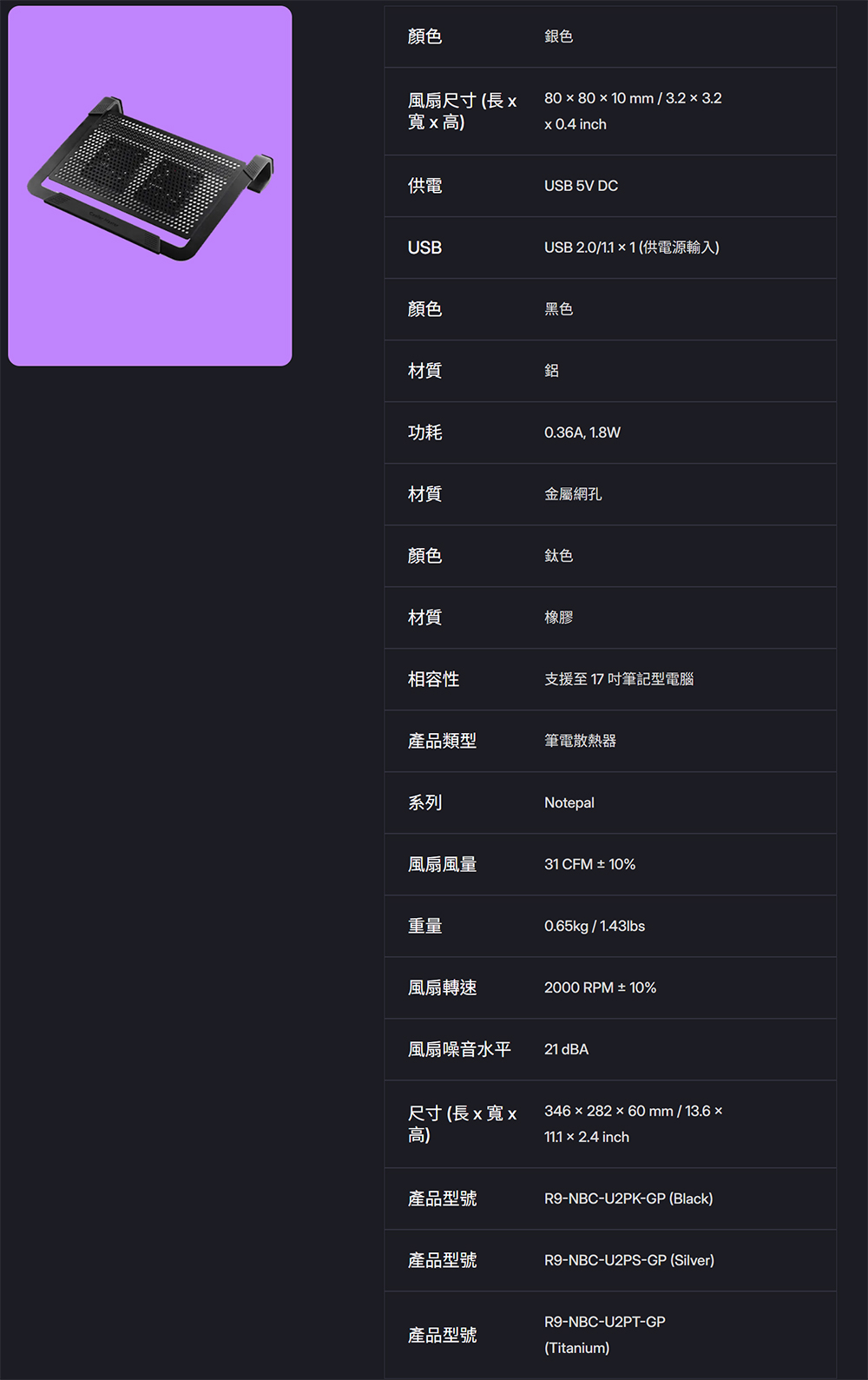 Notepal U2 PLUS超薄筆電散熱墊,專屬您的筆記型電腦。擁有兩個80mm可拆式風扇和噴砂的鋁製表面。兩個內建的整線圓環,保持整潔的工作環境。多功能設計,方便隨身攜帶。最高支援至17吋筆記型電腦。