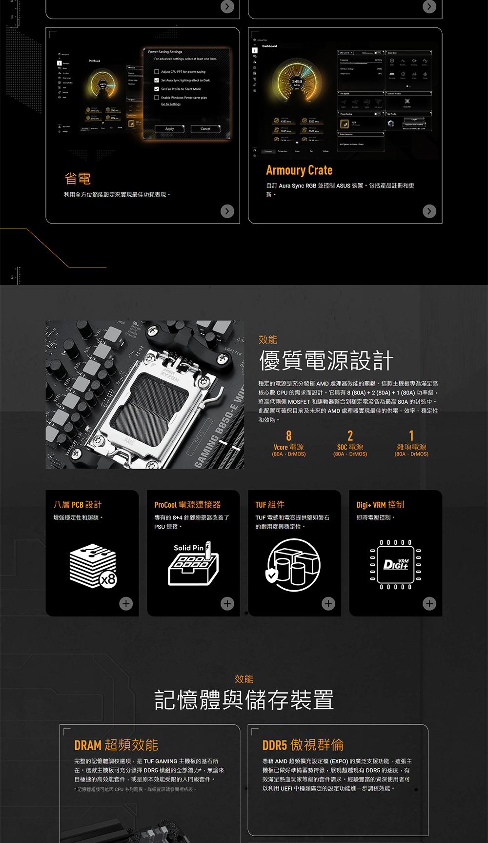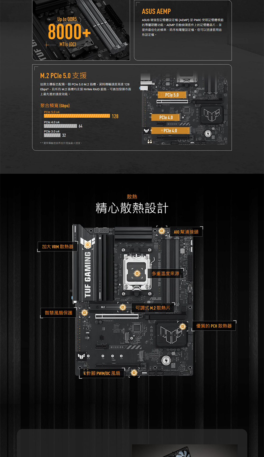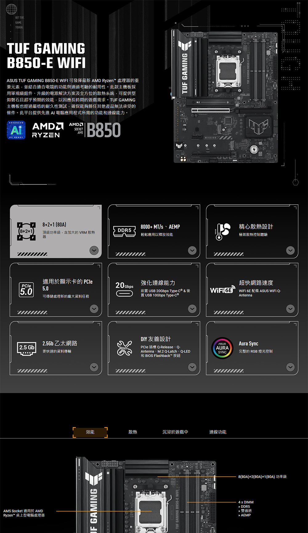 ASUS TUF GAMING B850-E WIFI 可發揮最新 AMD Ryzen™ 處理器的重要元素,並結合適合電競的功能與通過考驗的耐用性。此款主機板採用軍規級組件、升級的電源解決方案及全方位的散熱系統,可提供堅如磐石且超乎預期的效能,以因應長時間的遊戲需求。TUF GAMING 主機板也經過嚴格的耐久性測試,確保能夠勝任其他產品無法承受的條件。此平台提供先進 AI 電腦應用程式所需的功能和連線能力。