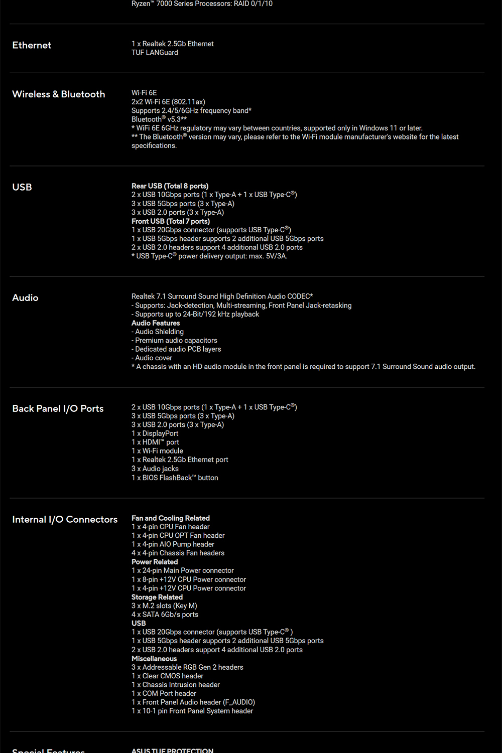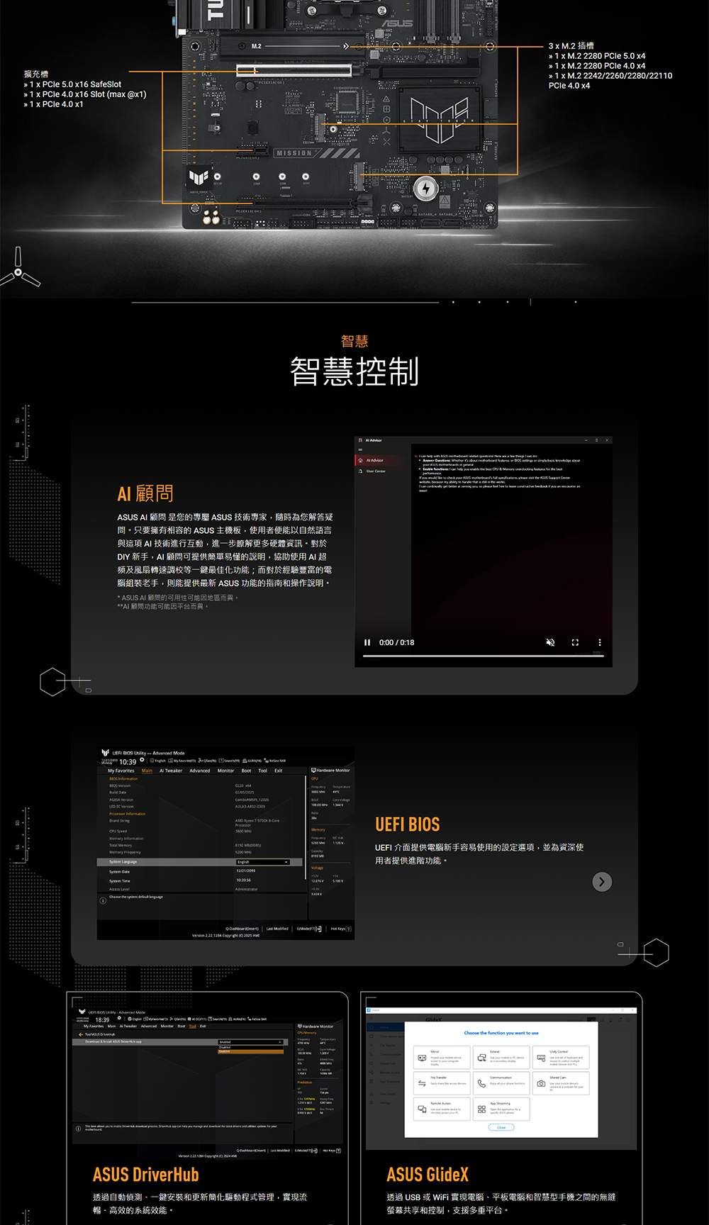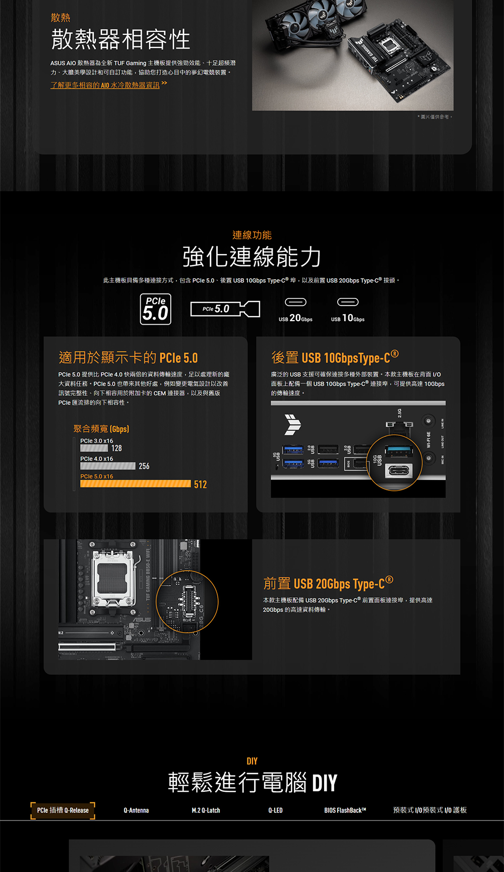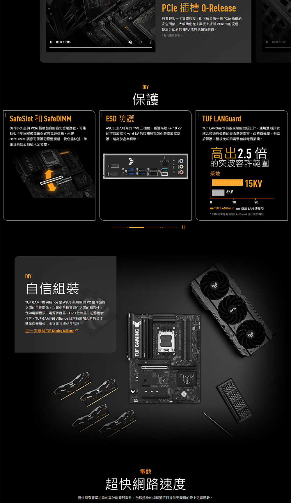 ASUS TUF GAMING B850-E WIFI 可發揮最新 AMD Ryzen™ 處理器的重要元素,並結合適合電競的功能與通過考驗的耐用性。此款主機板採用軍規級組件、升級的電源解決方案及全方位的散熱系統,可提供堅如磐石且超乎預期的效能,以因應長時間的遊戲需求。TUF GAMING 主機板也經過嚴格的耐久性測試,確保能夠勝任其他產品無法承受的條件。此平台提供先進 AI 電腦應用程式所需的功能和連線能力。
