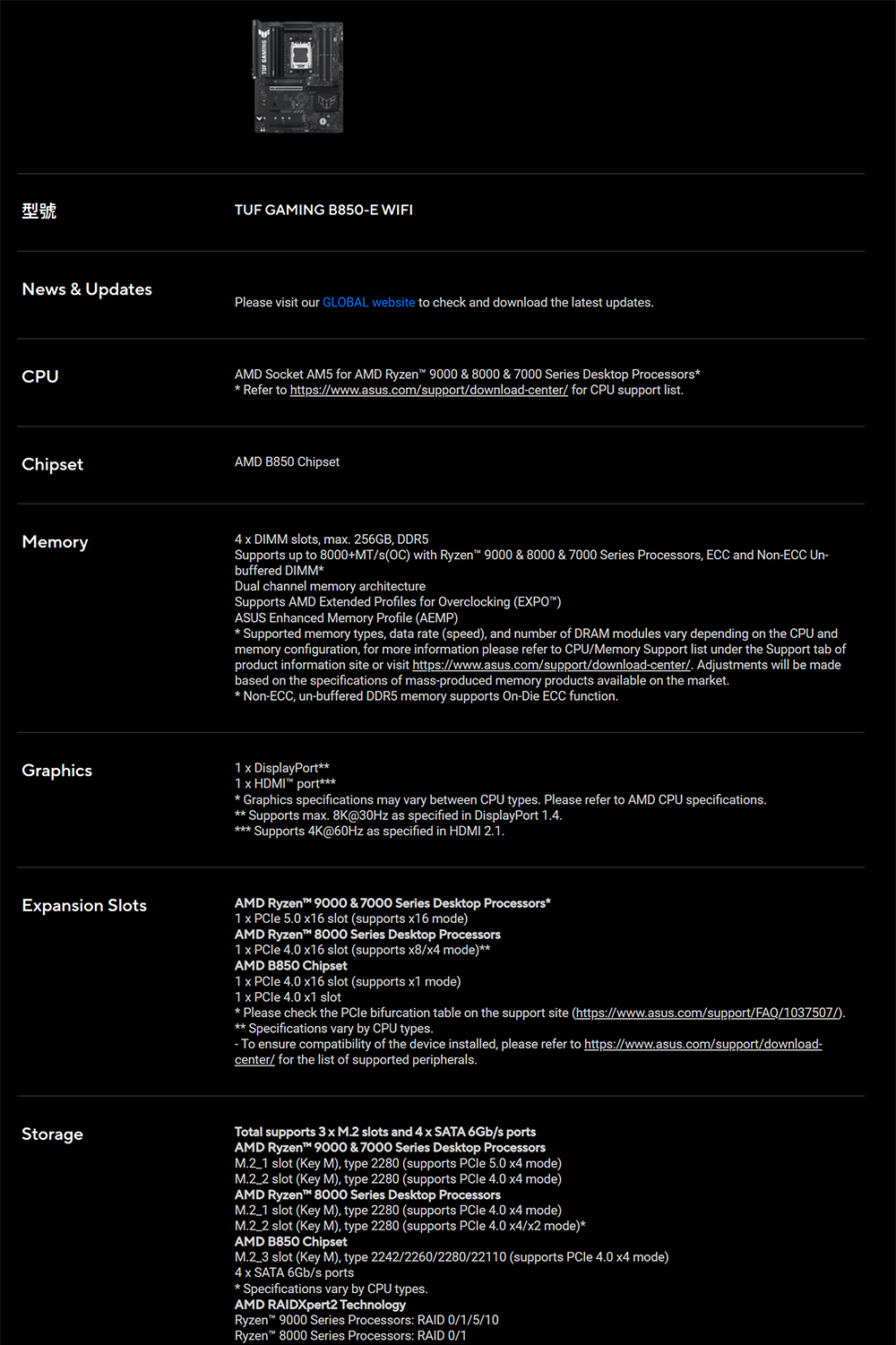 [ASUS華碩]《TUF-GAMING-B850-E-WIFI》ATX/LAN2.5G+無線/註五年