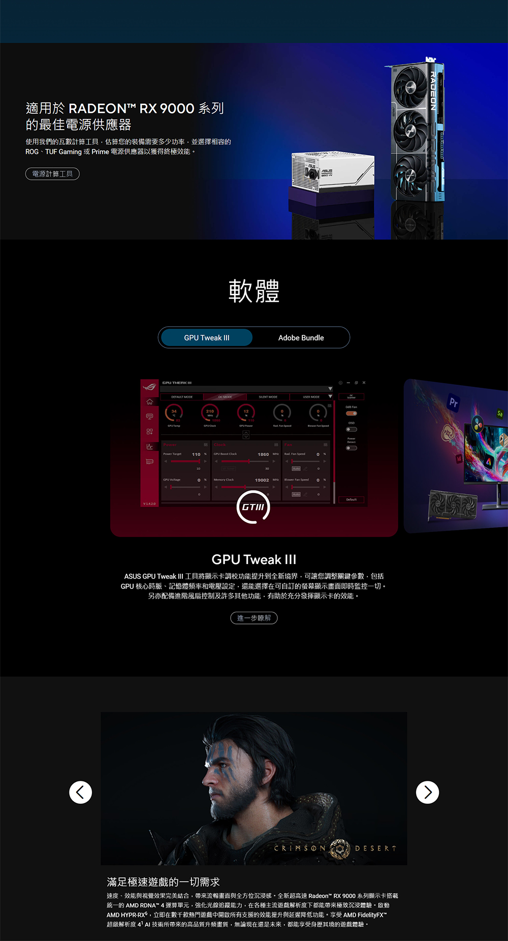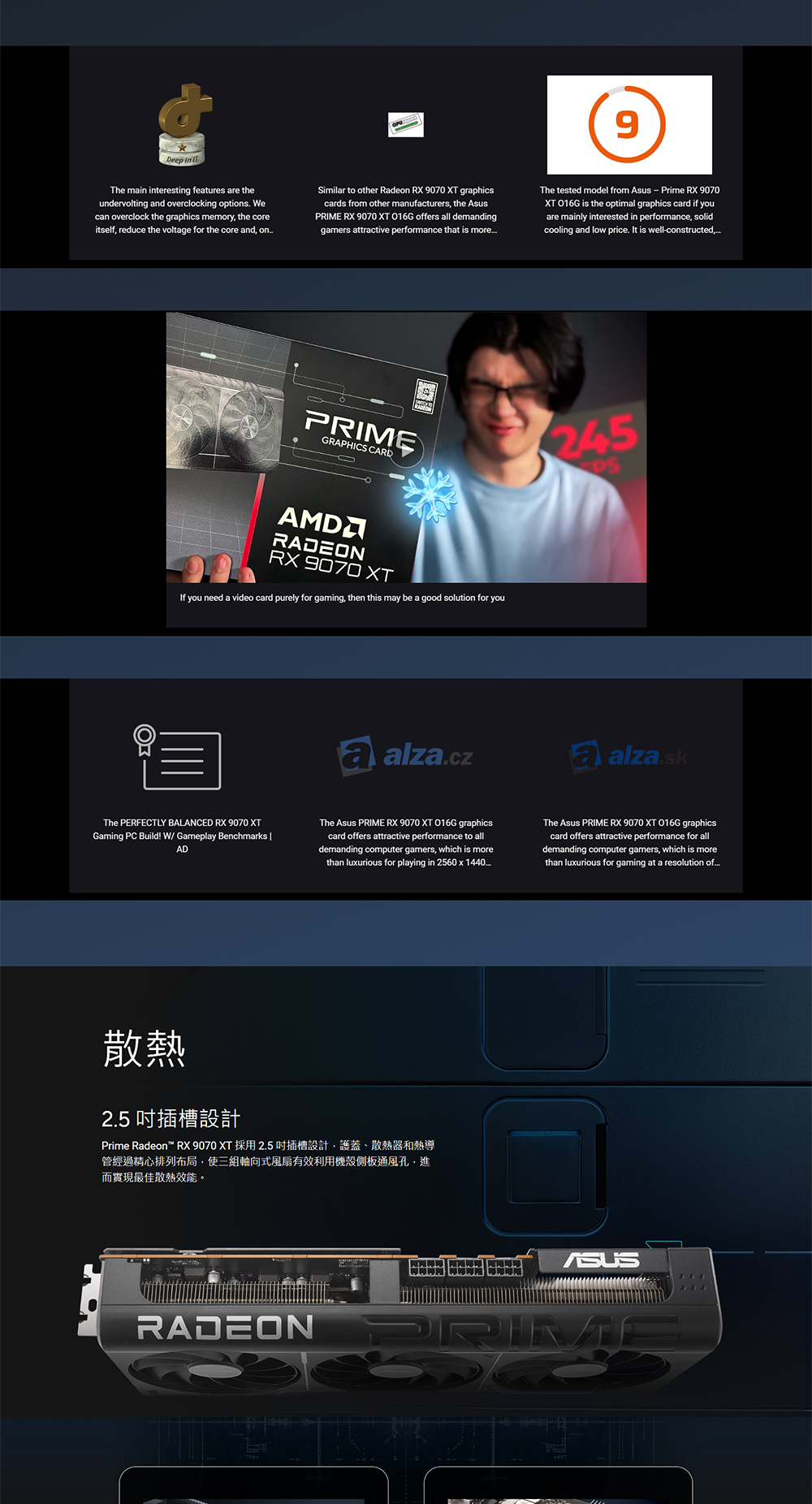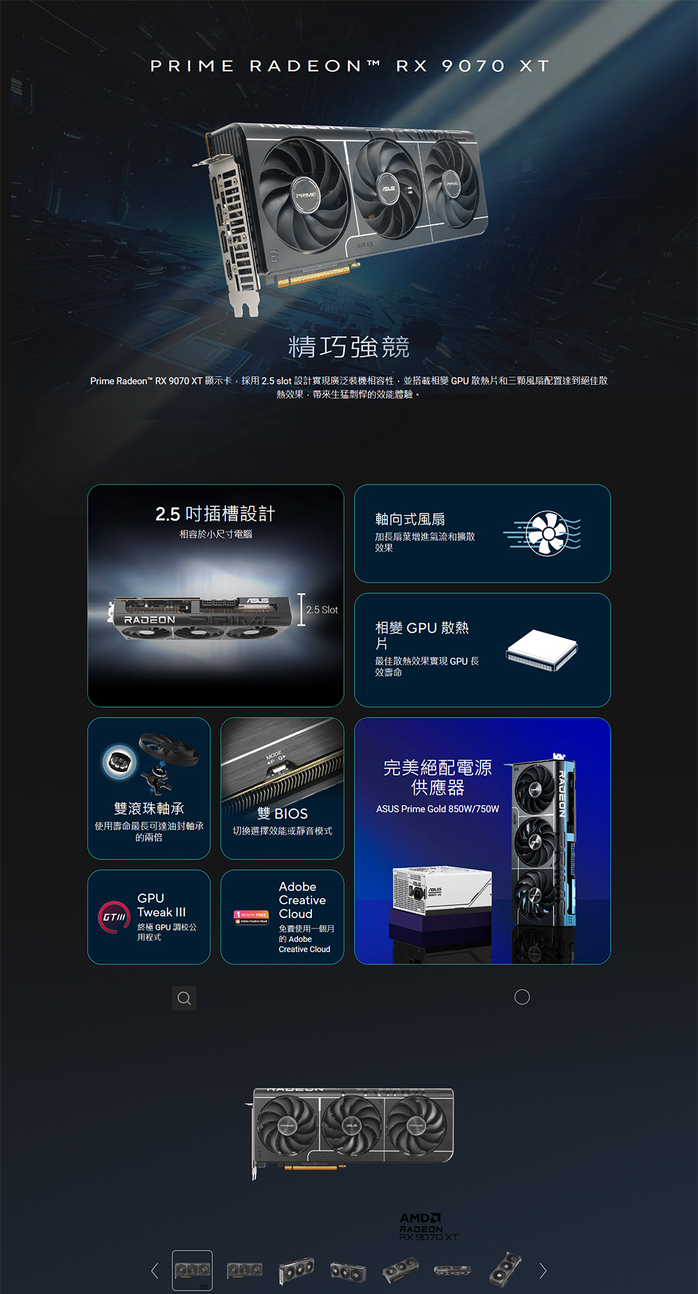 Prime Radeon™ RX 9070 XT 顯示卡,採用 2.5 slot 設計實現廣泛裝機相容性,並搭載相變 GPU 散熱片和三顆風扇配置達到絕佳散熱效果,帶來生猛剽悍的效能體驗。