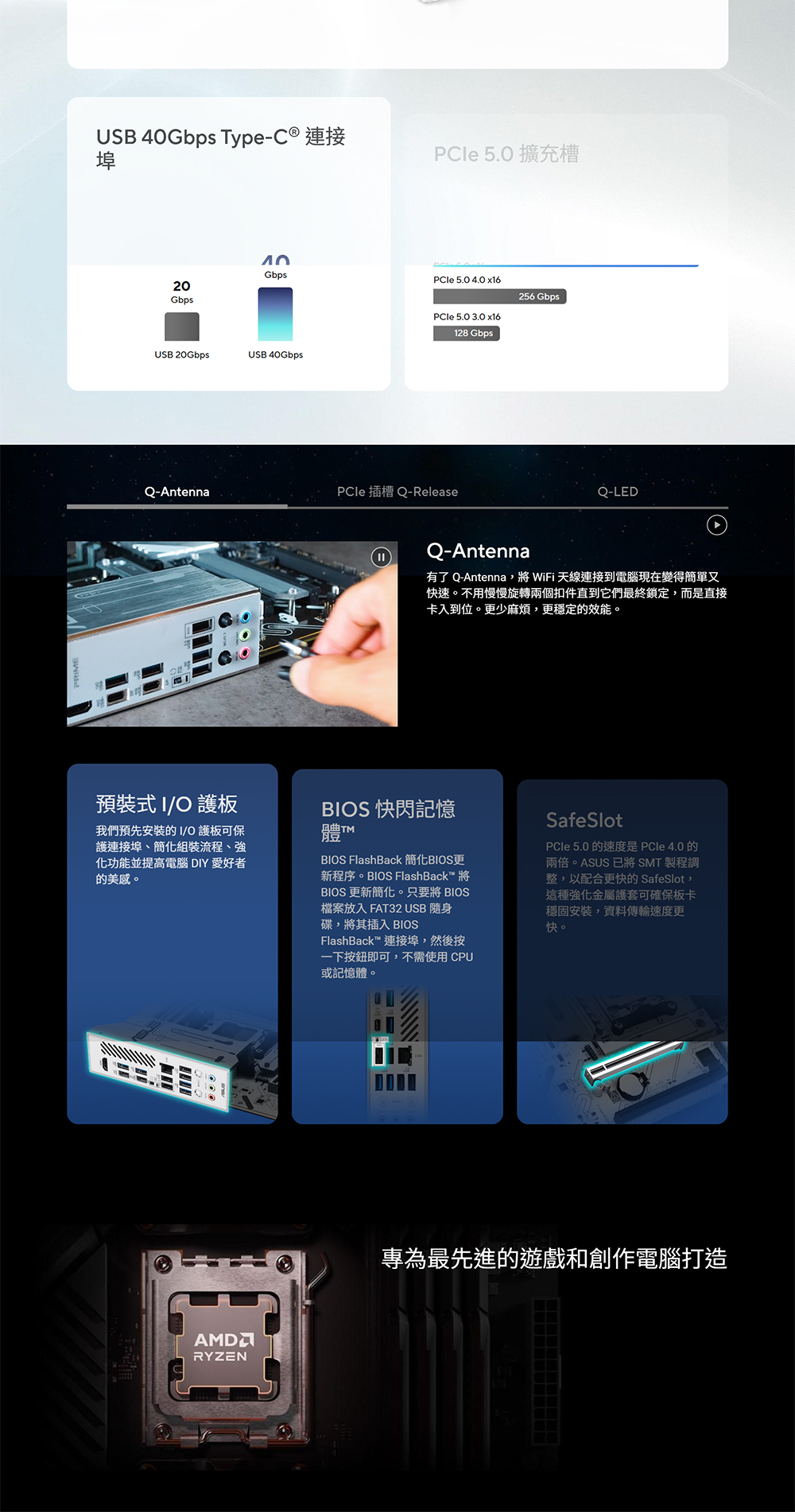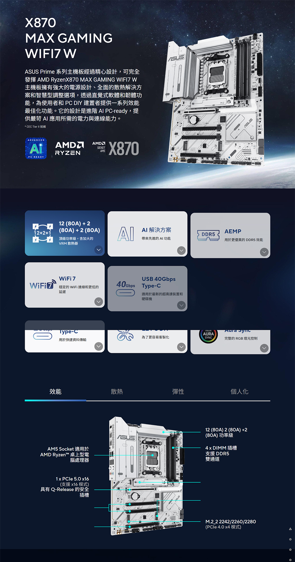 ASUS Prime 系列主機板經過精心設計,可完全發揮 AMD RyzenX870 MAX GAMING WIFI7 W 主機板擁有強大的電源設計、全面的散熱解決方案和智慧型調整選項,透過直覺式軟體和韌體功能,為使用者和 PC DIY 建置者提供一系列效能最佳化功能。它的設計是進階 AI PC-ready,提供嚴苛 AI 應用所需的電力與連線能力。