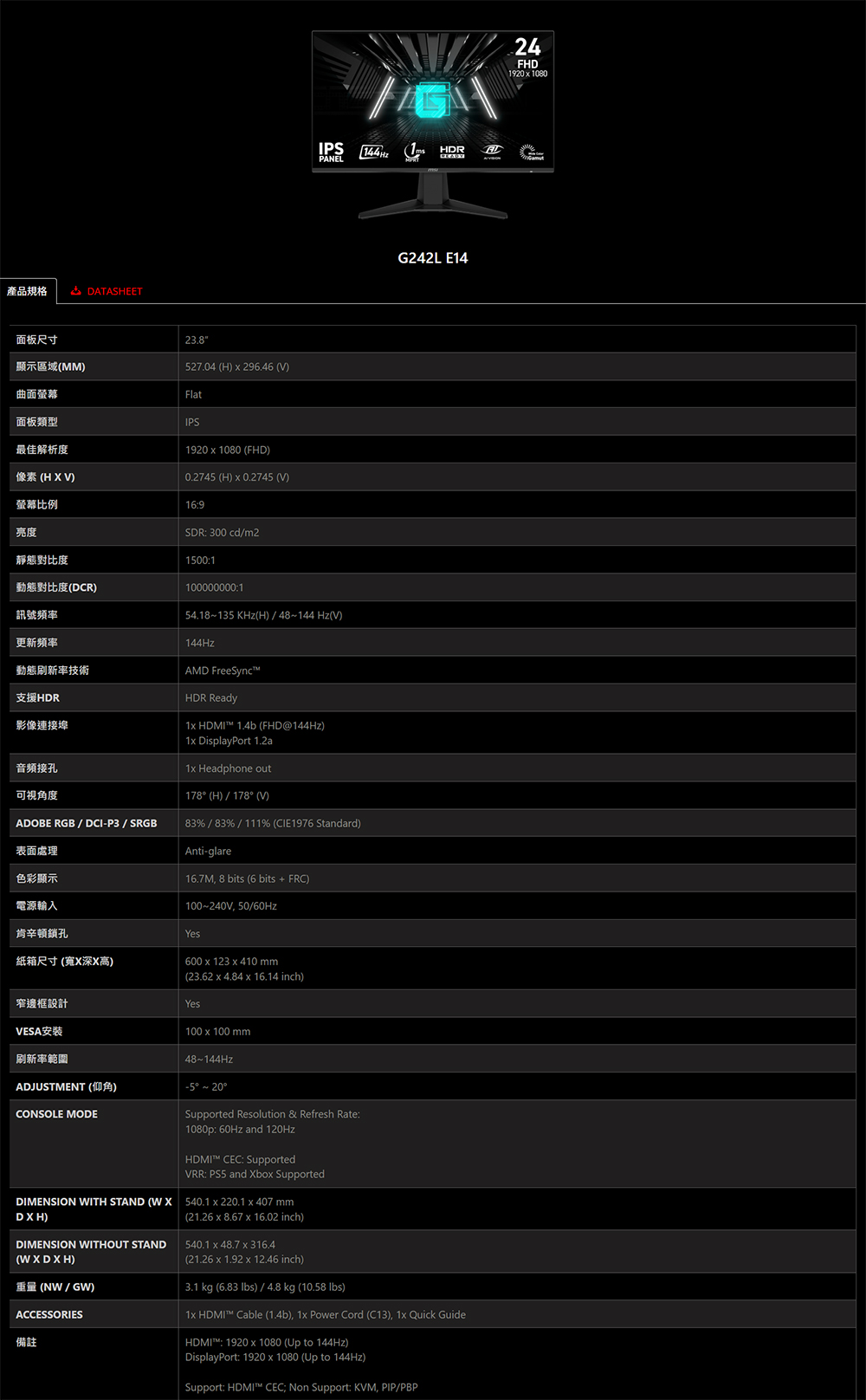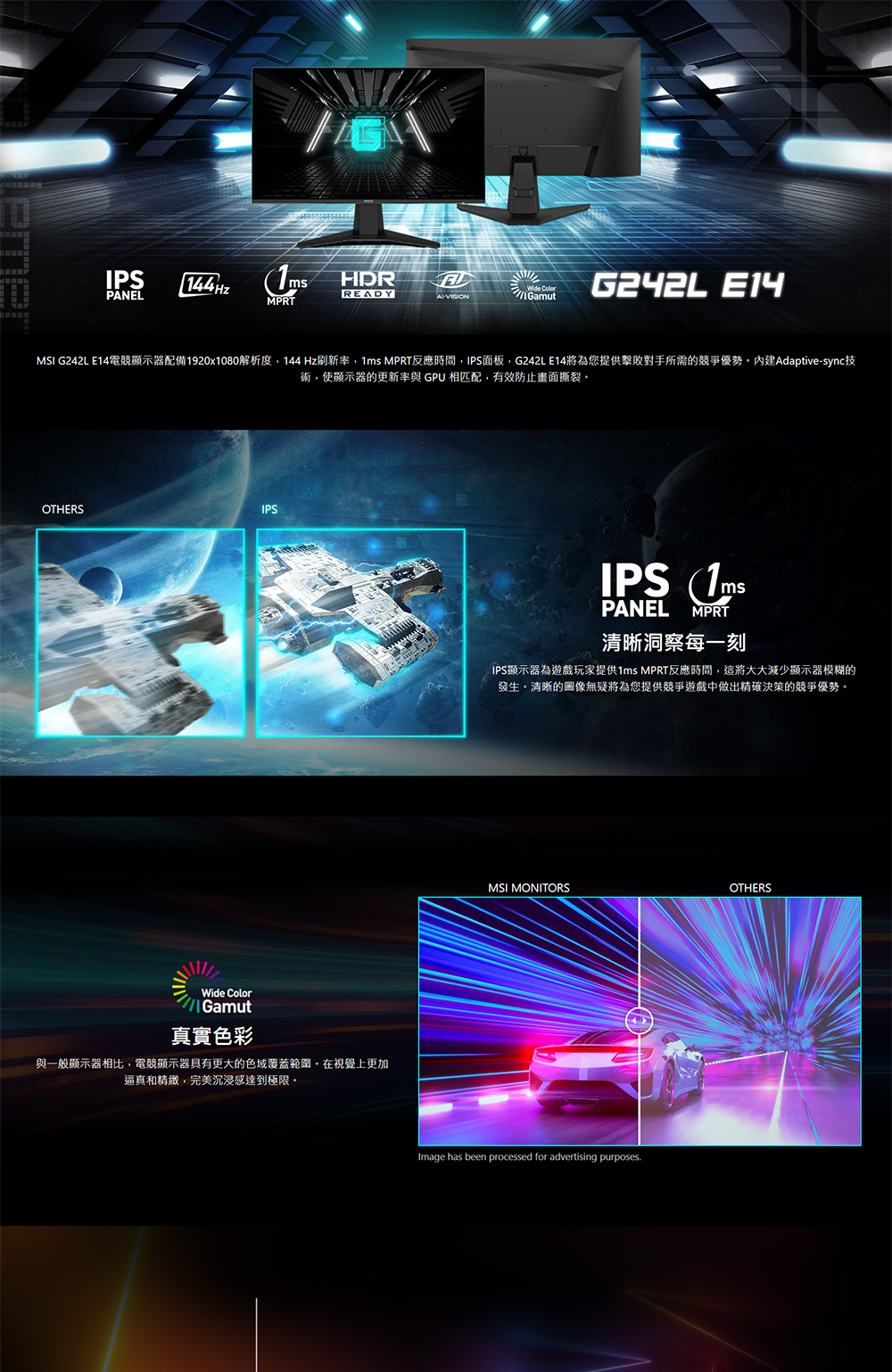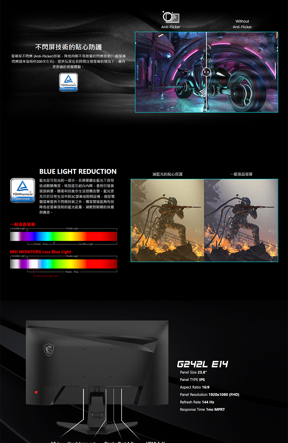 [MSI 微星]《G242L-E14》IPS/1ms/144Hz/HDMI/DP/Adaptive-Sync/AMD FreeSync/HDR Ready/黑平衡/無喇叭/三年保