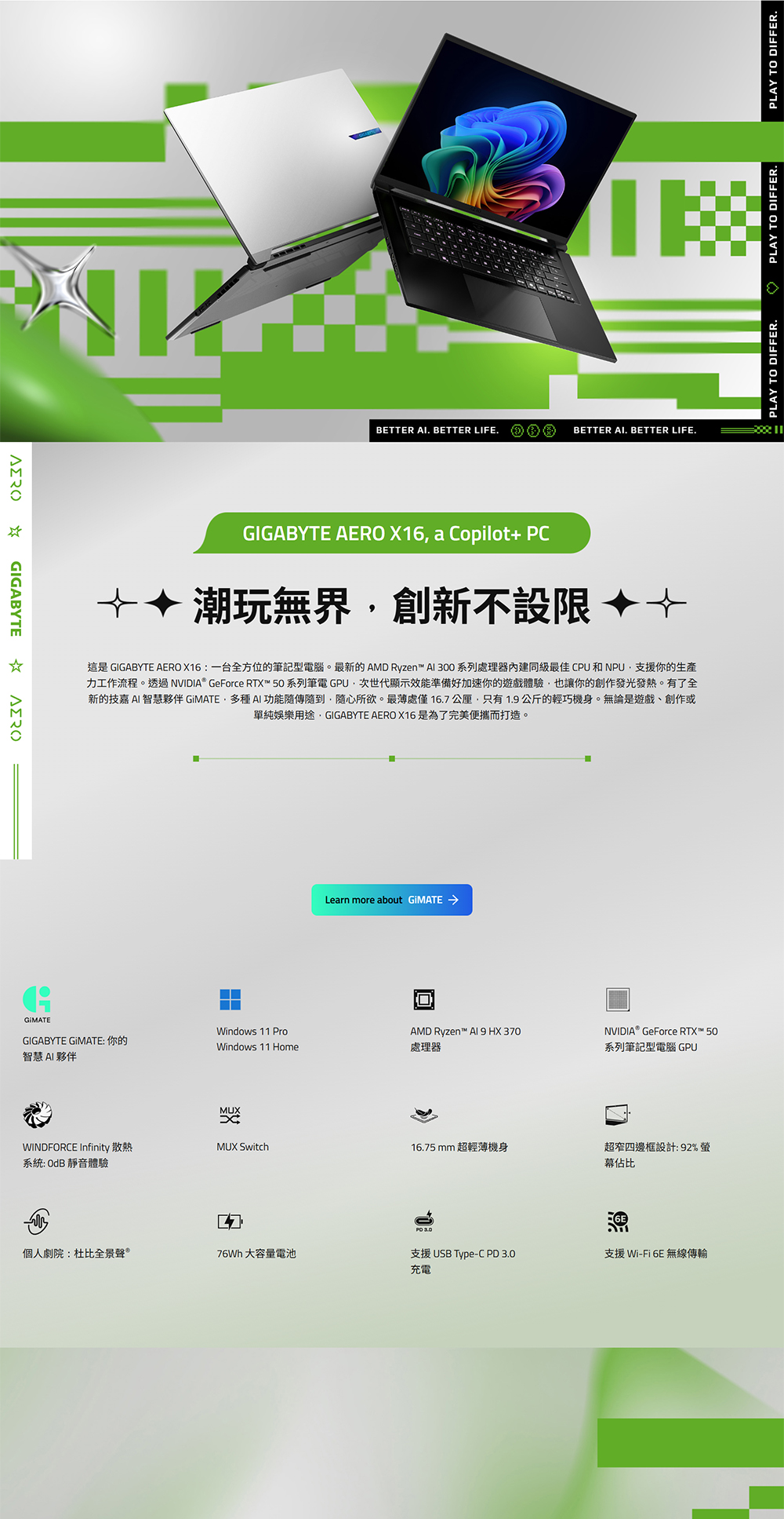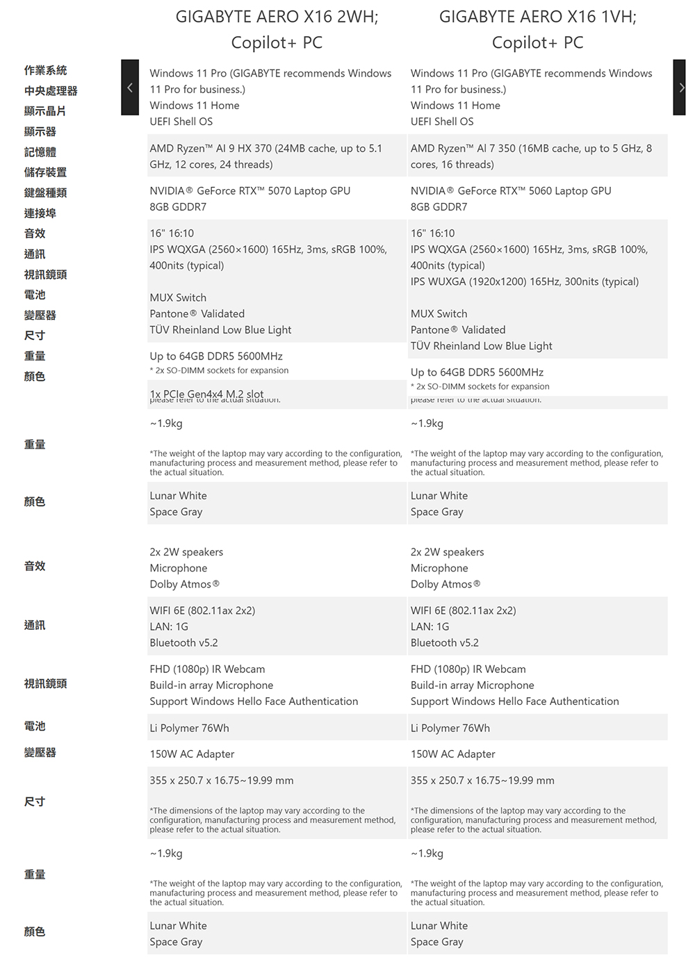 [技嘉] 《AERO-X16-1VH93TWC94DH 幻月白》16吋 IPS WQXGA/165Hz/R7-350/16G D5/1TB PCIe/RTX5060-8G/Win11