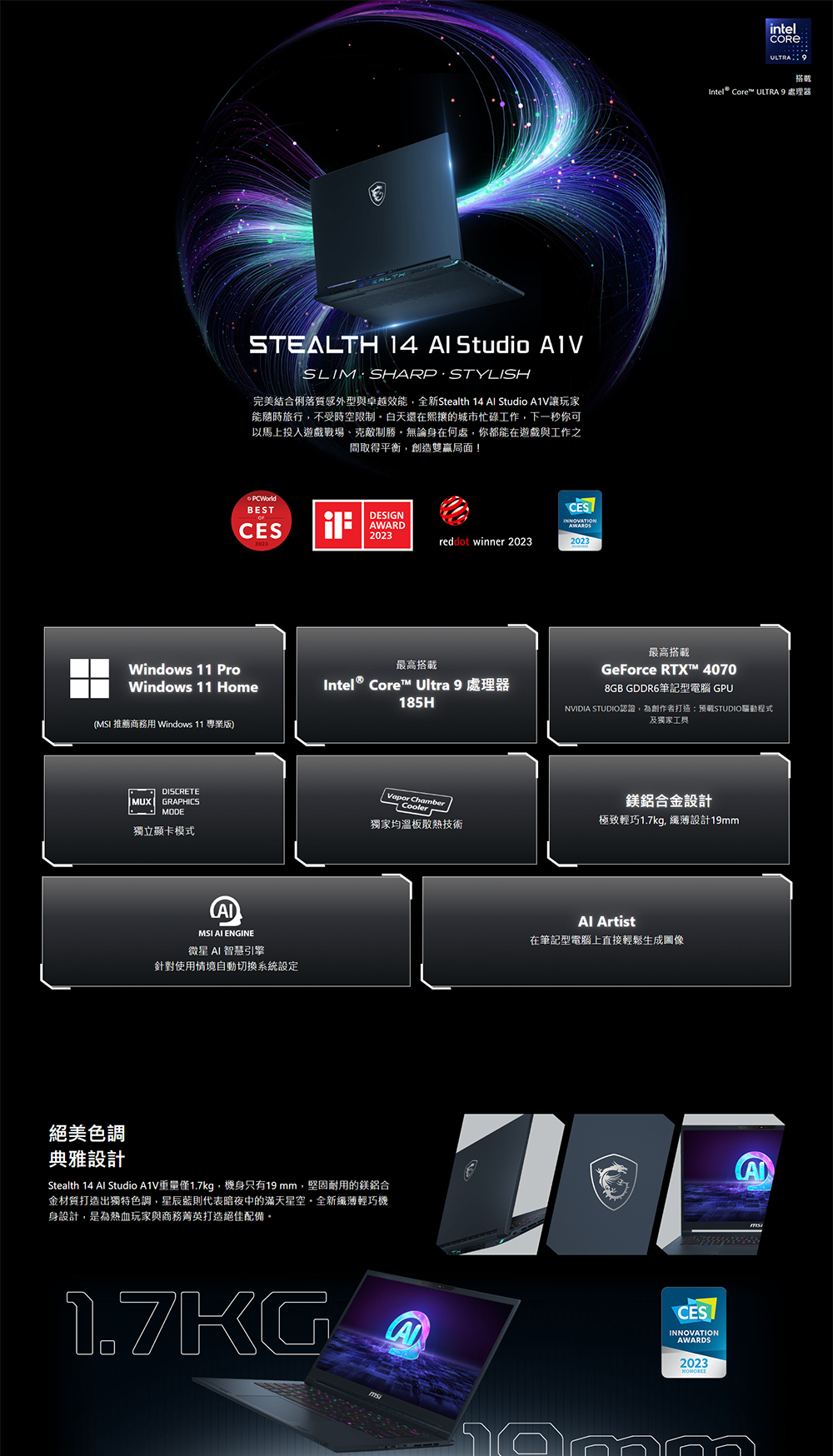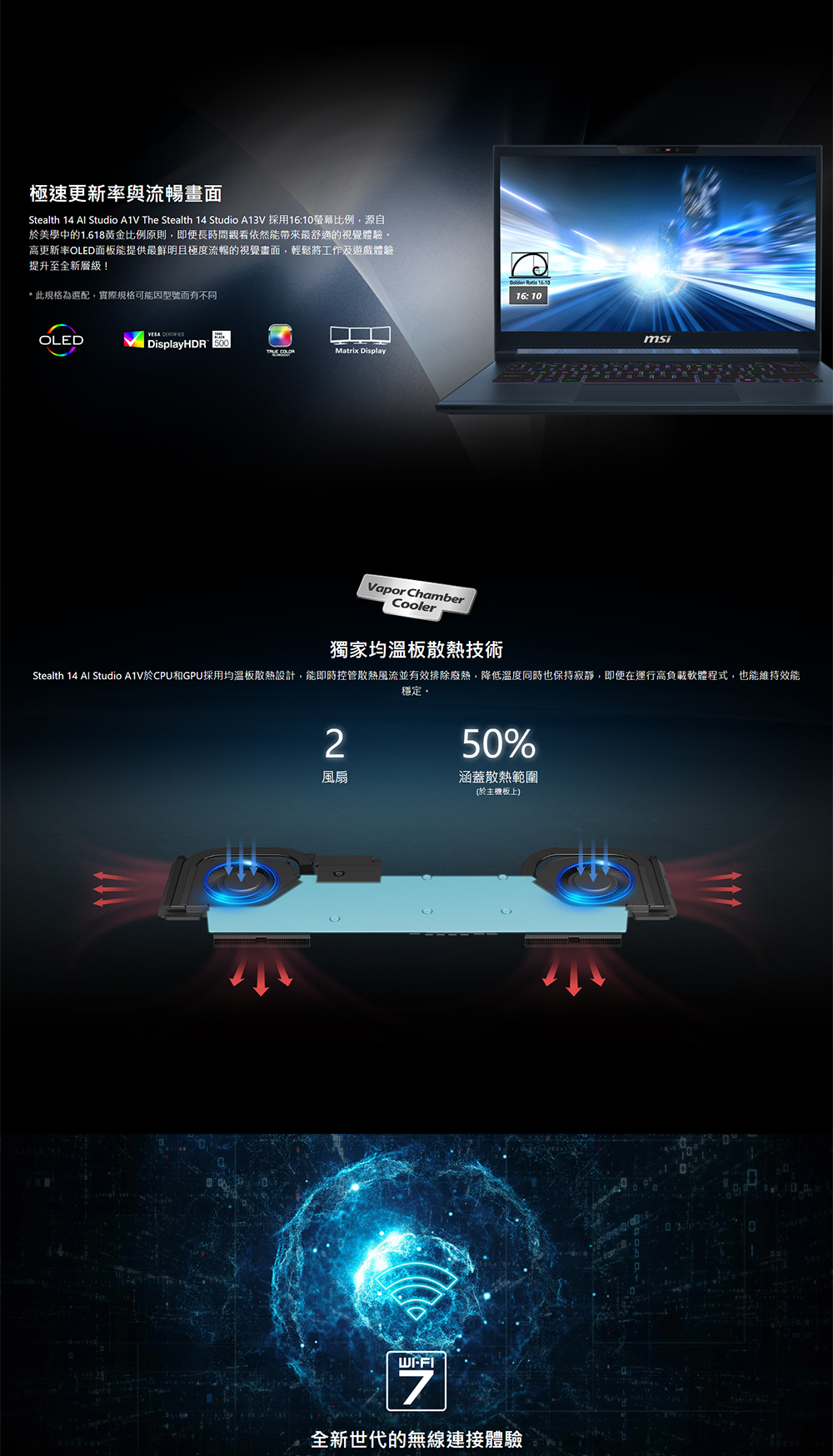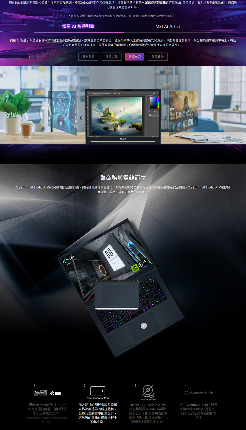 [MSI 微星]《Stealth 14 AI Studio A1VEG-200TW》14吋16:10 FHD+/165Hz/Ultra 7-155H/16G/1TB PCIe/RTX4050-6G/Win11