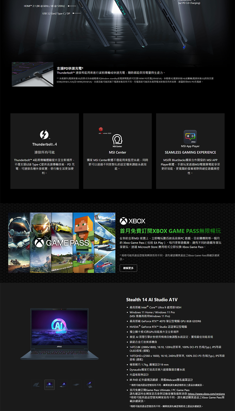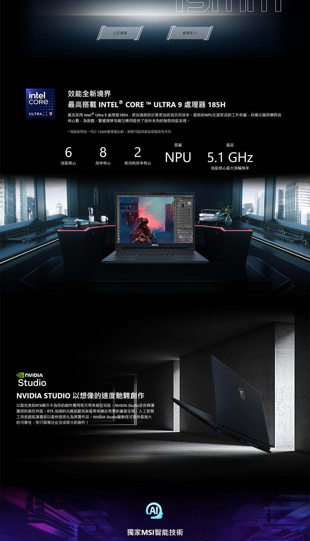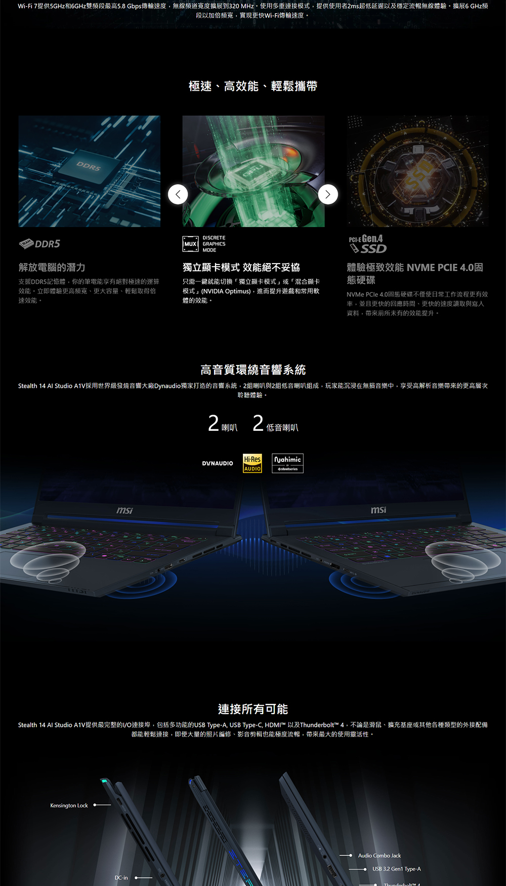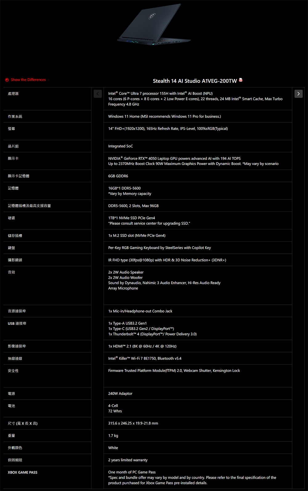 [MSI 微星]《Stealth 14 AI Studio A1VEG-200TW》14吋16:10 FHD+/165Hz/Ultra 7-155H/16G/1TB PCIe/RTX4050-6G/Win11