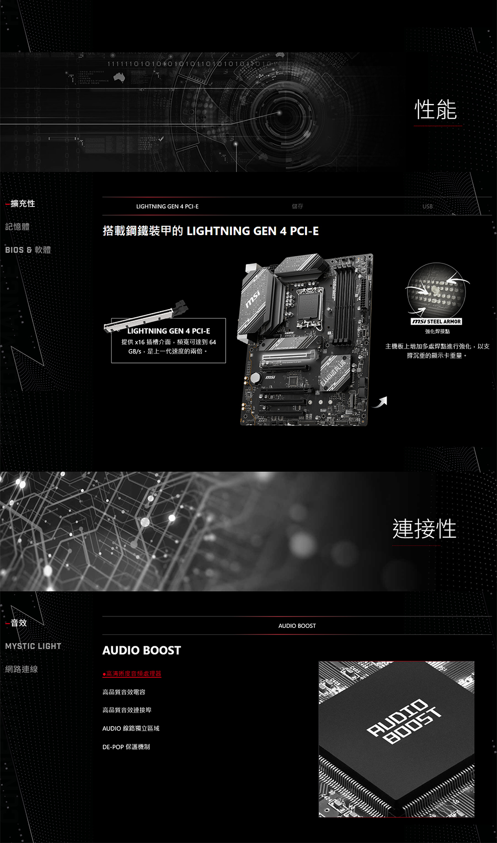 強化供電設計: 12+1 Duet Rail 電源系統並採用 P-PAK、8-pin + 4-pin CPU 供電連接埠、Core Boost、Memory Boost