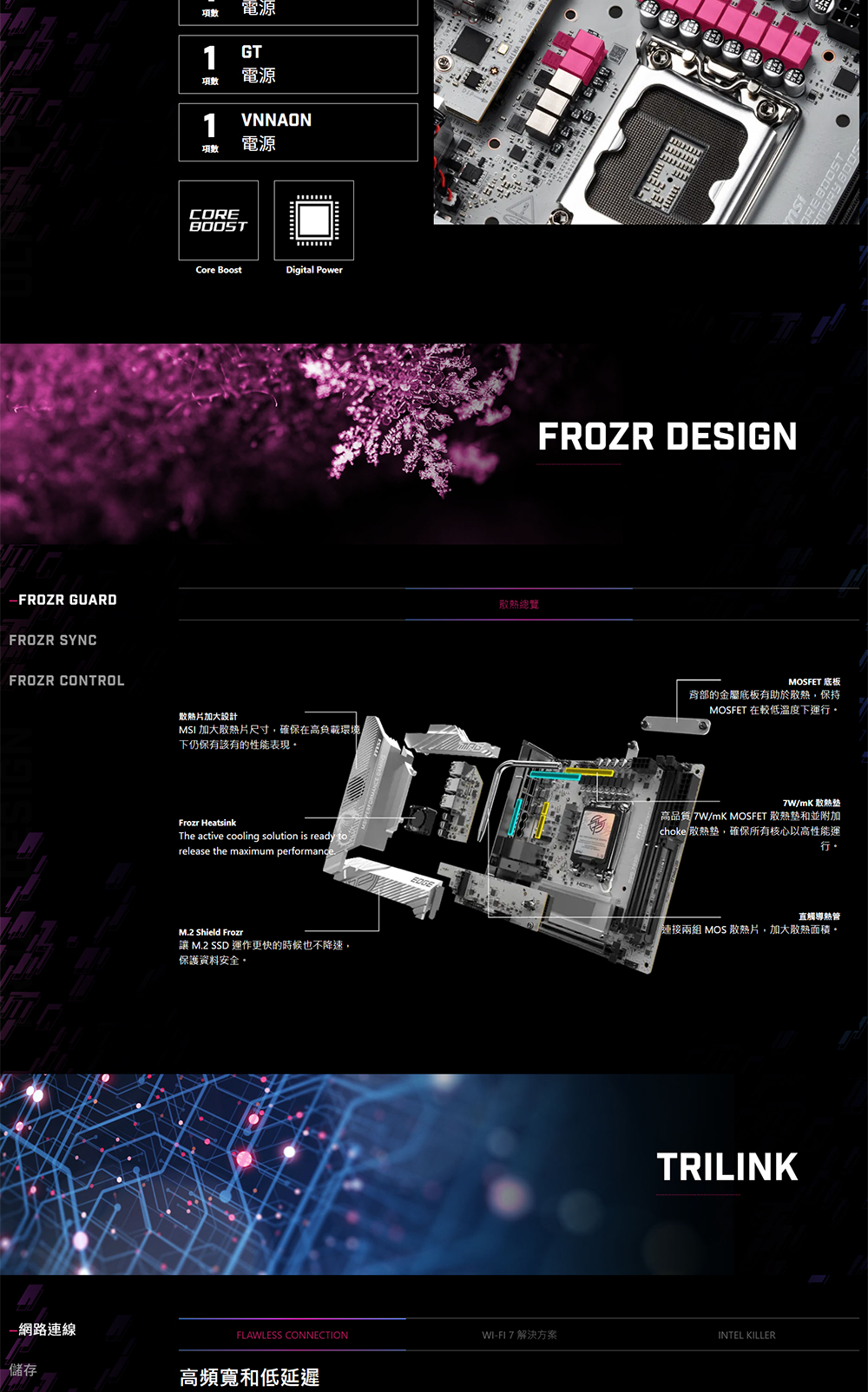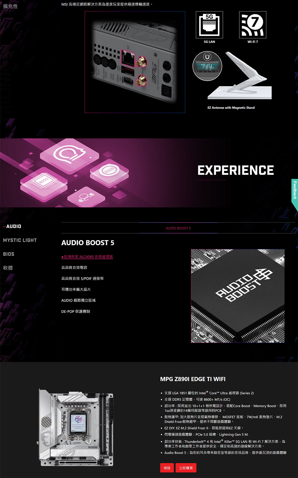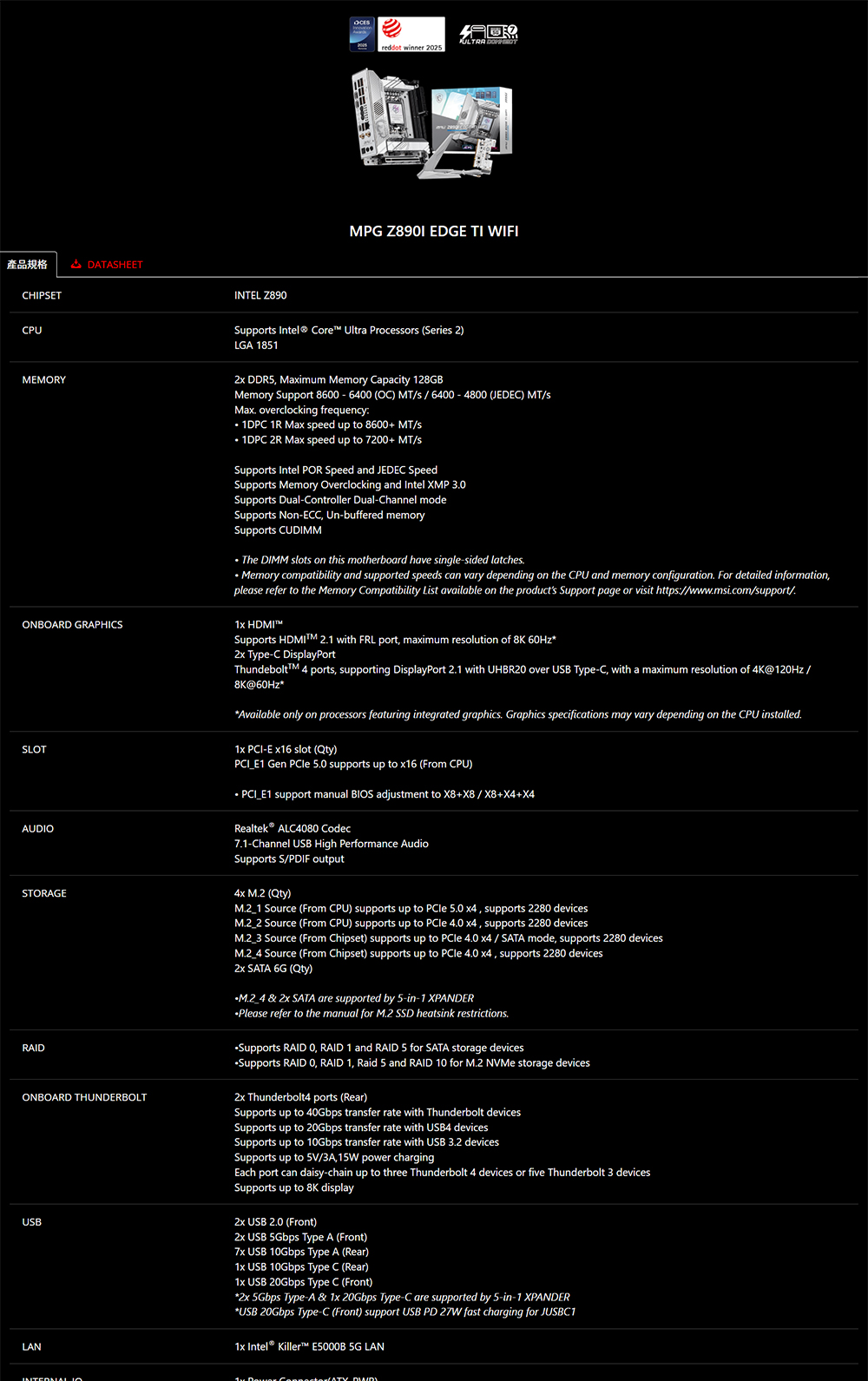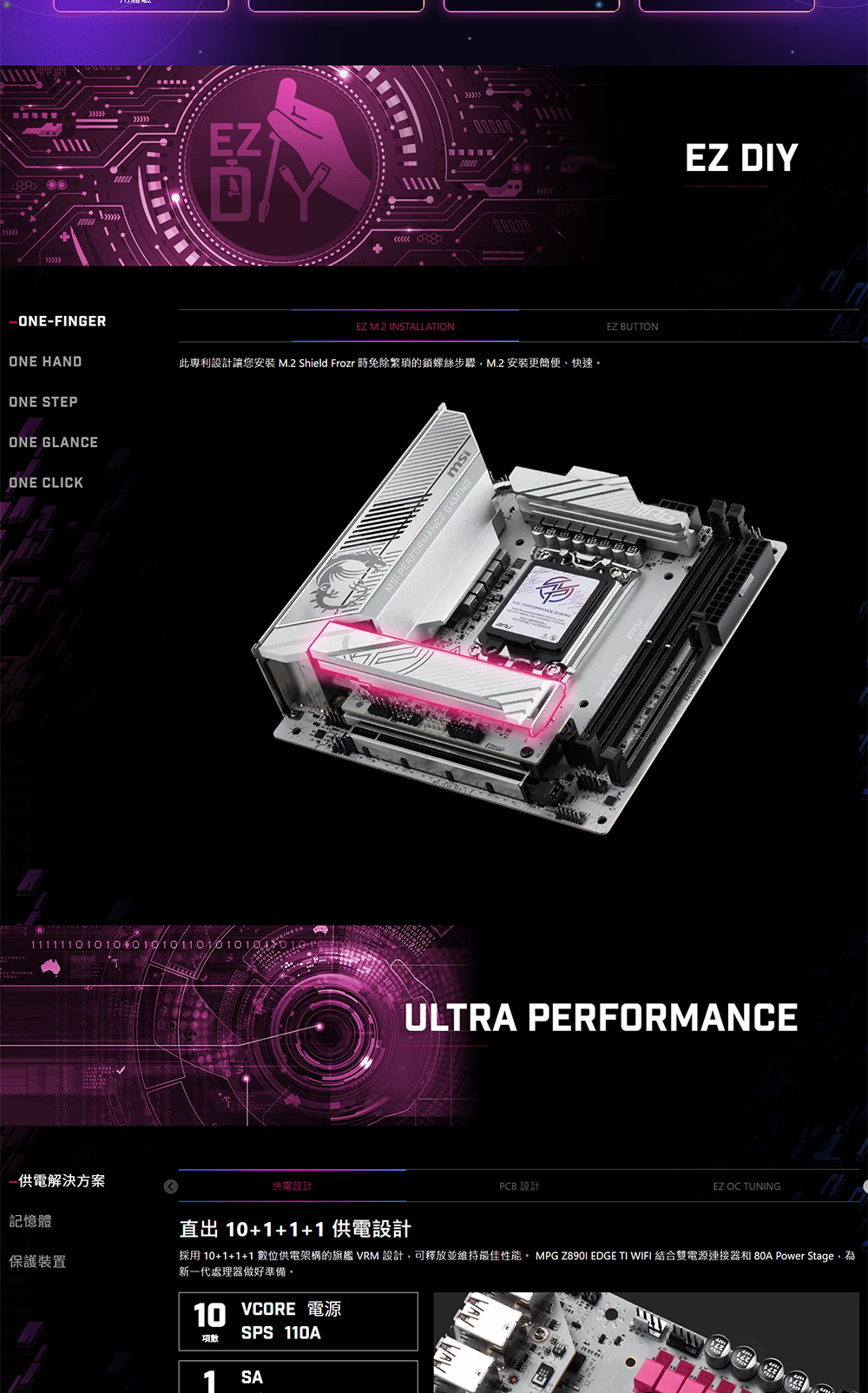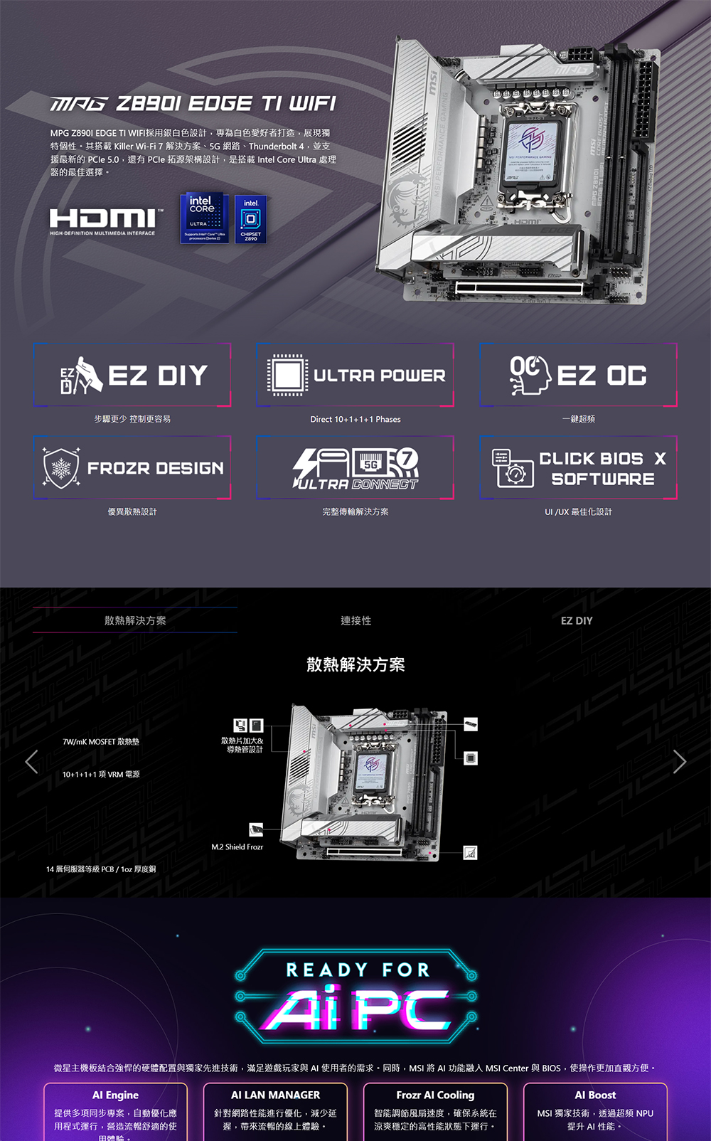 MPG Z890I EDGE TI WIFI採用銀白色設計,專為白色愛好者打造,展現獨特個性。其搭載 Killer Wi-Fi 7 解決方案、5G 網路、Thunderbolt 4,並支援最新的 PCIe 5.0,還有 PCIe 拓源架構設計,是搭載 Intel Core Ultra 處理器的最佳選擇。