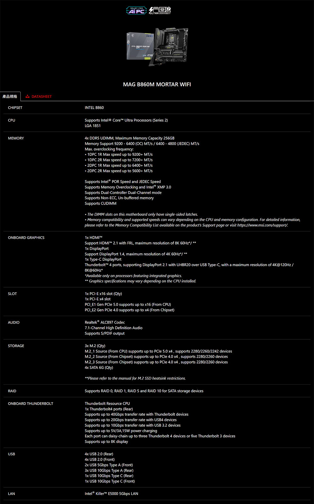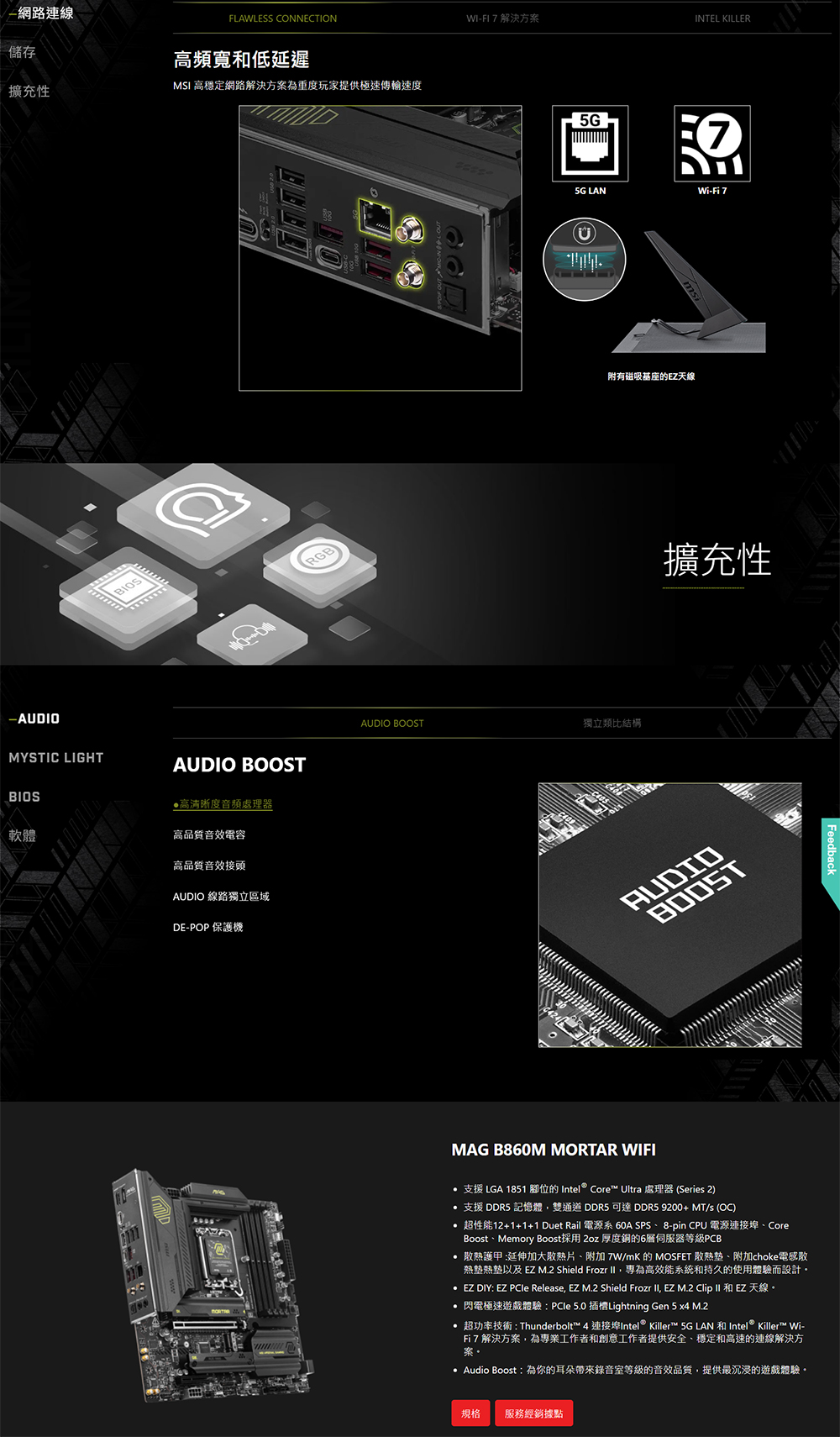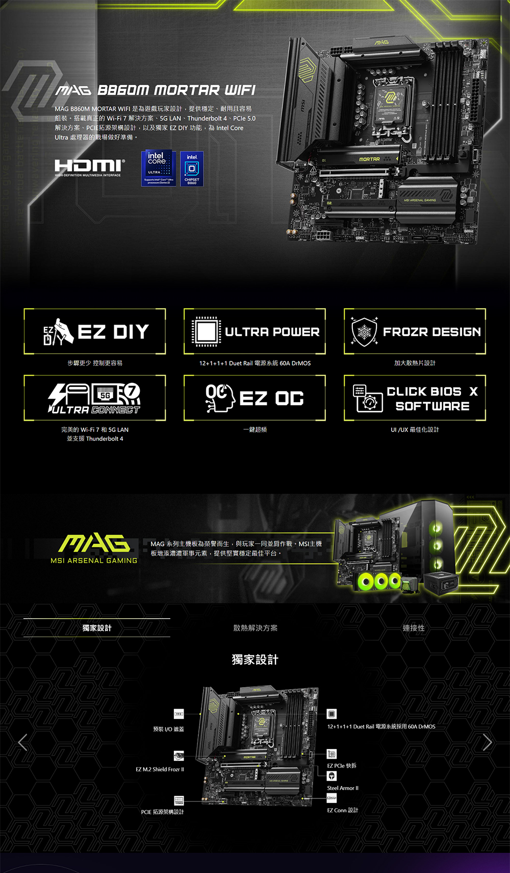 MAG B860M MORTAR WIFI 是為遊戲玩家設計,提供穩定、耐用且容易組裝。搭載真正的 Wi-Fi 7 解決方案、5G LAN、Thunderbolt 4、PCIe 5.0 解決方案、PCIE拓源架構設計,以及獨家 EZ DIY 功能,為 Intel Core Ultra 處理器的戰場做好準備。