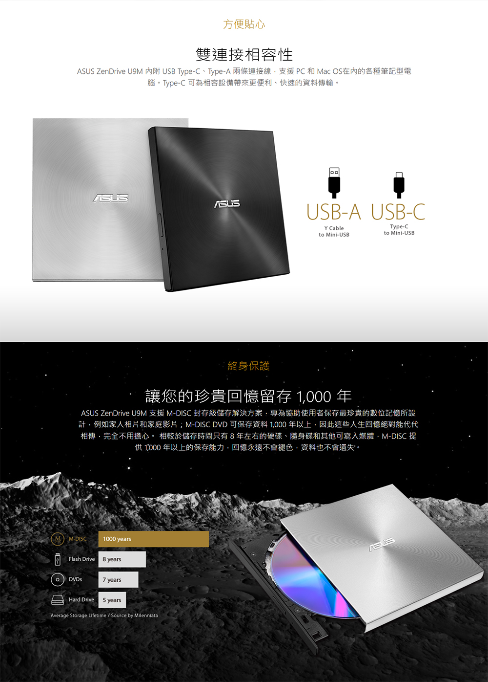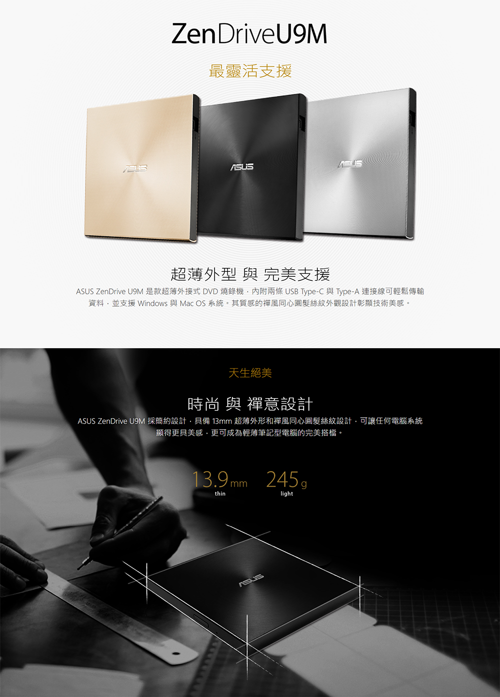 ASUS ZenDrive U9M –美型超薄外接式 8X DVD 燒錄機,支援 M-DISC 終生資料備份,可相容 Windows 和 Mac OS 的 USB Type-C、Type-A 連接線