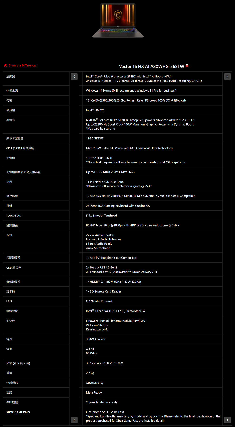 [MSI 微星]《Vector 16 HX AI A2XWHG-268TW》16吋16:10 QHD+/240Hz/Ultra 9-275HX/16G*2/1TB PCIe/RTX5070Ti-12G/Win11