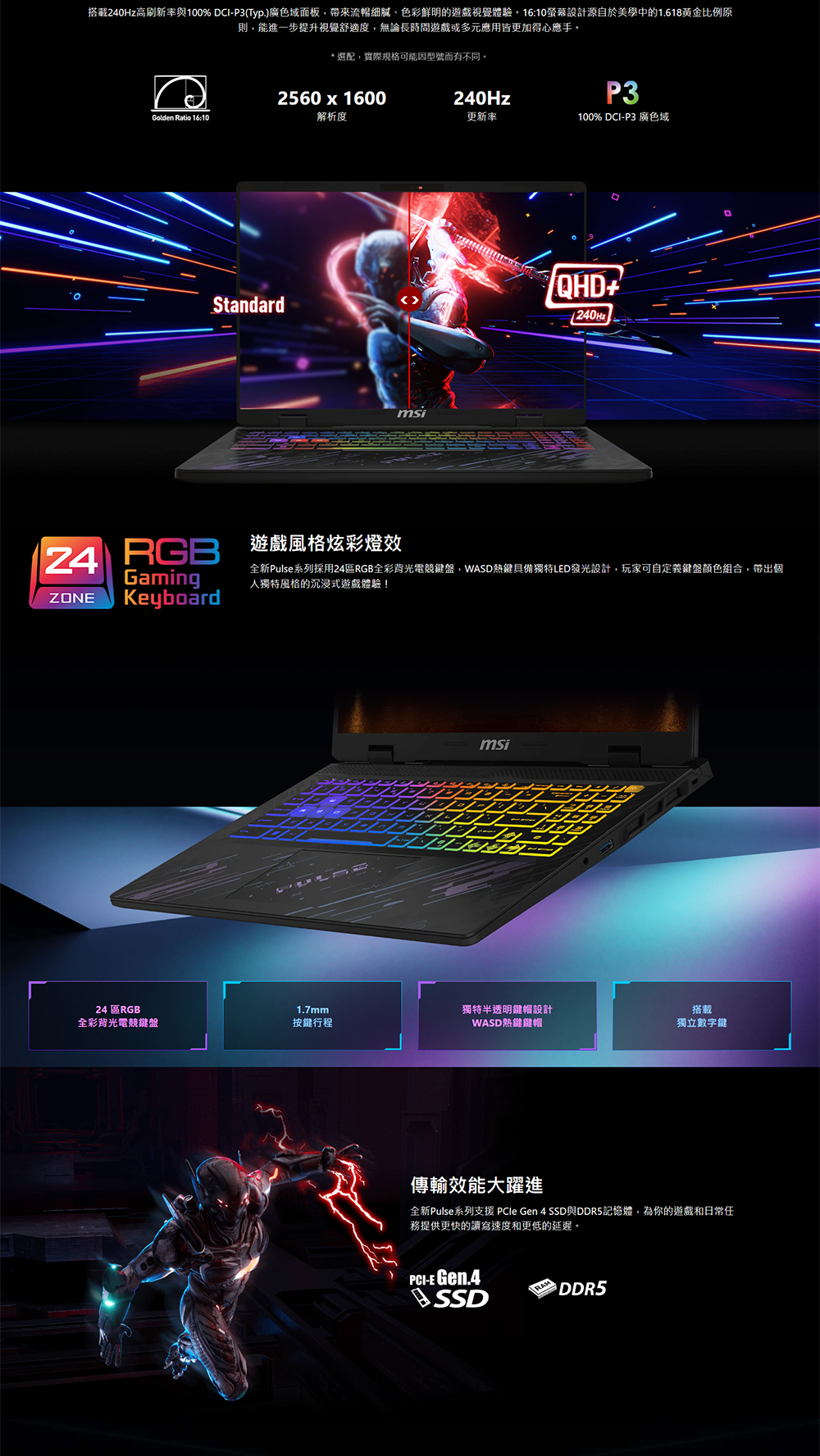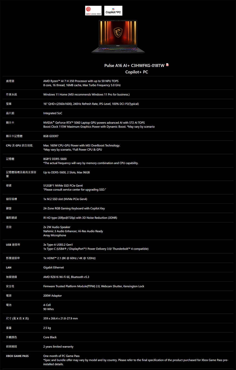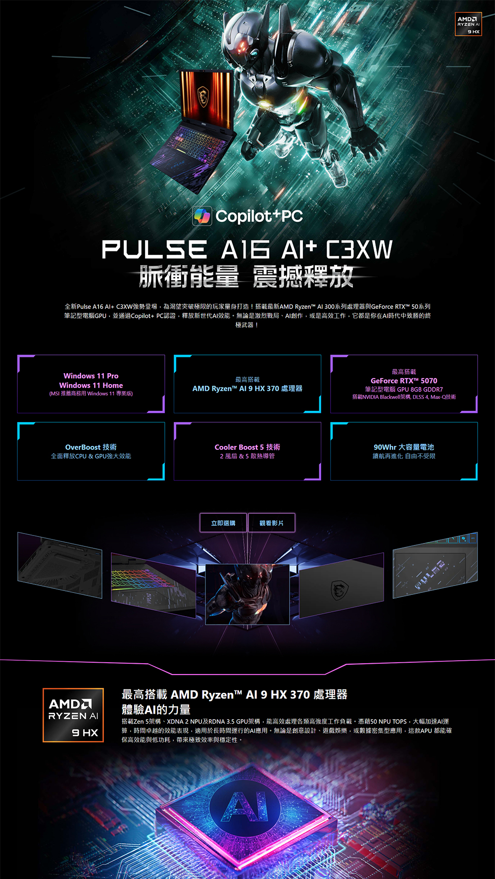 [MSI 微星]《Pulse A16 AI+ C3HWFKG-018TW》16吋QHD+ 240Hz/Ryzen AI 7 HX 350/16G D5/512G PCIe/RTX5060-8G/W11