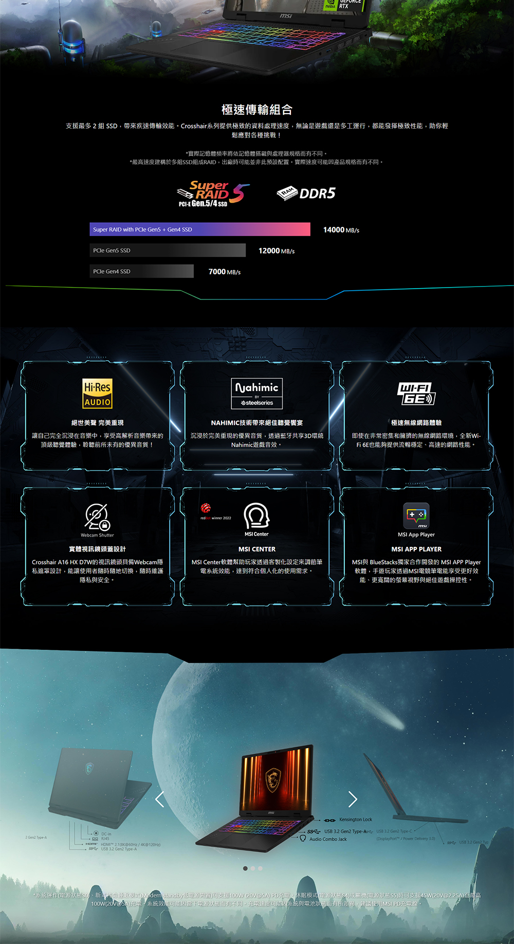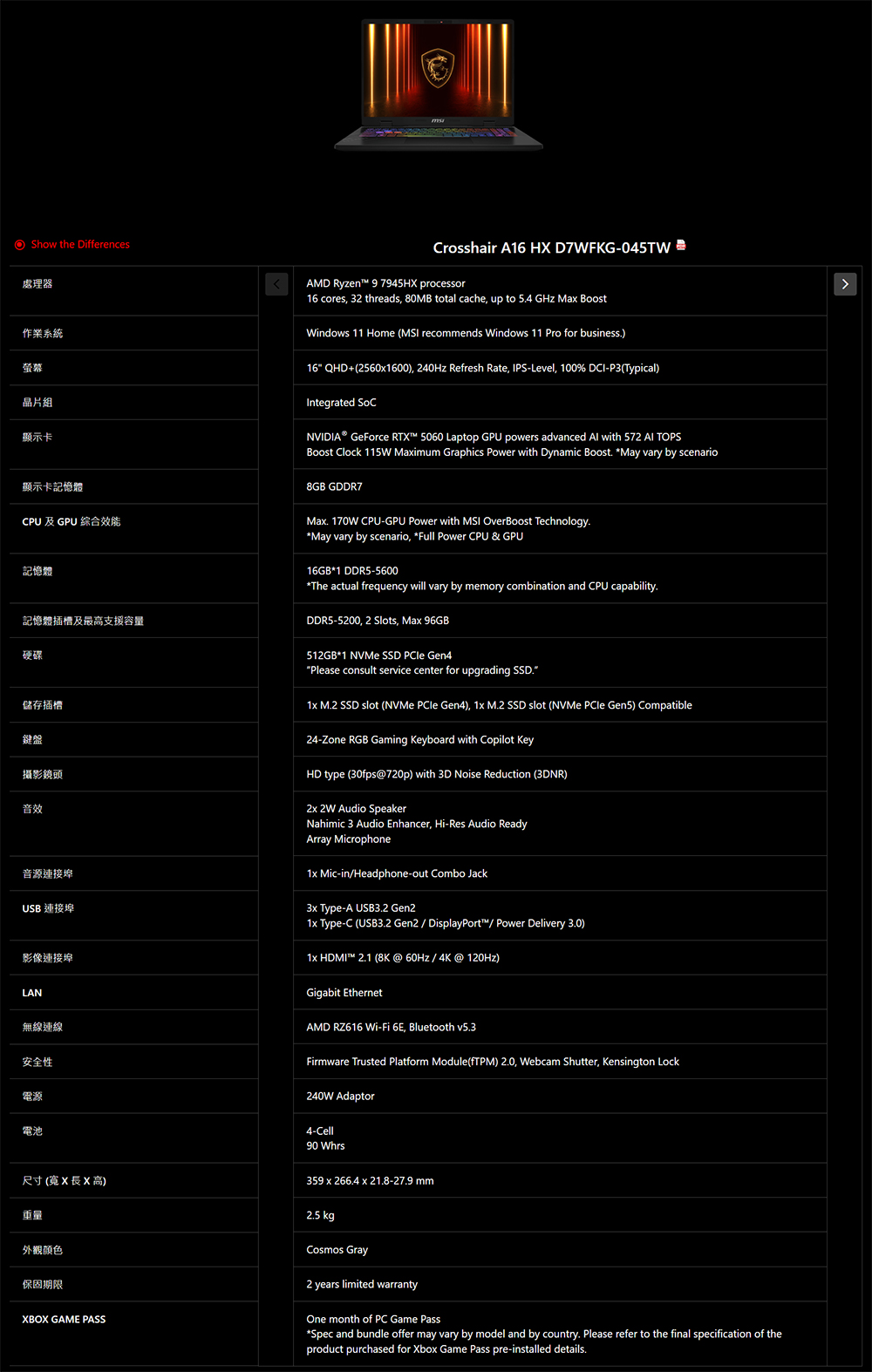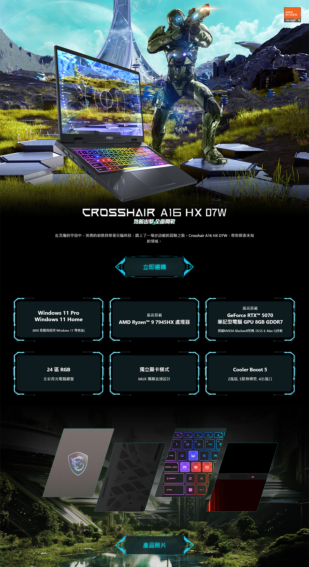 [MSI 微星]《Crosshair A16 HX-D7WFKG-045TW》16吋16:10/QHD+/240Hz/R9-7945HX/16G D5/512G PCIe/RTX5060-8G/RGB背光電競鍵盤/W11