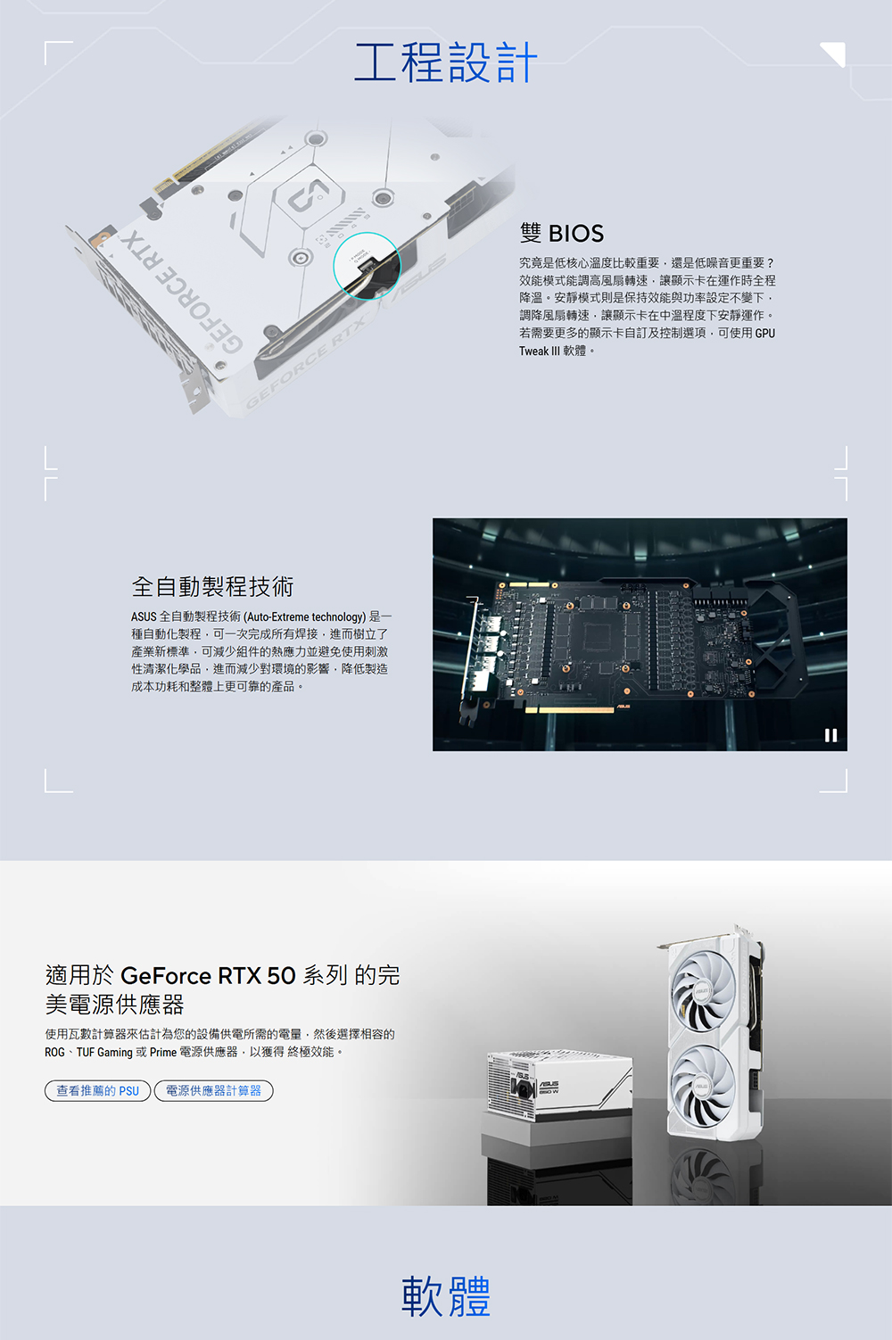 ASUS Dual GeForce RTX™ 5060 Ti White Edition 結合強大散熱效能與廣泛相容性。承襲旗艦顯示卡的先進散熱技術,包括兩個軸向式風扇,有效提升氣流導向散熱器。精心設計的 2.5-slot 緊湊外型,於有限空間中提供強大效能。這些升級使 ASUS Dual 成為追求高效圖形表現又想打造精巧主機的玩家理想選擇。
