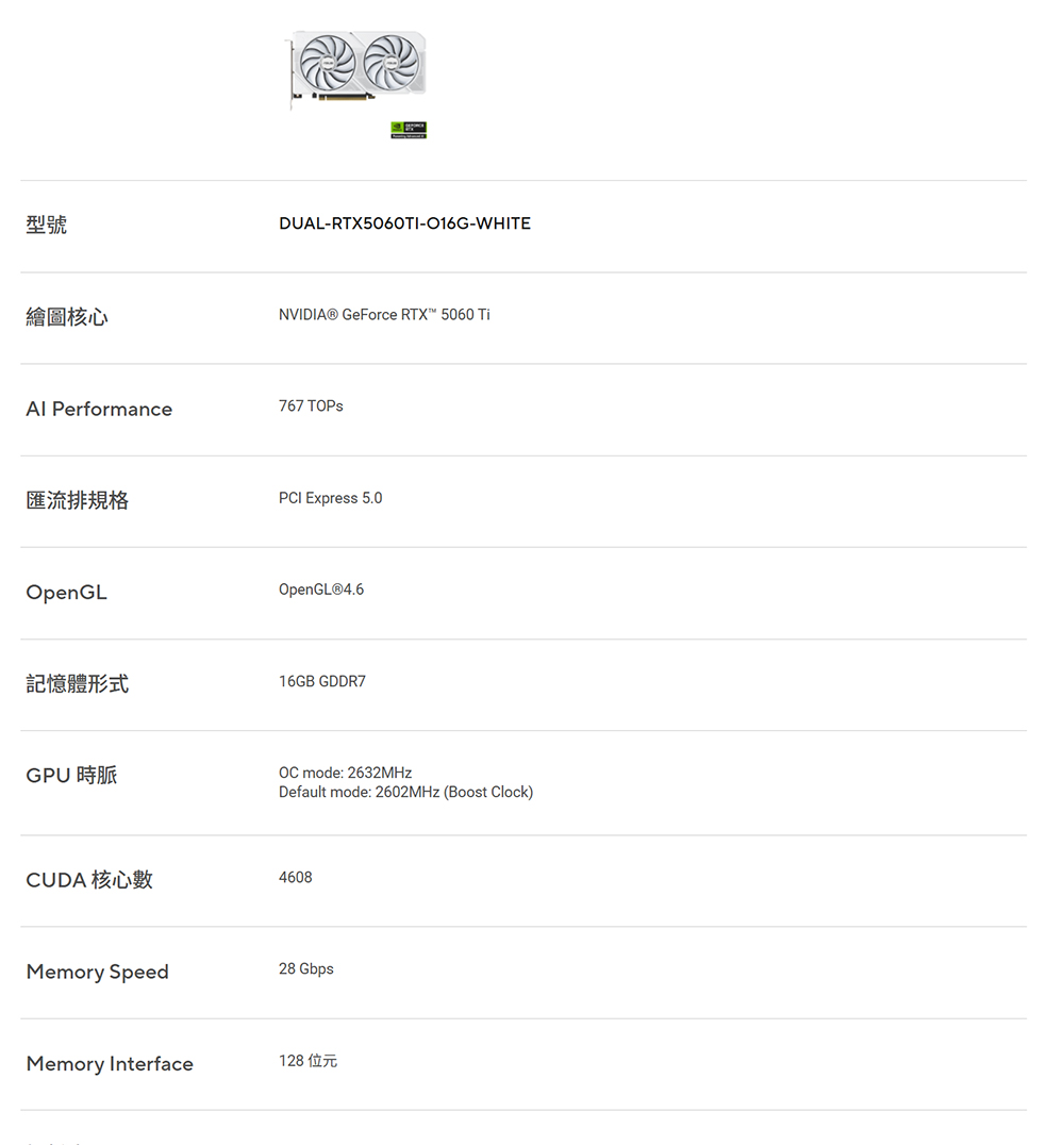 [ASUS華碩]《DUAL-RTX5060TI-O16G WHITE》白/2632MHz/23cm/雙風扇/註四年