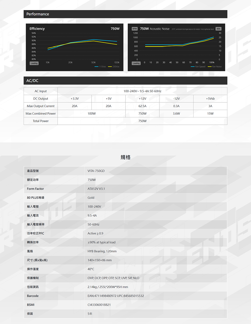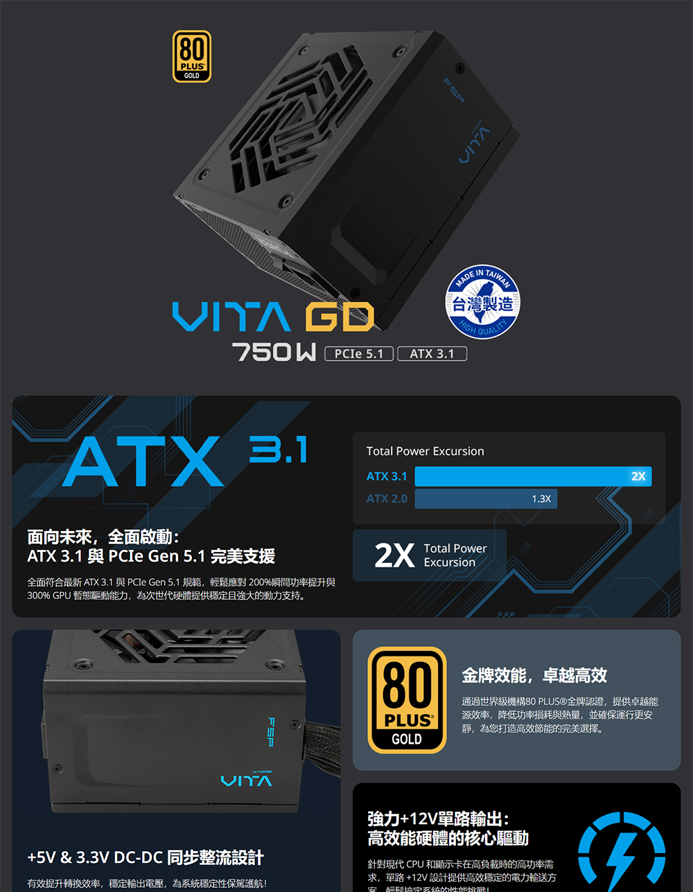 [FSP全漢]《VITA GD 750W》(MIT) 80+金牌/ATX3.1/PCIe 5.1/直出/主日系/五年保固