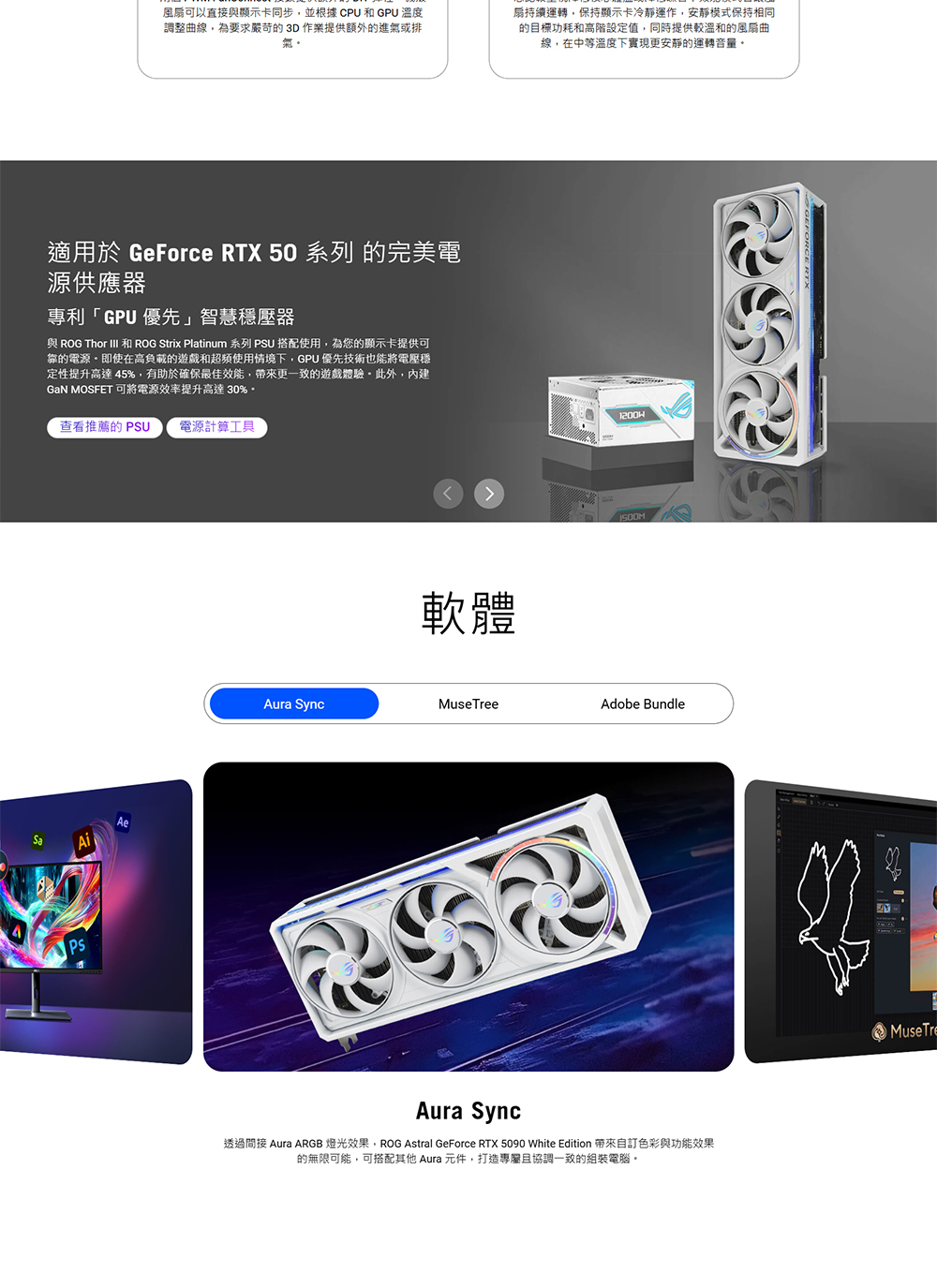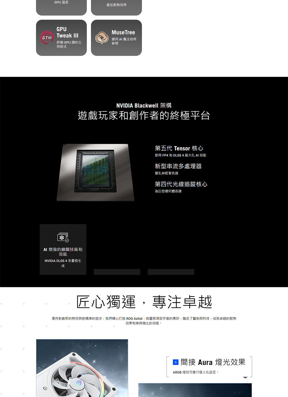 全新 ROG Astral 系列的靈感來自宇宙無限的廣闊和美麗,體現不斷探索和開拓前沿的創新理念。本著這項精神,ROG Astral GeForce RTX 5090 White Edition 為 ROG 首款四風扇顯示卡,並具備專利均溫熱導板、更高密度的散熱鰭片、相變 GPU 散熱片、極高的預設時脈速度、增強的功率輸出及更多特點。這些優質創新設計與吸睛的壓鑄框架及金屬 GPU 支架相得益彰,共同造就極致效能,甚至可因應最嚴苛的遊戲使用情境。