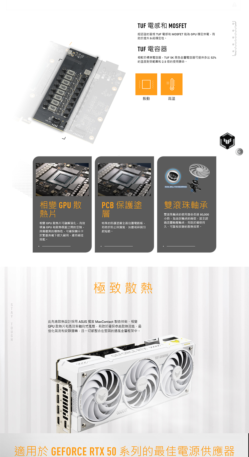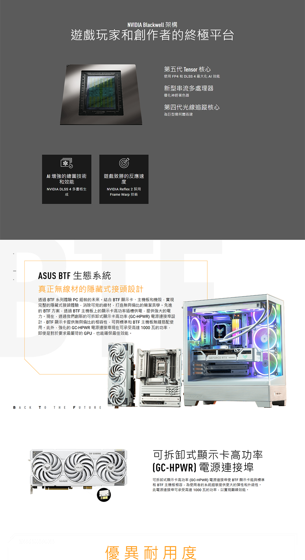 NVIDIA Blackwell 架構藉由更強的散熱和供電進化升級,並透過一系列堅固的增強功能加以鞏固,實現卓越的耐用性。TUF Gaming GeForce RTX™ 5070 Ti BTF White Edition 可承受最嚴苛的環境並提供無與倫比的效能,讓您有備而來,制霸全場。