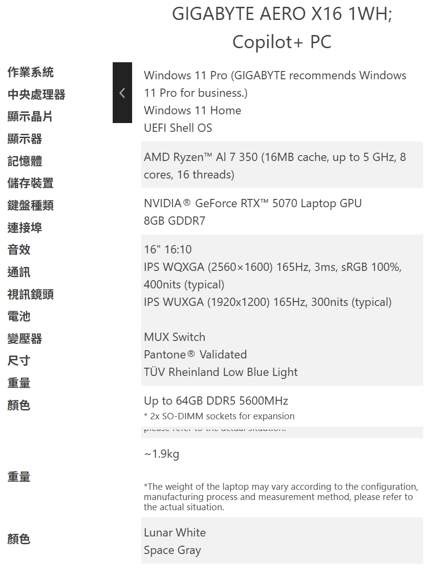 [技嘉]《AERO-X16-1WH93TWC64DH 幻月白》16吋 IPS WQXGA/165Hz/R7-350/32G D5/1TB PCIe/RTX5070-8G/Win11