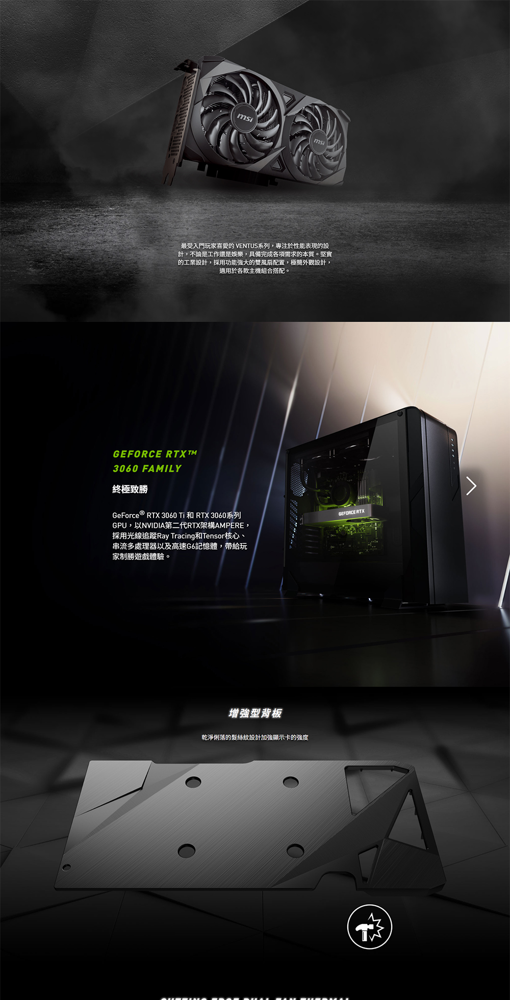 最受入門玩家喜愛的 VENTUS系列,專注於性能表現的設計,不論是工作還是娛樂,具備完成各項需求的本質。堅實的工業設計,採用功能強大的雙風扇配置,極簡外觀設計,適用於各款主機組合搭配。