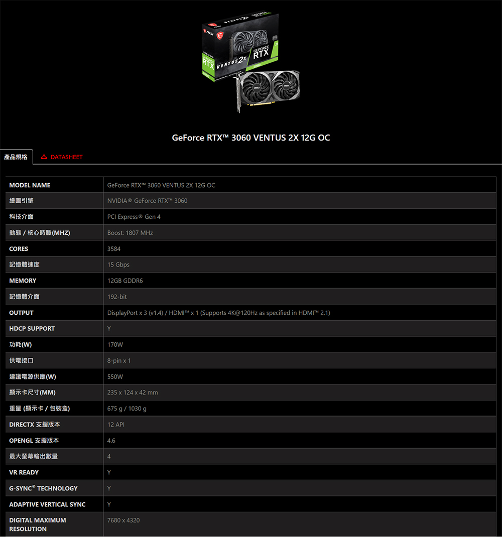 [MSI 微星]《RTX3060-VENTUS-2X-12G-OC》1807MHz/雙風扇/長23.5cm/三年保 9-18可以出貨