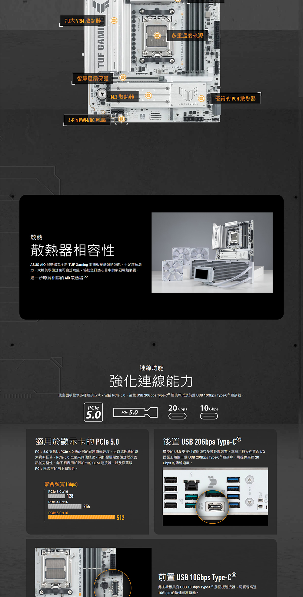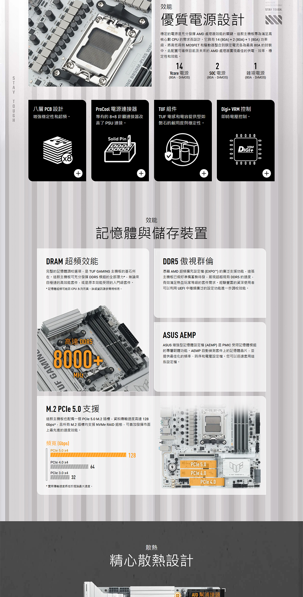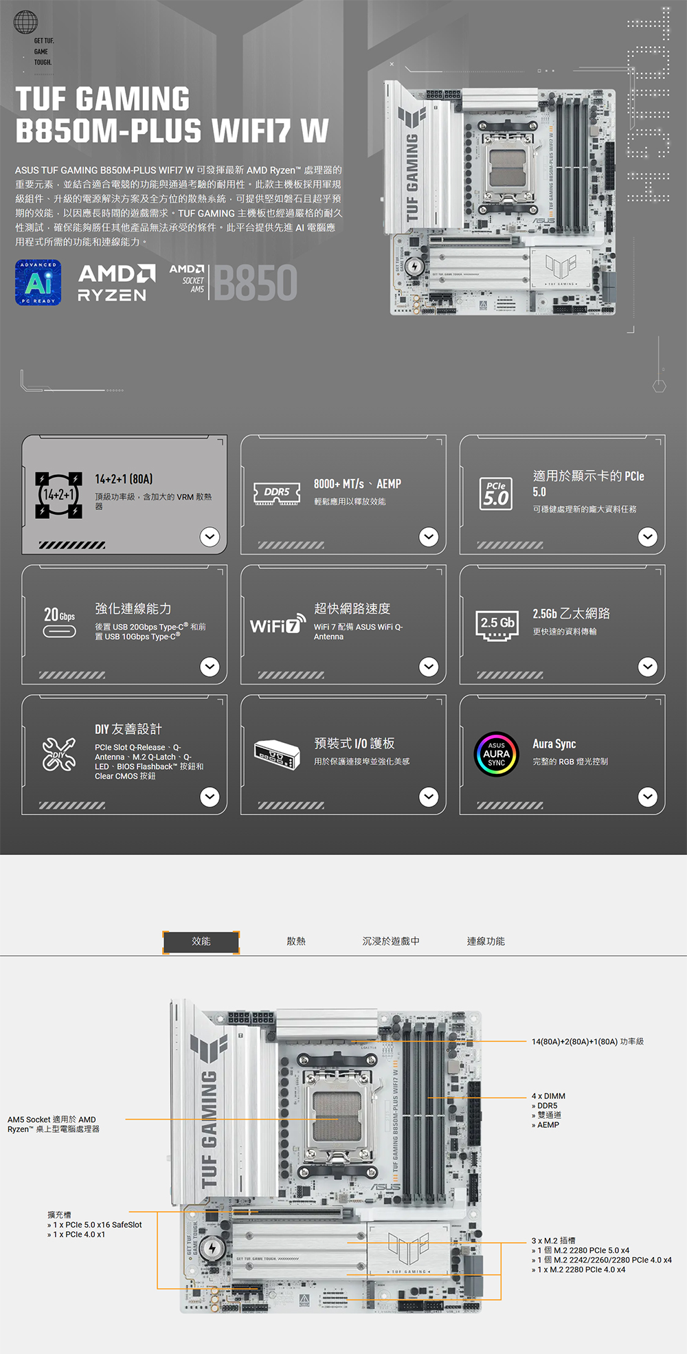 ASUS TUF GAMING B850M-PLUS WIFI7 W 可發揮最新 AMD Ryzen™ 處理器的重要元素,並結合適合電競的功能與通過考驗的耐用性。此款主機板採用軍規級組件、升級的電源解決方案及全方位的散熱系統,可提供堅如磐石且超乎預期的效能,以因應長時間的遊戲需求。TUF GAMING 主機板也經過嚴格的耐久性測試,確保能夠勝任其他產品無法承受的條件。此平台提供先進 AI 電腦應用程式所需的功能和連線能力。