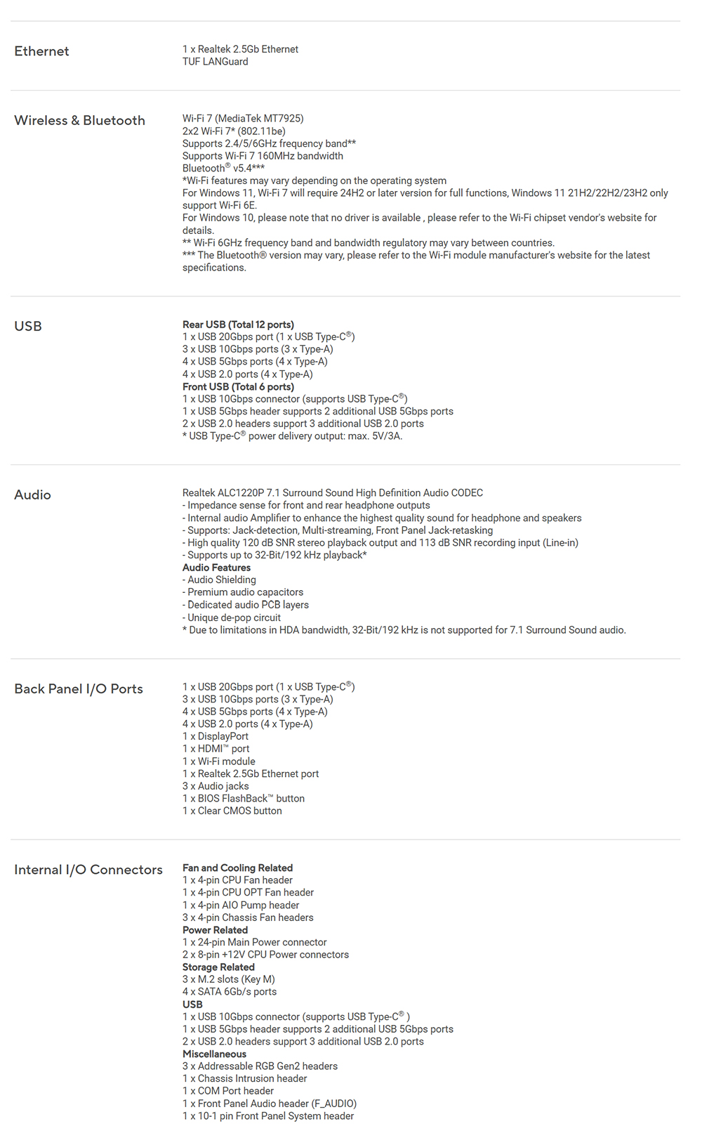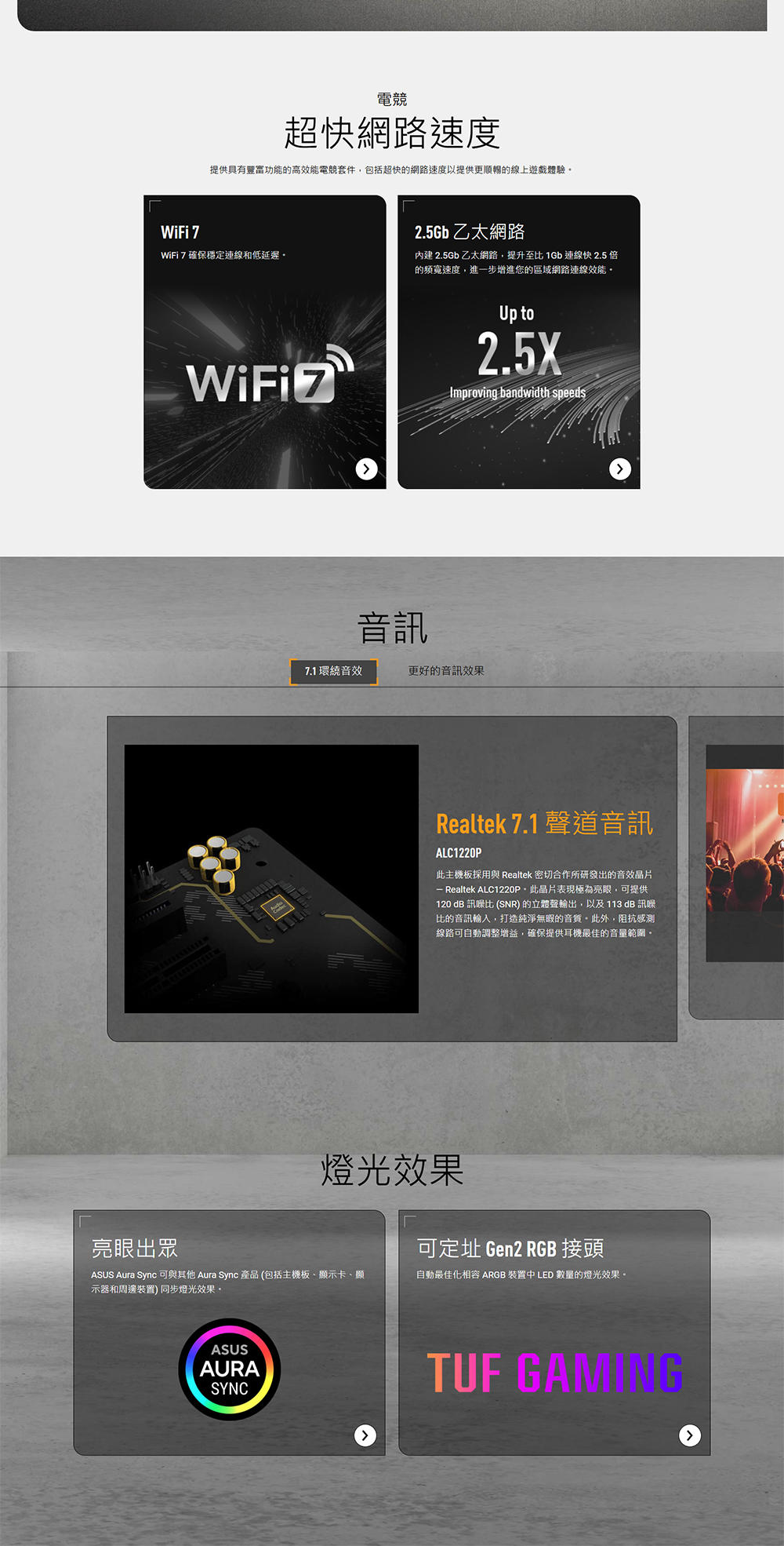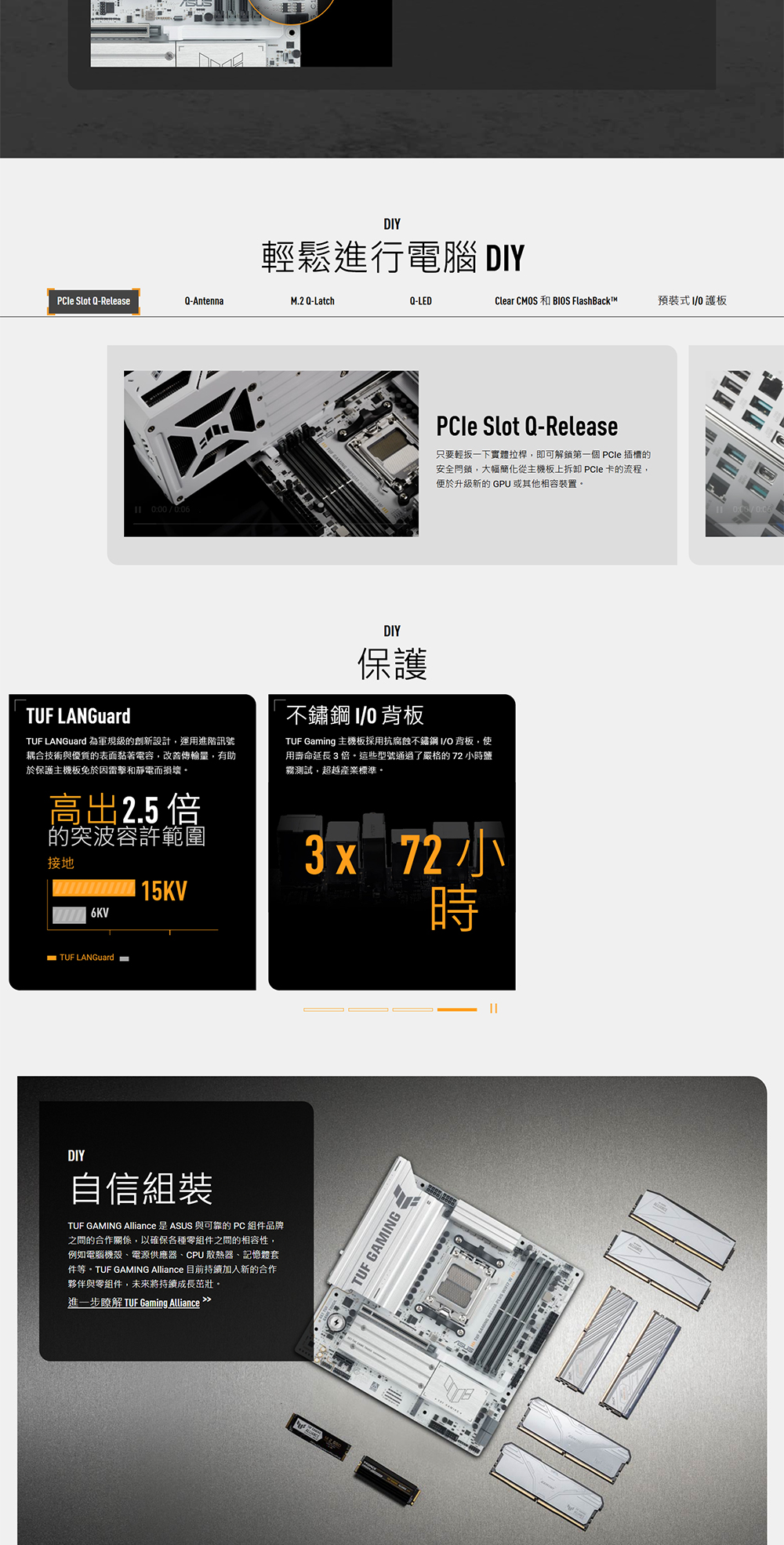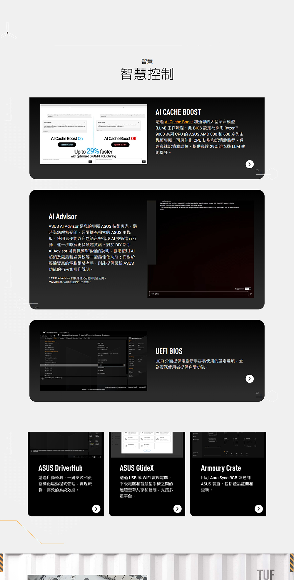 ASUS TUF GAMING B850M-PLUS WIFI7 W 可發揮最新 AMD Ryzen™ 處理器的重要元素,並結合適合電競的功能與通過考驗的耐用性。此款主機板採用軍規級組件、升級的電源解決方案及全方位的散熱系統,可提供堅如磐石且超乎預期的效能,以因應長時間的遊戲需求。TUF GAMING 主機板也經過嚴格的耐久性測試,確保能夠勝任其他產品無法承受的條件。此平台提供先進 AI 電腦應用程式所需的功能和連線能力。