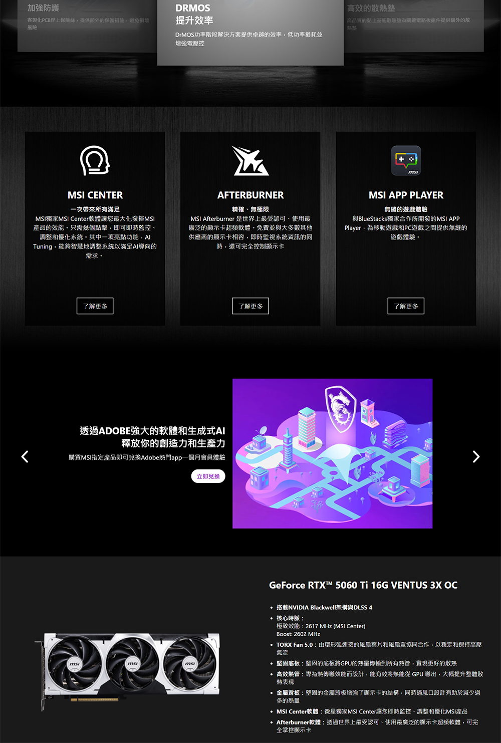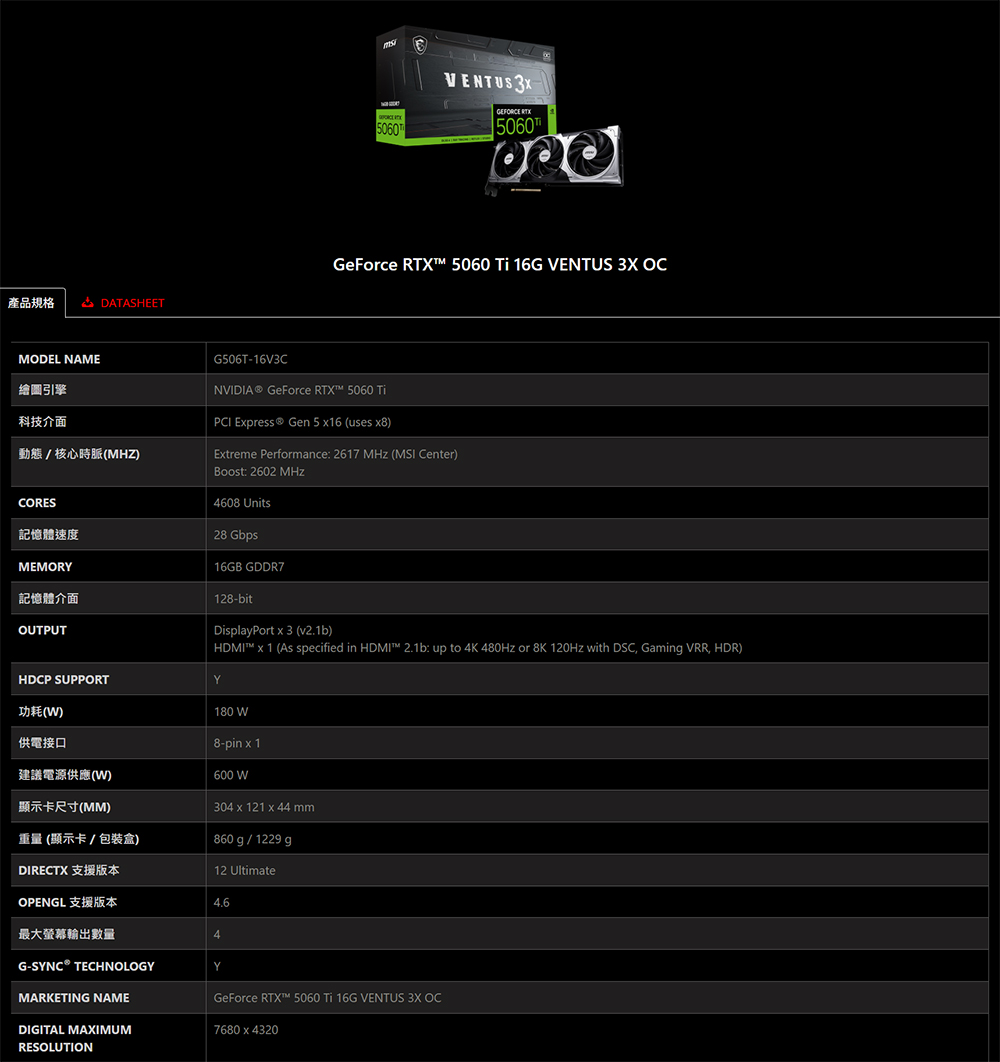 [MSI 微星]《RTX5060TI-16G-VENTUS-3X-OC》2617MHz/31cm/三風扇/註五年