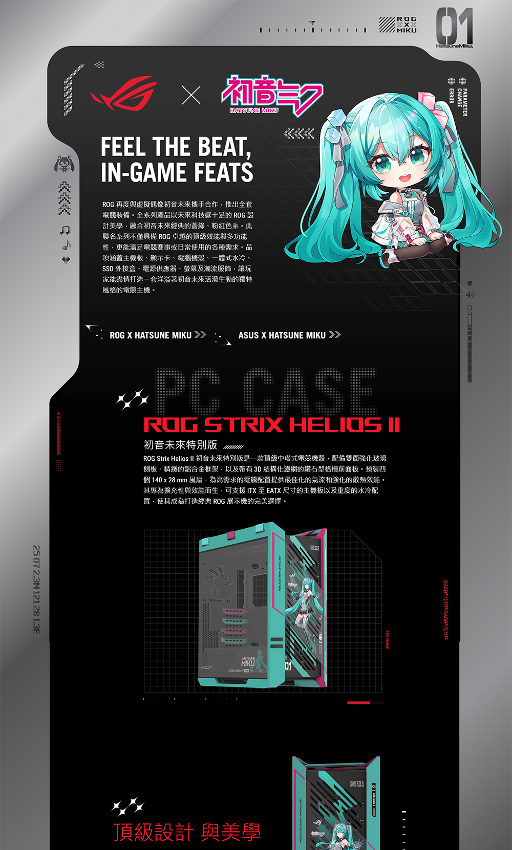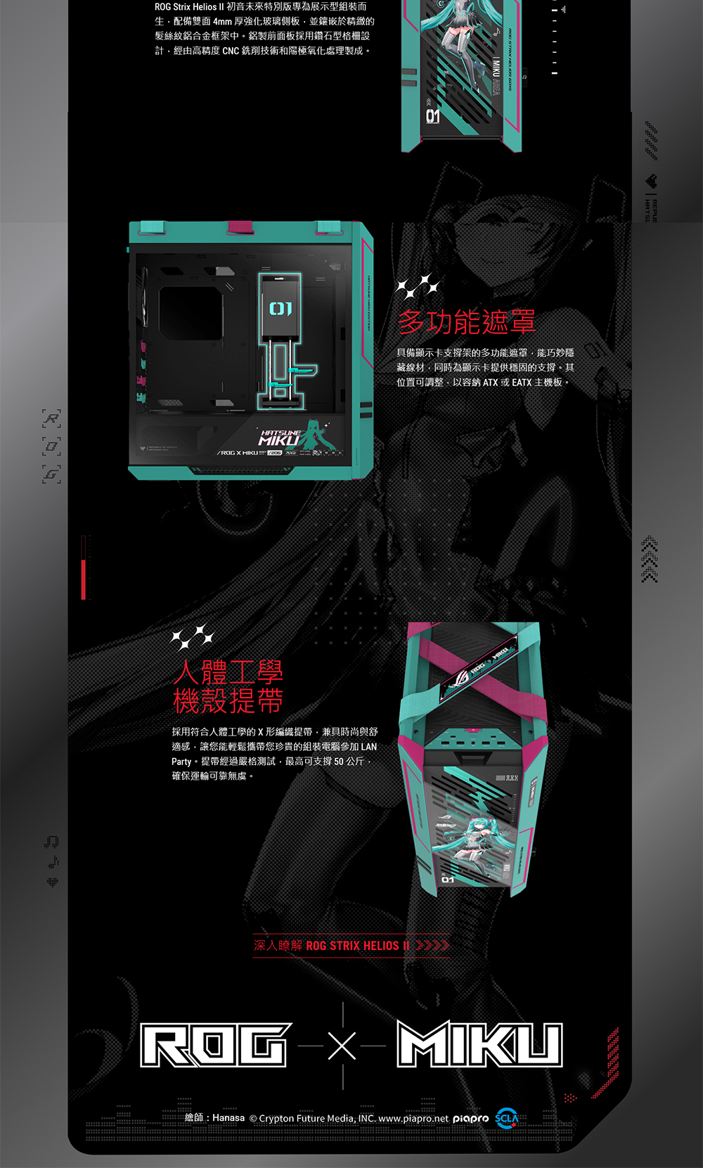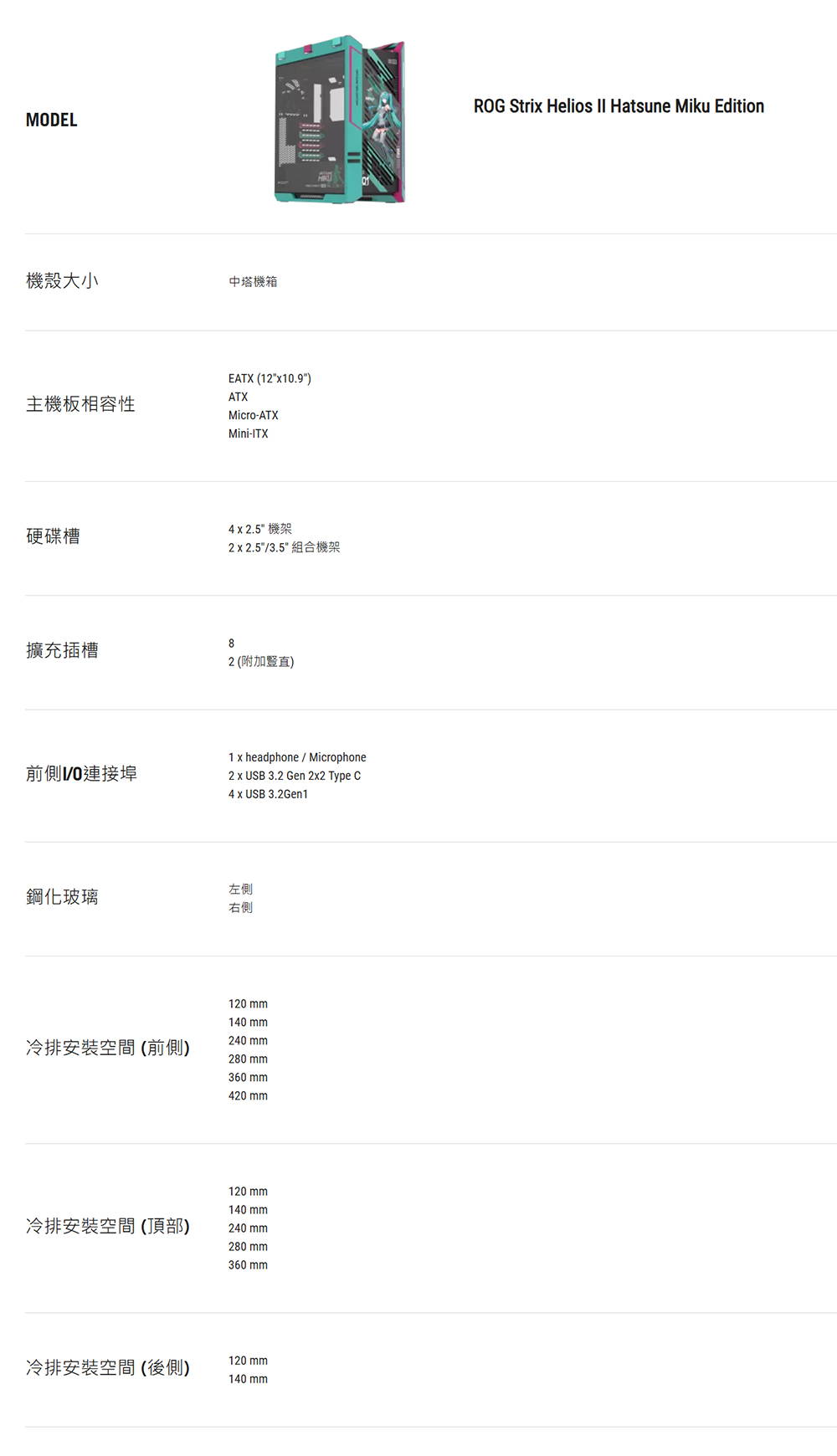 ROG Strix Helios II Hatsune Miku 版 EATX 中塔式機殼,搭載玻璃面板與鋁合金框架,支援最長 450mm 的顯示卡、420mm 的散熱器,以及顯示卡支撐架。