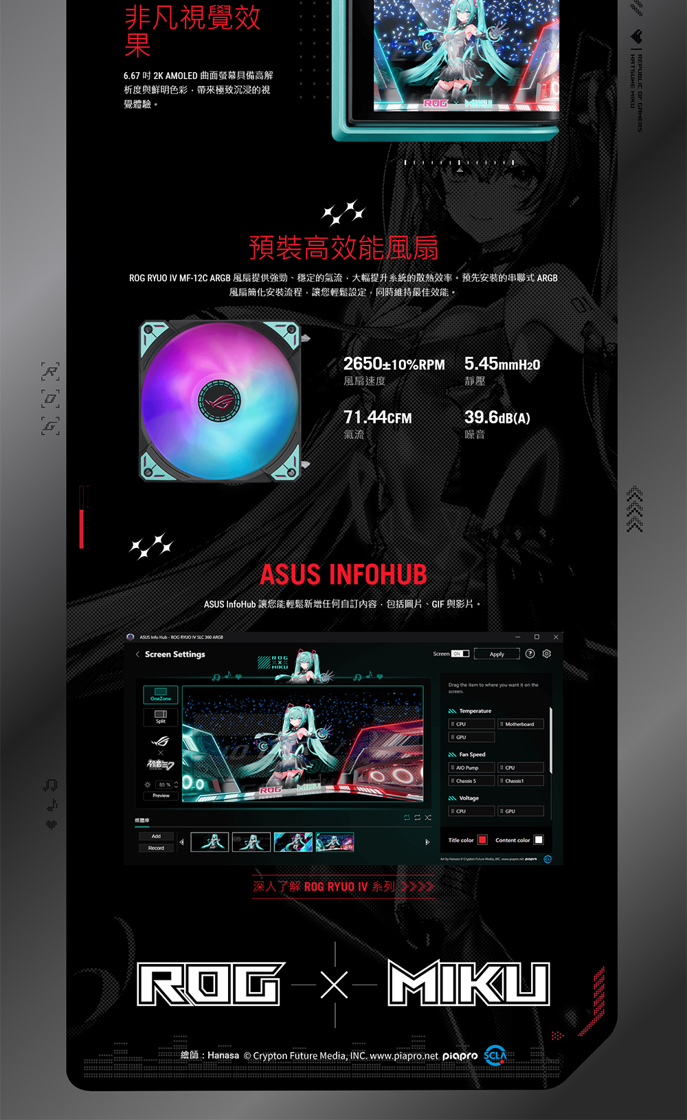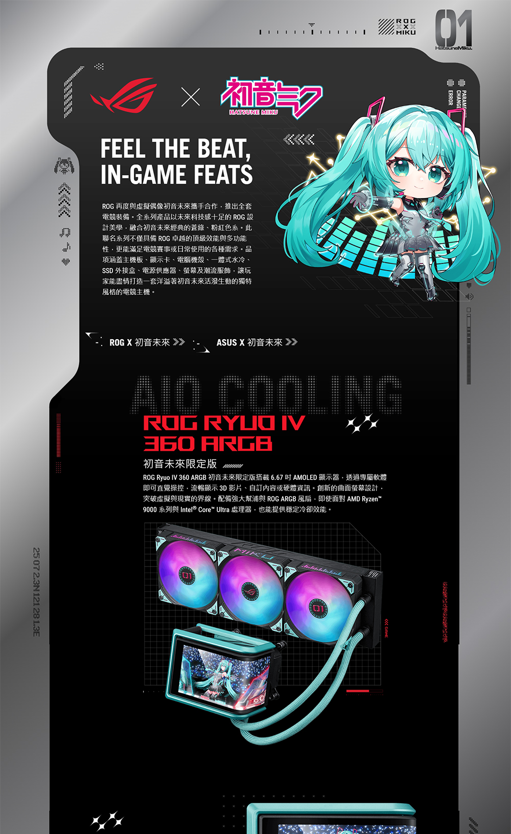 ROG RYUO IV 360 ARGB Hatsune Miku Edition 搭載可移動曲面 6.67 吋 AMOLED 螢幕,支援裸視影片播放或自訂系統資訊顯示,另配備預裝的串聯式 ARGB 風扇,具備前側與側邊燈效。