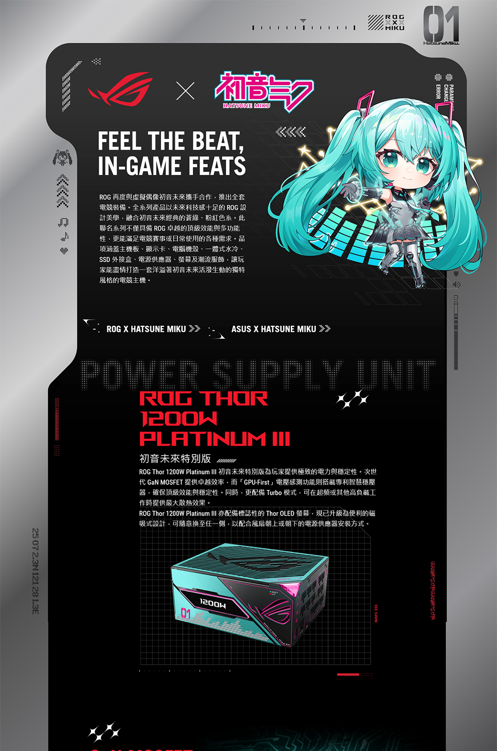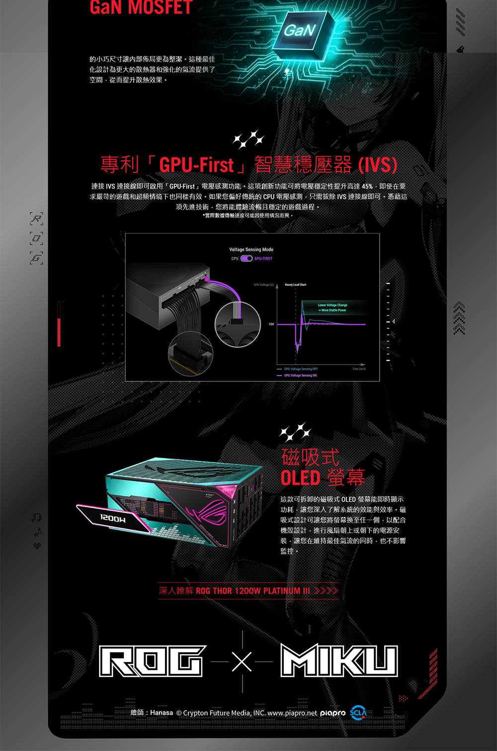 ROG Thor III 1200W 白金牌 Hatsune Miku Edition 搭載 GaN MOSFET、「GPU-First」專利智慧穩壓器和磁吸式 OLED 顯示螢幕,為您的頂級電腦組裝提供無與倫比的效能和堅若磐石的穩定性。
