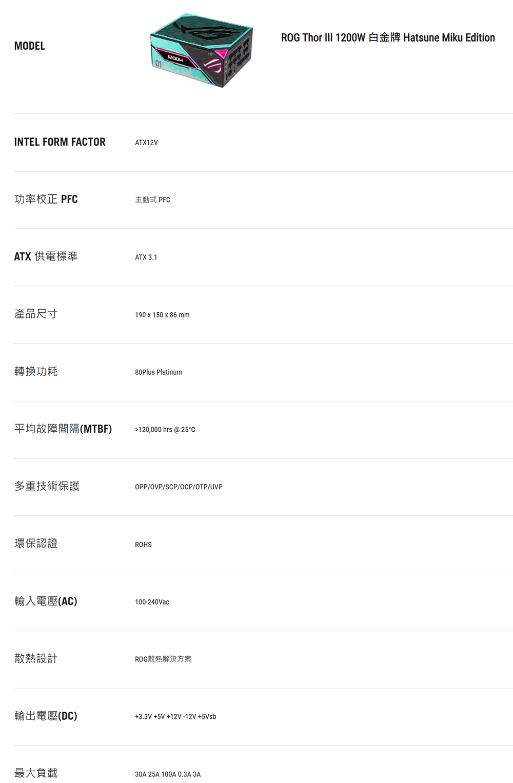 [ASUS華碩]《ROG Thor III 1200W Platinum Hatsune Miku Edition》雙8/白金/全模組/OLED監控/ATX3.1(PCIe 5.1)/10年保【限初音系列全套購買(主機板/顯示卡/機殼/水冷/電供),不單售】