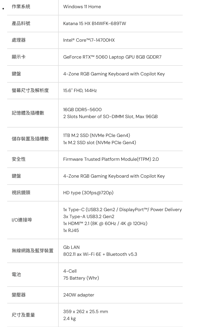 [MSI 微星]《Katana 15 HX B14WFK-689TW》15.6吋FHD/144Hz/i7-14700HX/16G D5/1TB PCIe/RTX5060 8G/Win11