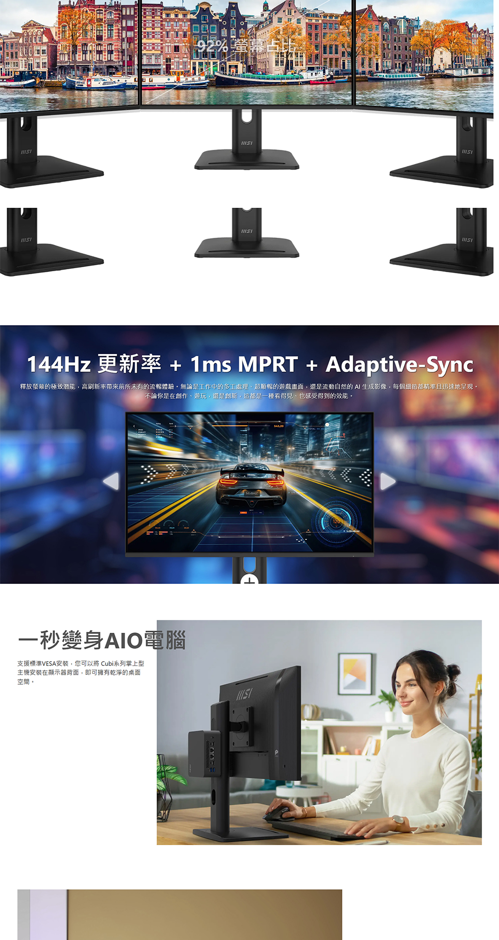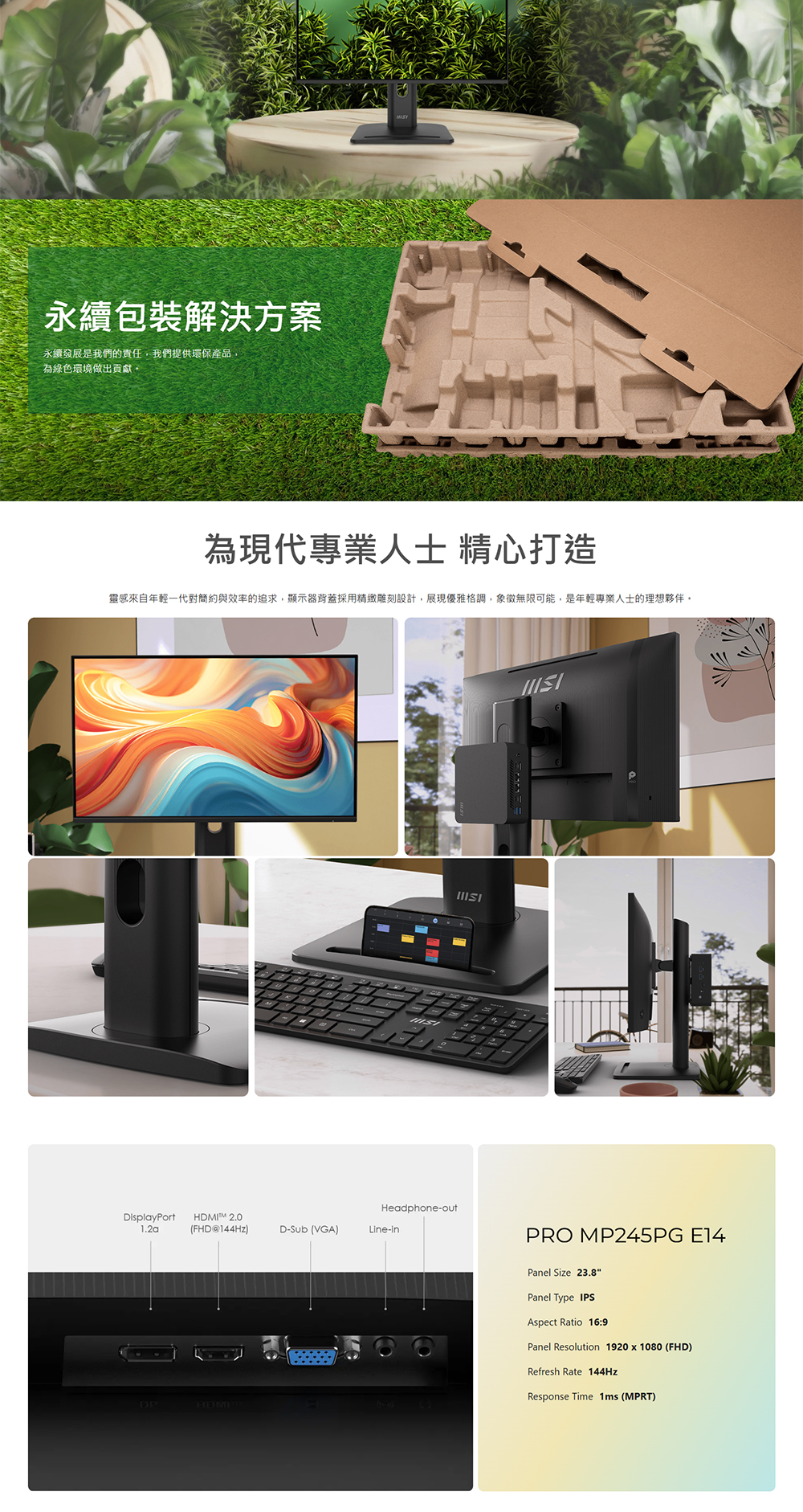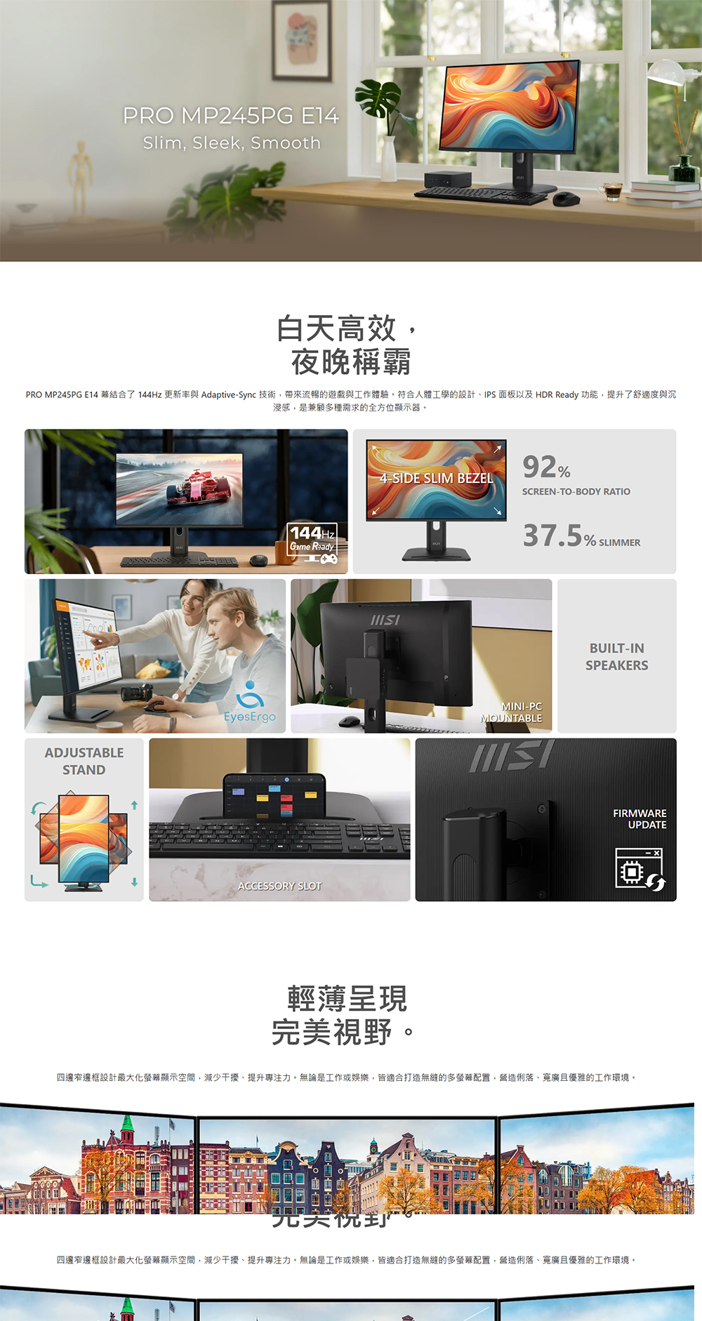 PRO MP245PG E14 幕結合了 144Hz 更新率與 Adaptive-Sync 技術,帶來流暢的遊戲與工作體驗。符合人體工學的設計、IPS 面板以及 HDR Ready 功能,提升了舒適度與沉浸感,是兼顧多種需求的全方位顯示器。